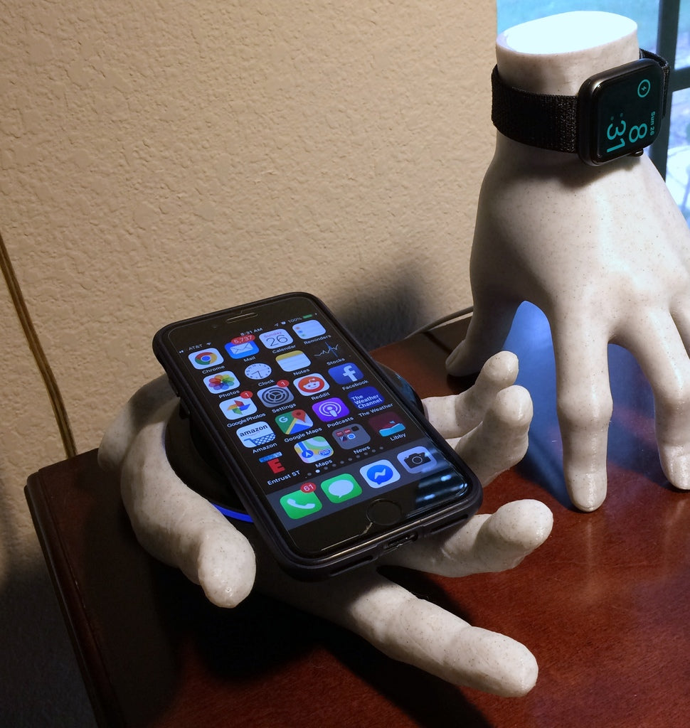 Hay espacio para un cargador inalámbrico dentro de la propia mano. La muesca está hecha para que se ajuste a un ópalo inalámbrico que tiene la forma de un círculo con un diámetro máximo de 94 mm.