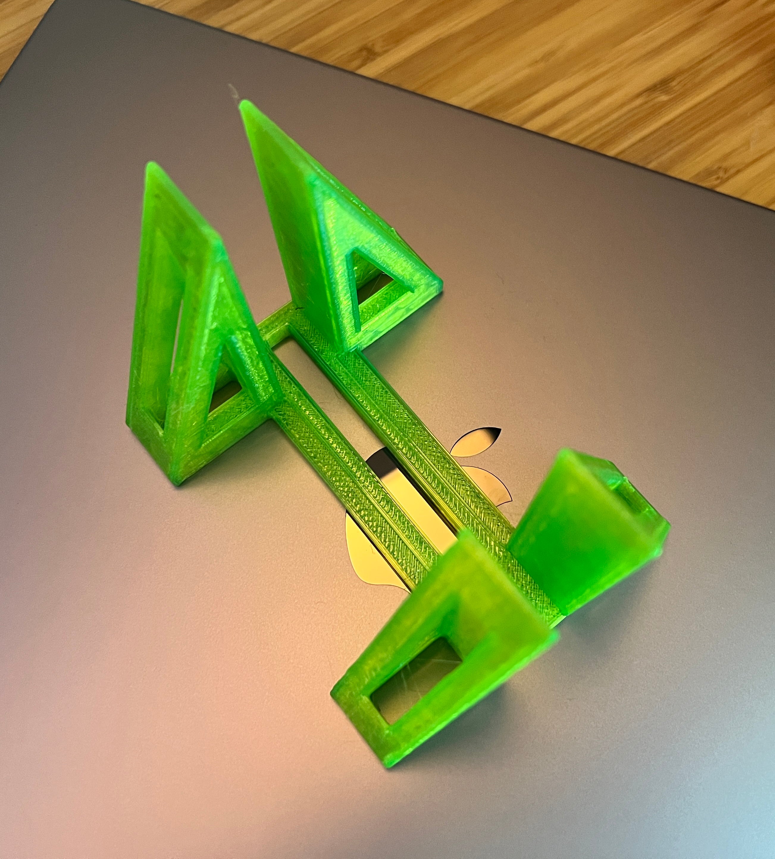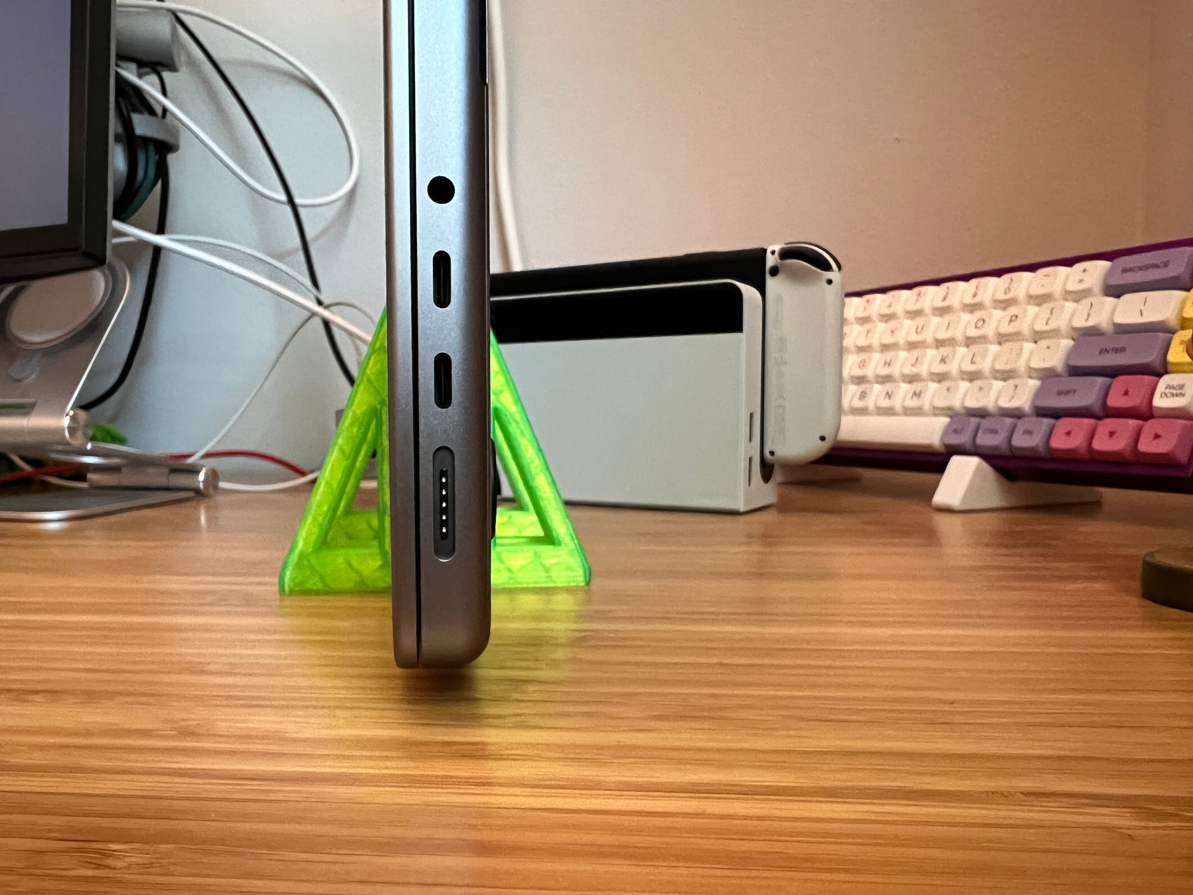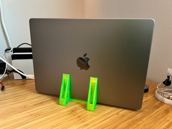 Este es un soporte vertical para un Macbook Pro de 14'. Su diseño delgado le permite colocar su Macbook verticalmente, lo que puede ahorrar espacio en su escritorio. Está hecho con filamento en Prusament Petg verde claro, añadiendo un bonito toque visual a su configuración.
