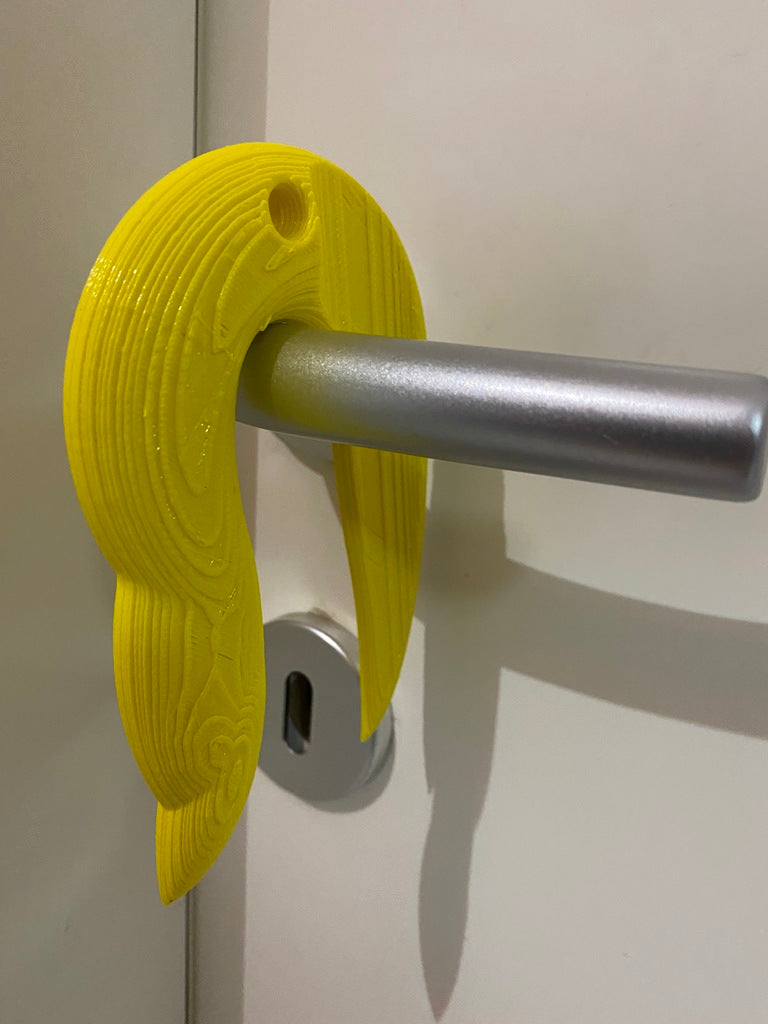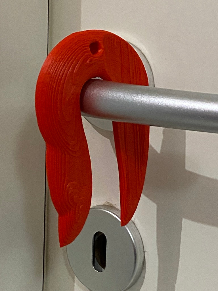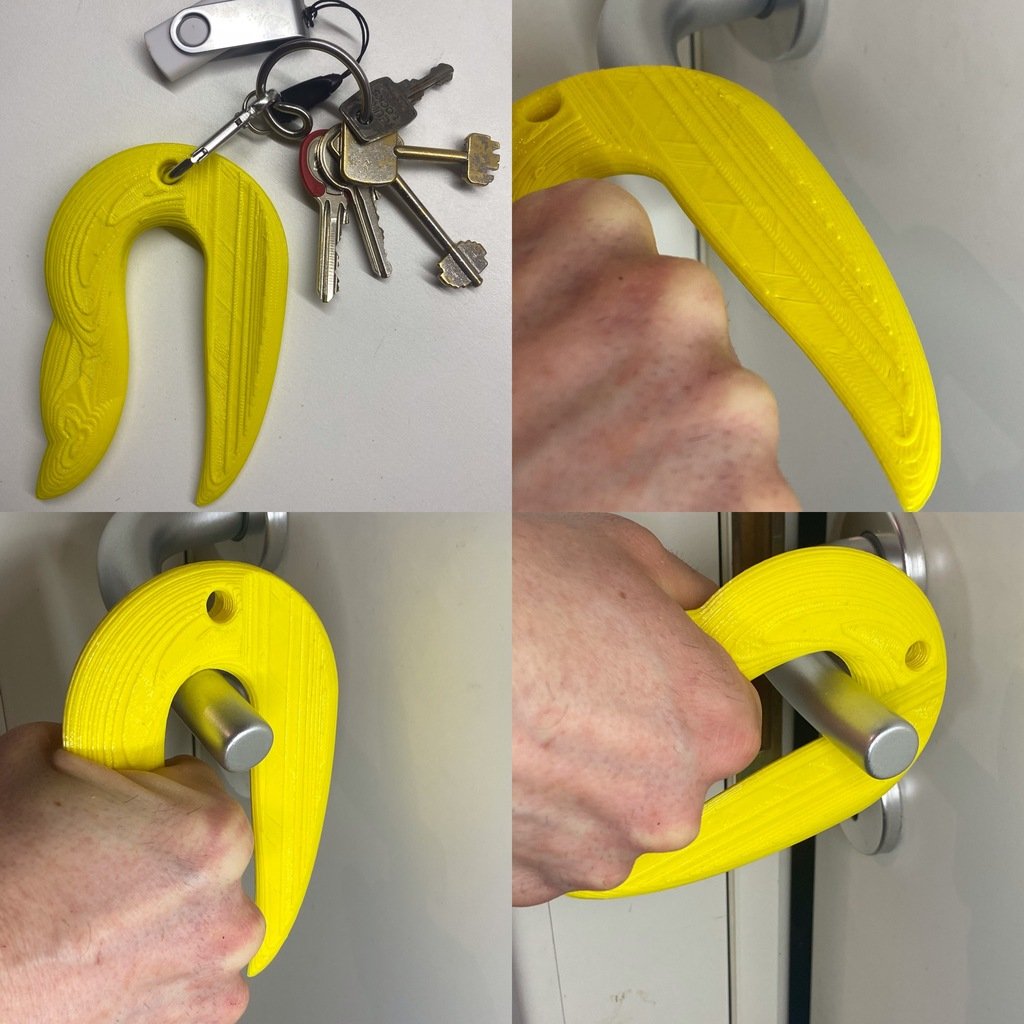 Este es el agarrador de sierras Toucan, un llavero que puede utilizar para abrir puertas sin tocar las manillas. Es apto tanto para diestros como para zurdos. Vea cómo se usa en estos vídeos: