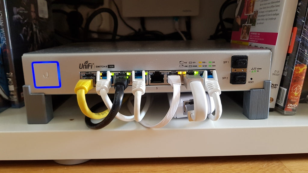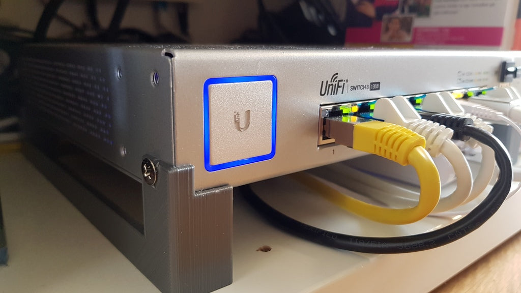 Soporte para Ubiquiti UniFi Switch 8 150w. Este se monta en el interruptor con uno de los tornillos que venían con el interruptor. Hay espacio debajo para colocar la UniFi Cloud Key.