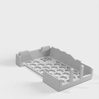 Una carcasa para Raspberry Pi 5 con los pines GPIO expuestos y agujeros hexagonales para mejorar las propiedades de refrigeración. Si tienes un disco de refrigeración y un ventilador oficial similar al de la imagen, te irá mejor con 'Pins-Top-Hexed-With-Logo-HeatSink-Cutoff.stl'.