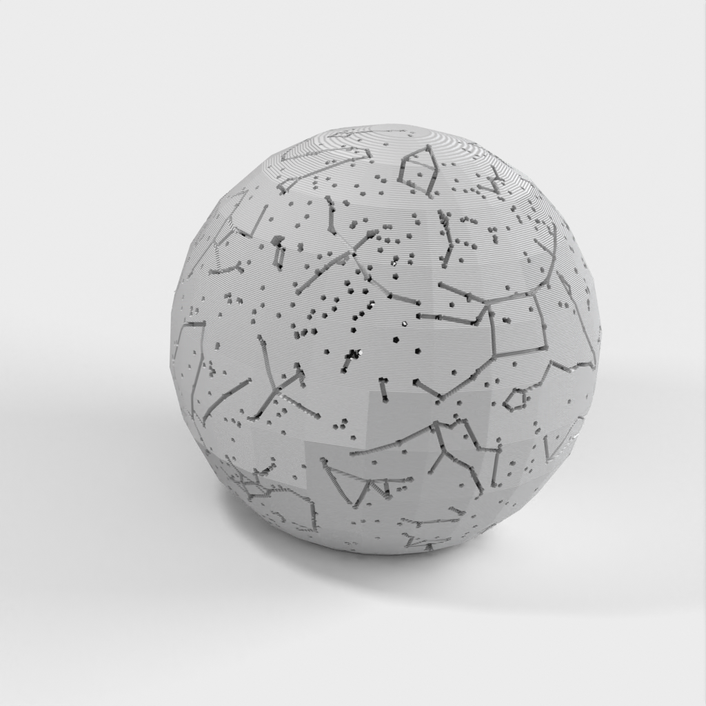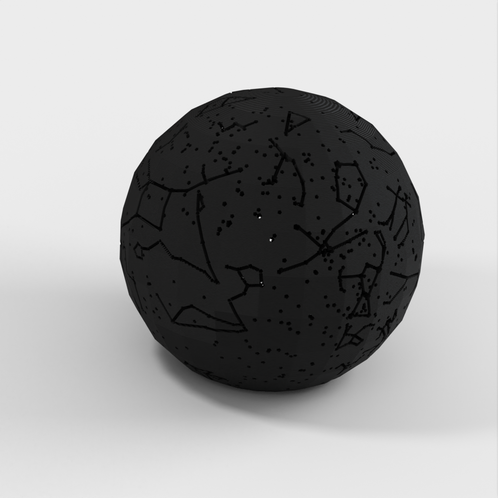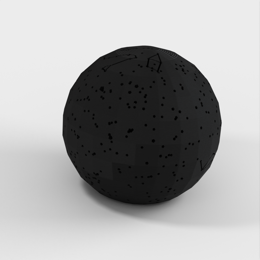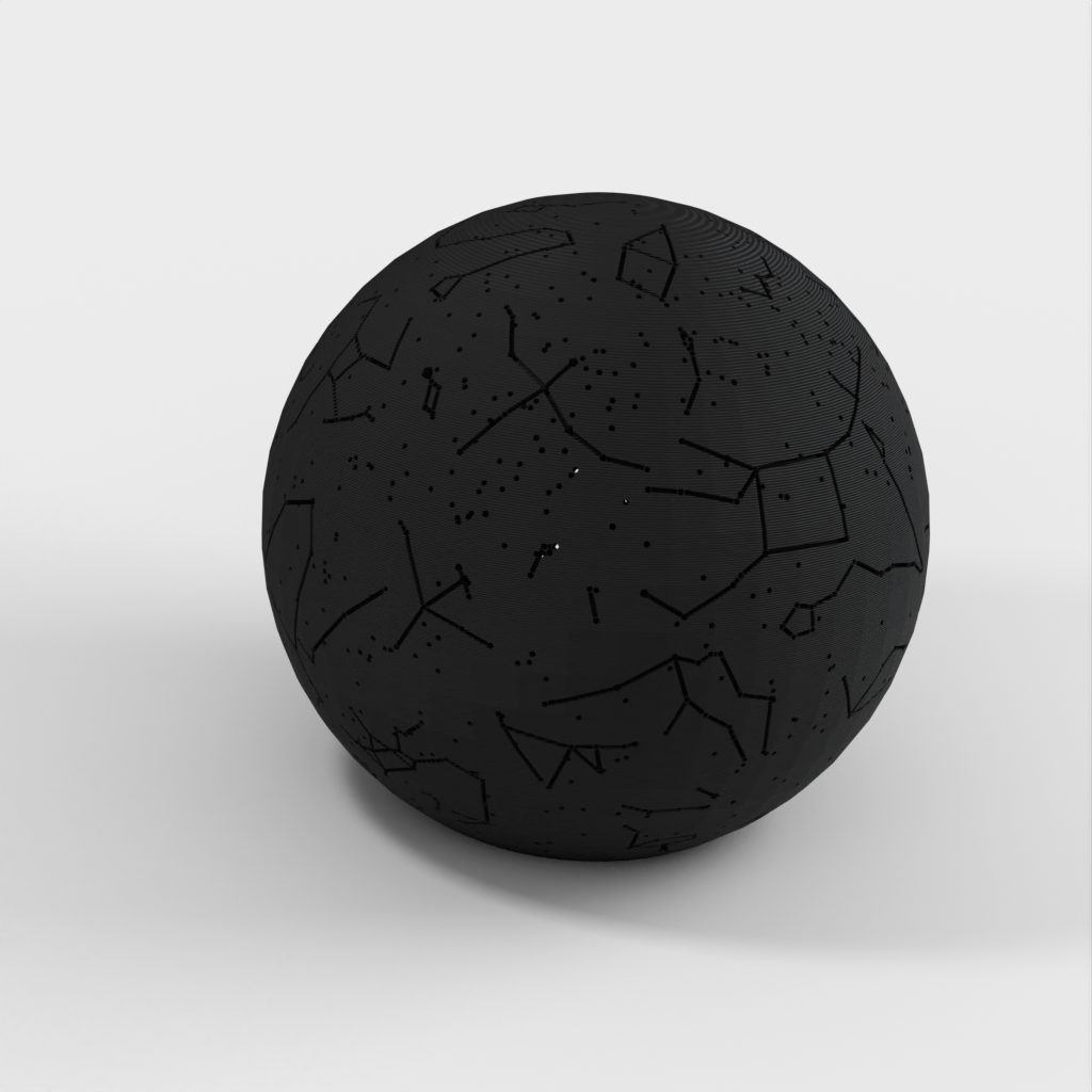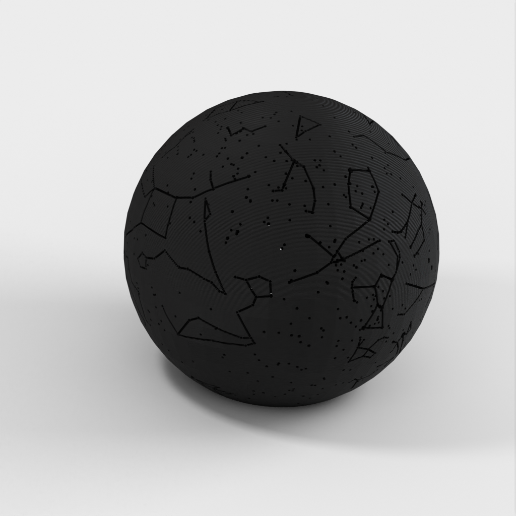 Este producto es una extensión de los modelos de la Esfera Celeste y puede generar archivos STL para una esfera celeste. Con Openscad, puede cambiar muchos parámetros y producir un modelo 3D de la esfera celeste, que puede incluir más de 1700 de las estrellas más brillantes y hasta 50 constelaciones. El modelo también incluye planos para una montura de tipo ecuatorial, completa con suministro para iluminación LED en el interior de la esfera.