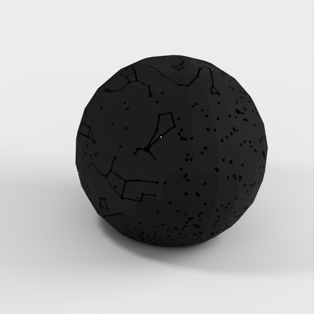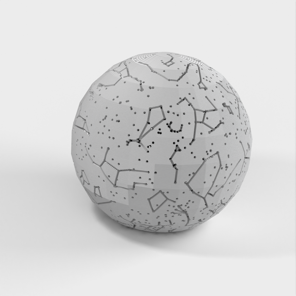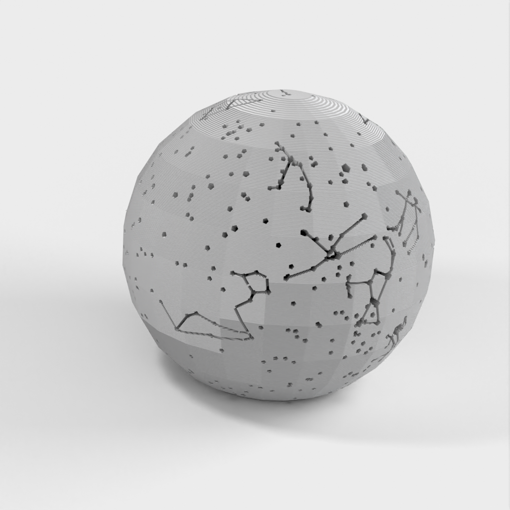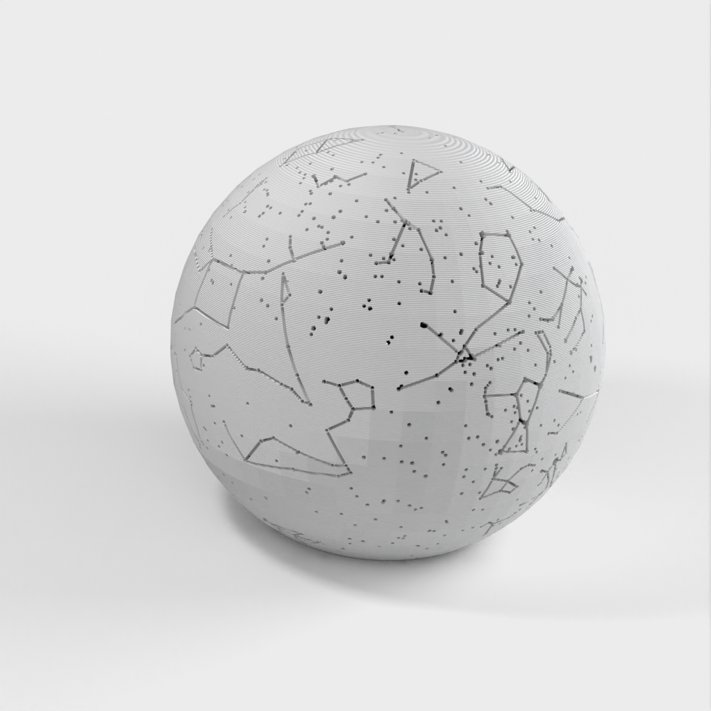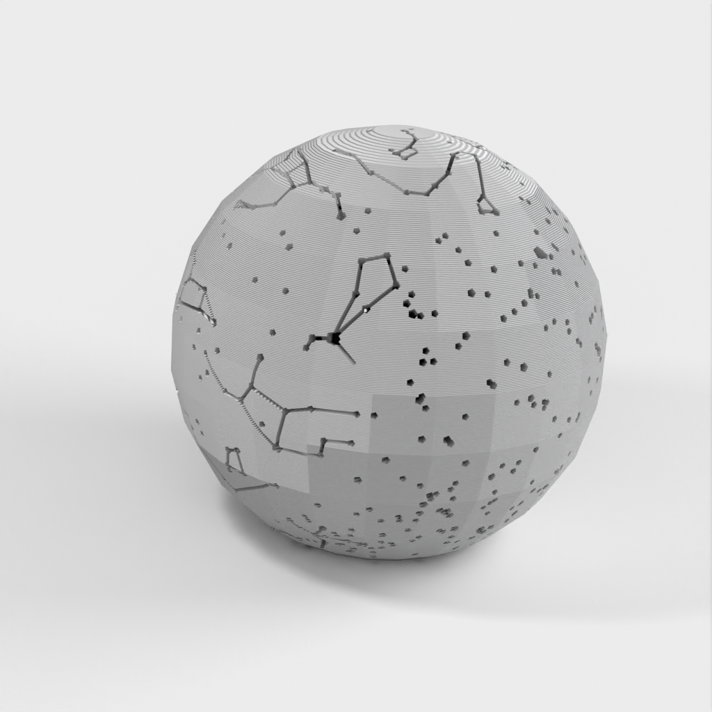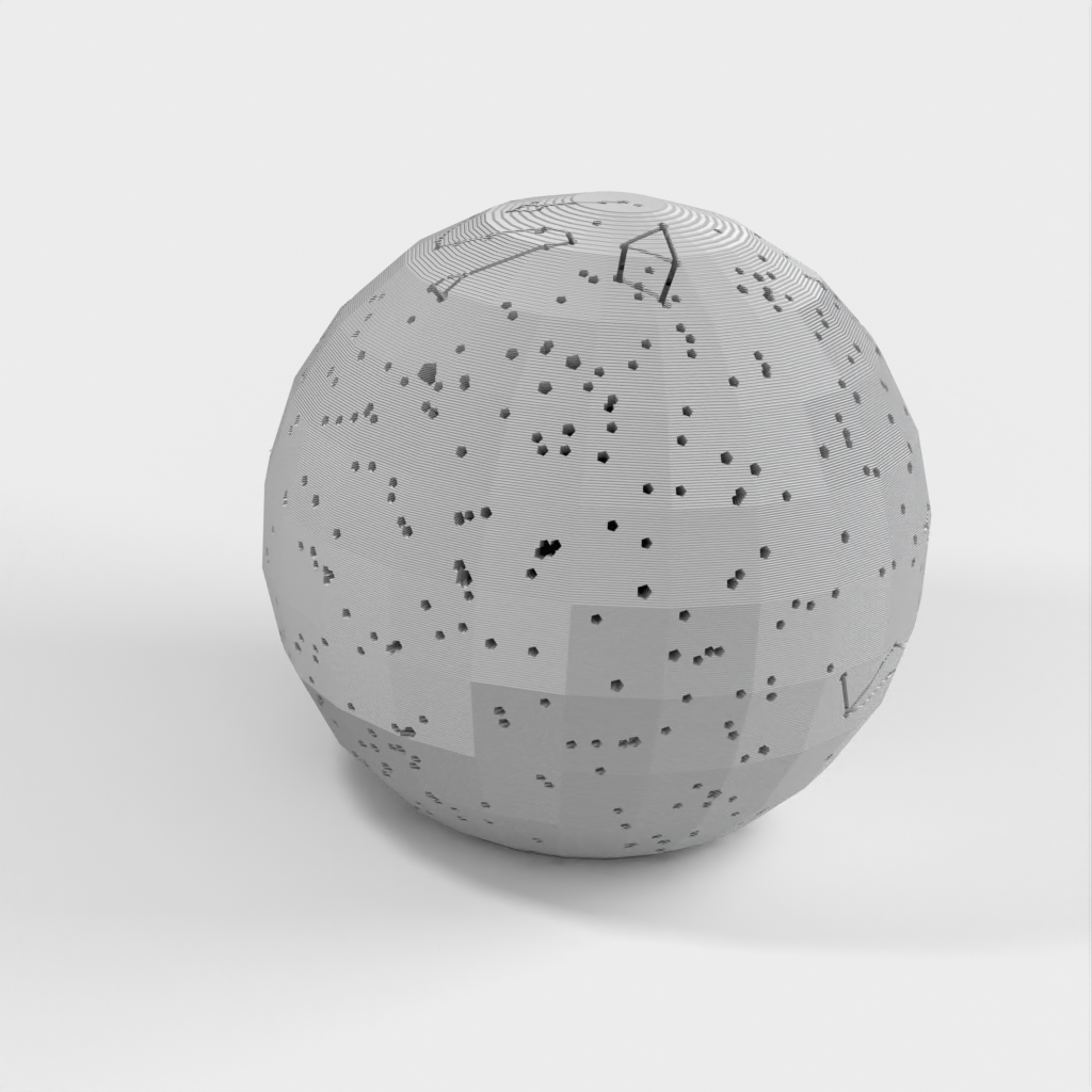 Este producto es una extensión de los modelos de la Esfera Celeste y puede generar archivos STL para una esfera celeste. Con Openscad, puede cambiar muchos parámetros y producir un modelo 3D de la esfera celeste, que puede incluir más de 1700 de las estrellas más brillantes y hasta 50 constelaciones. El modelo también incluye planos para una montura de tipo ecuatorial, completa con suministro para iluminación LED en el interior de la esfera.