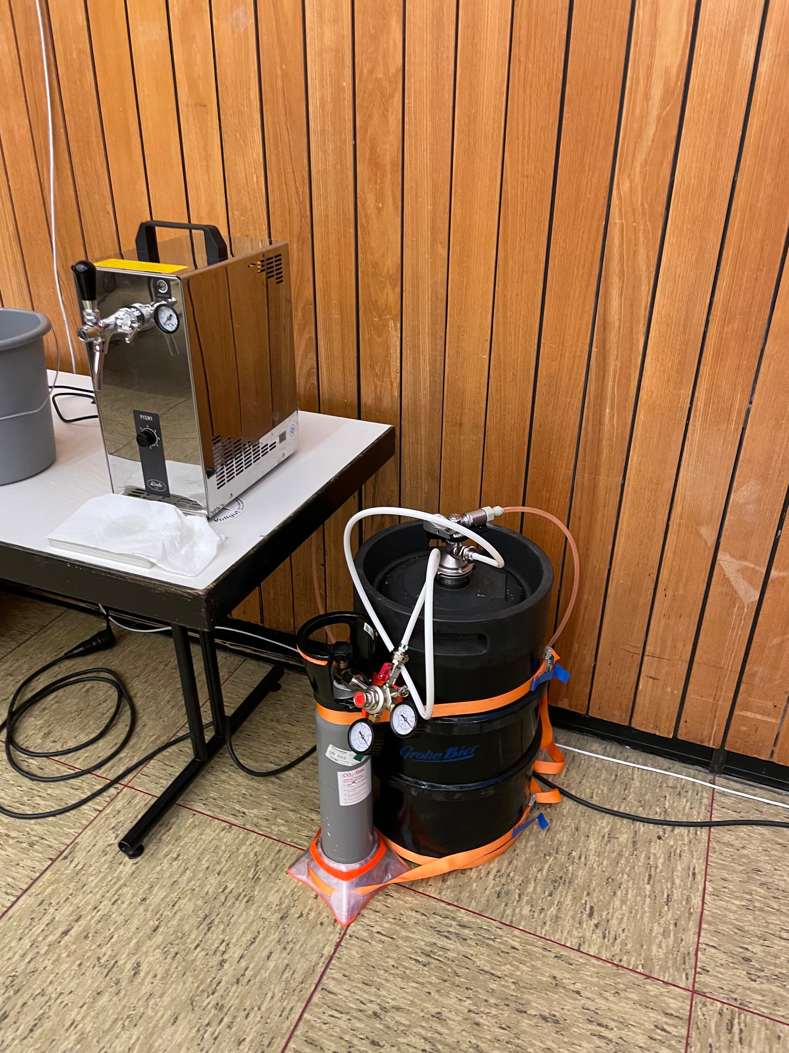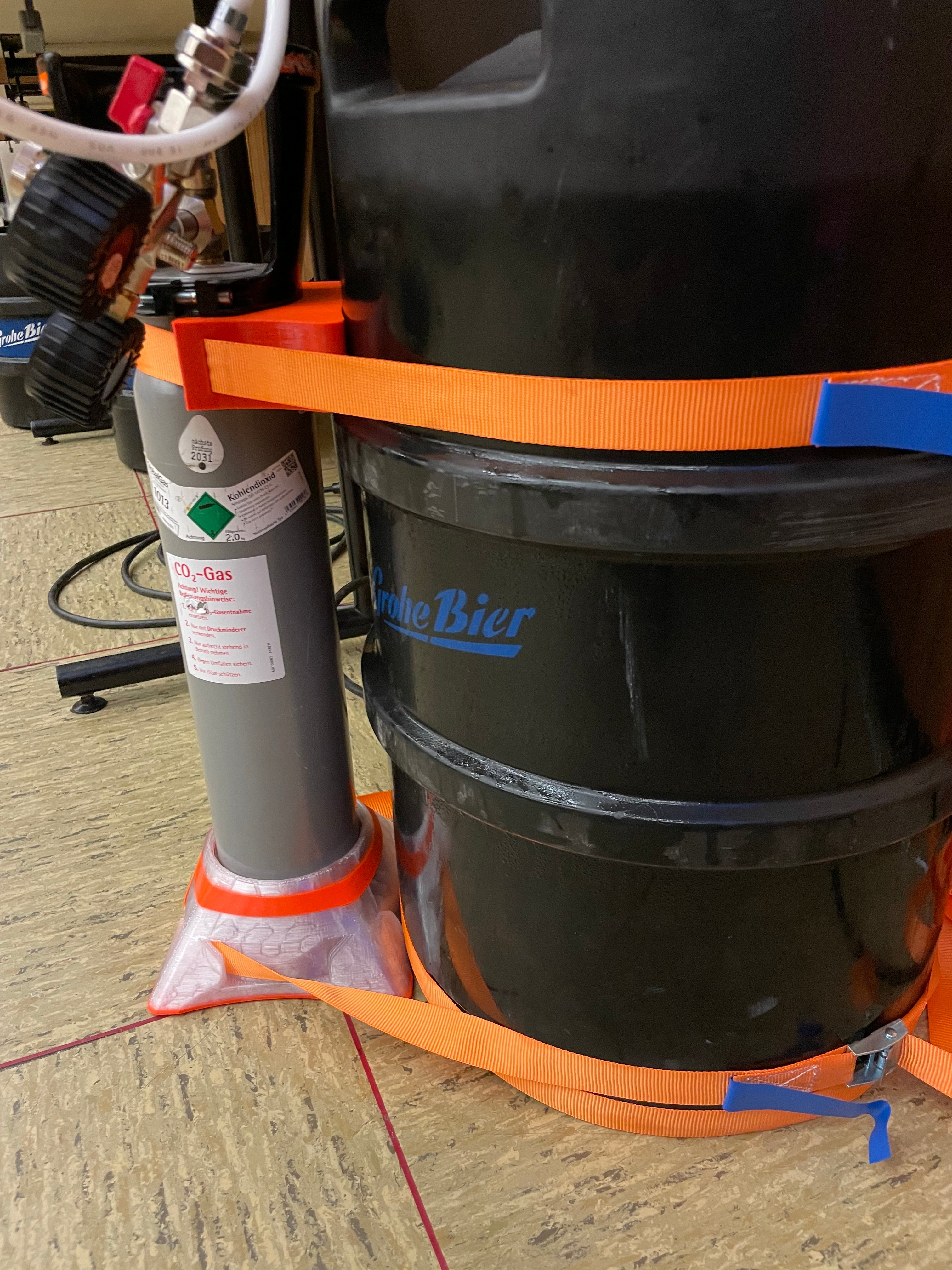 Está desarrollado específicamente para botellas de CO2 de 2 litros y se adapta perfectamente tanto a barriles de cerveza de 30 litros como de 50 litros. Con un diámetro de apertura de aproximadamente 10,5 cm, se consigue un ajuste ceñido y estable. Para mayor seguridad, la botella se puede sujetar fácilmente con correas de hasta 25 mm de ancho, lo que elimina el riesgo de vuelco.