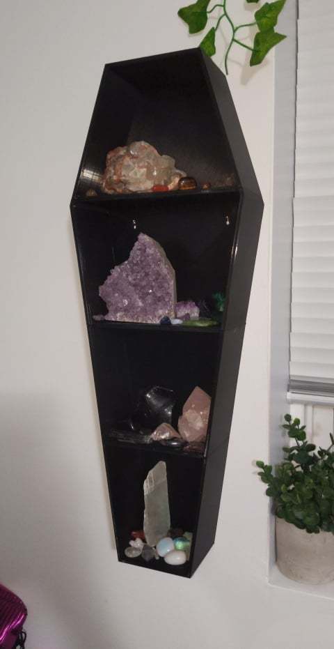 Este estante de pared con forma de ataúd ofrece una solución de almacenamiento distintiva que encaja a la perfección en un hogar con una decoración gótica o de inspiración metal. Con su diseño tradicional de ataúd, el estante crea un elemento visual único en cualquier pared. Está construido para ser robusto y estable, lo que permite exhibir diversos objetos, desde cristales y pequeñas chucherías hasta libros y elementos decorativos, sin preocuparse de que el estante se doble bajo el peso.