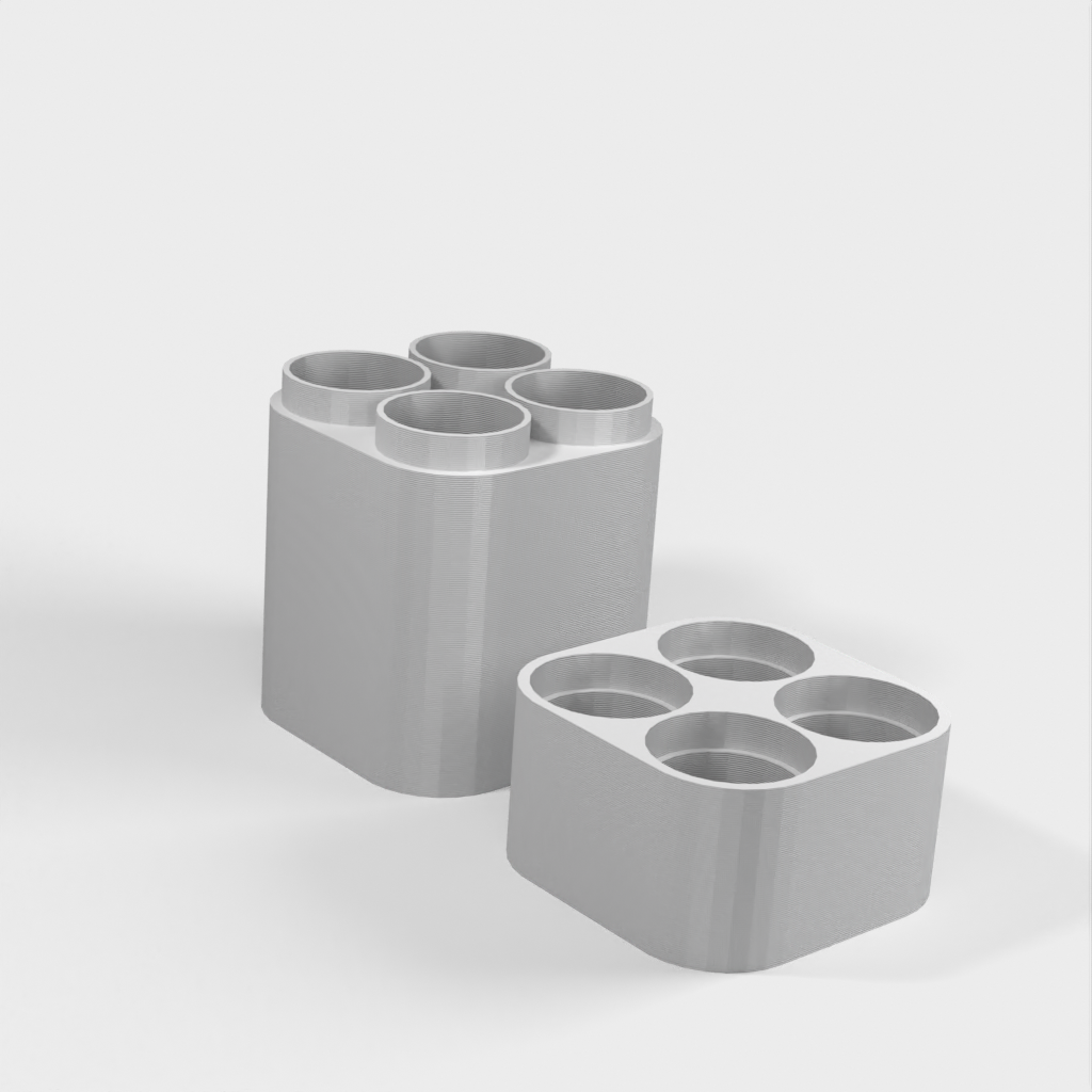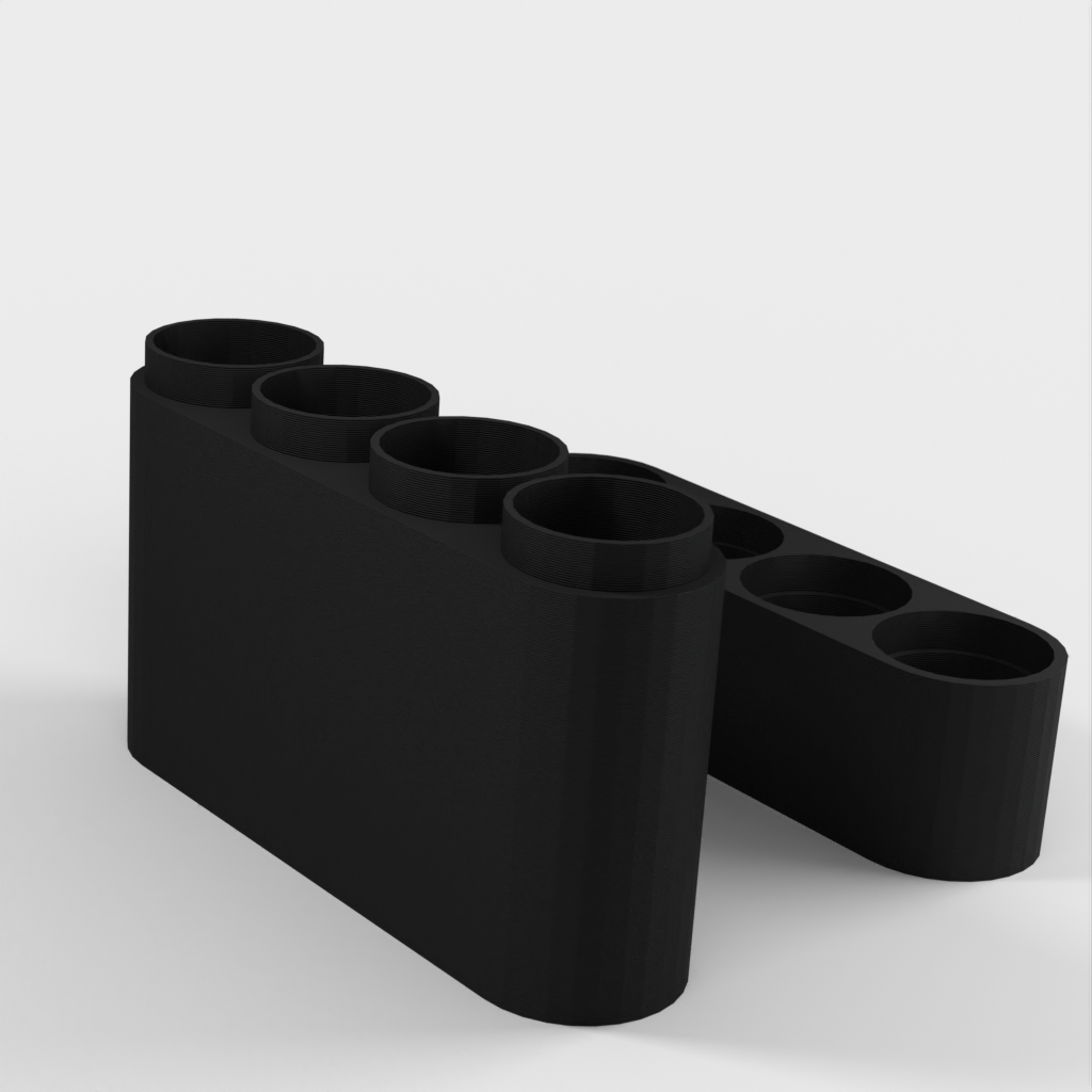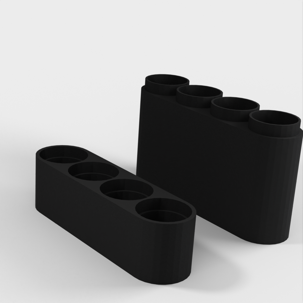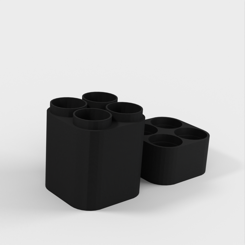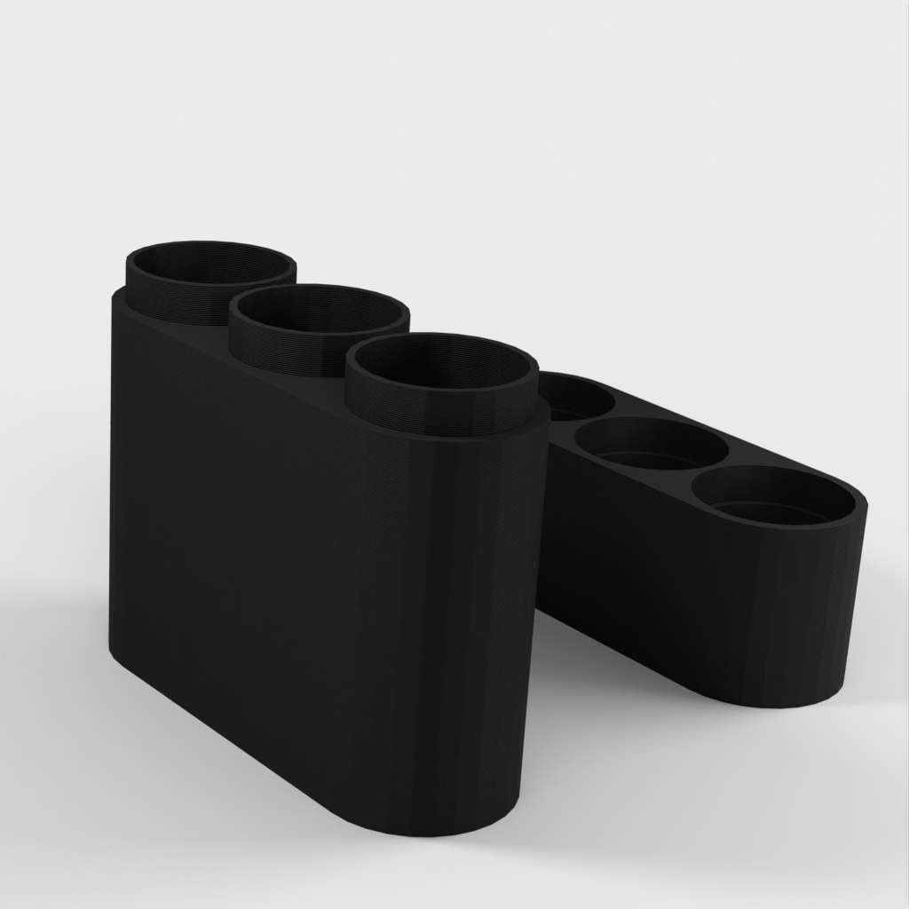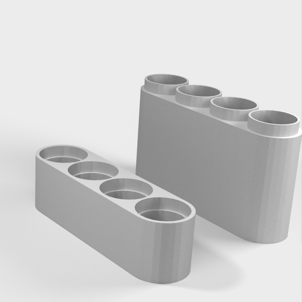 El soporte de viaje para pilas AA y AAA le ayuda a organizar sus pilas de forma eficaz. Este soporte puede contener 2, 4 ó 3 pilas, ya sea en una matriz lineal o 2x2. El soporte consta de una pieza superior y otra inferior, y sigue una sencilla regla empírica: Si la pequeña hendidura está orientada hacia arriba, la pila está cargada.