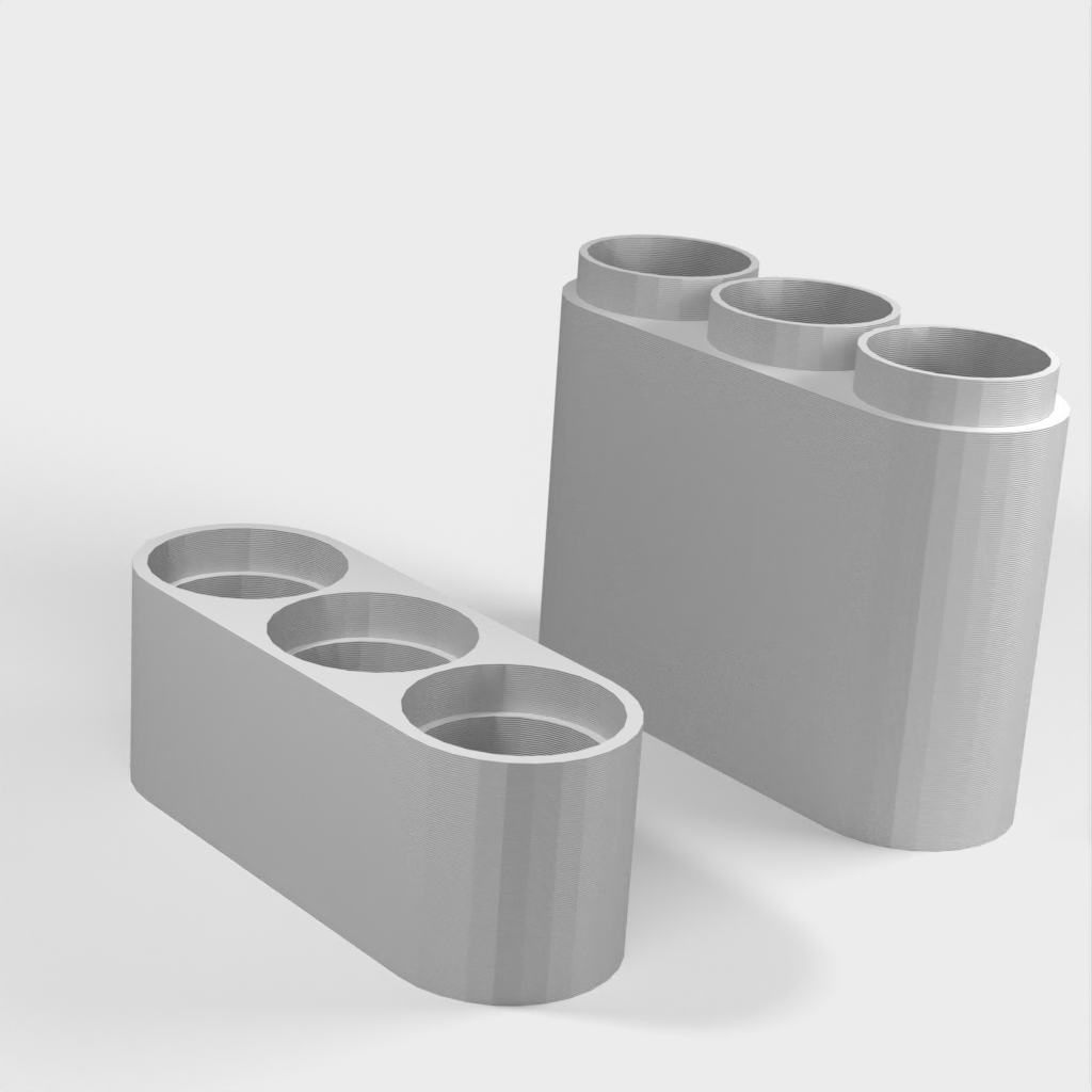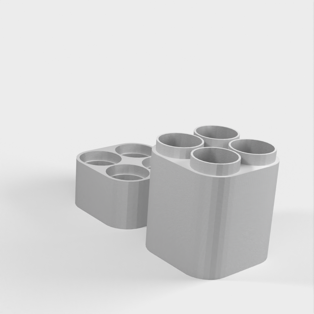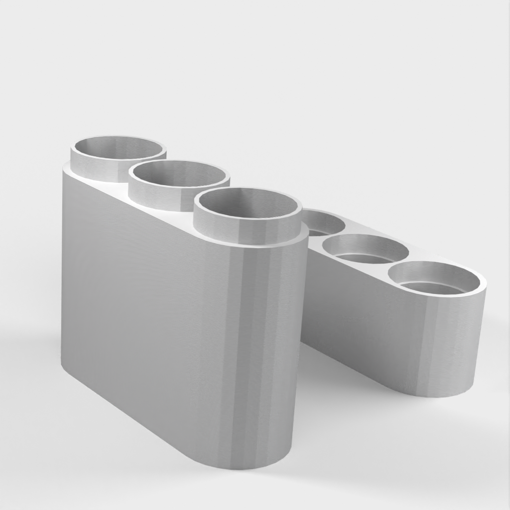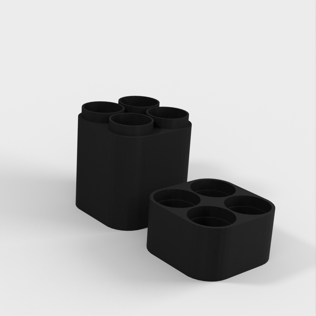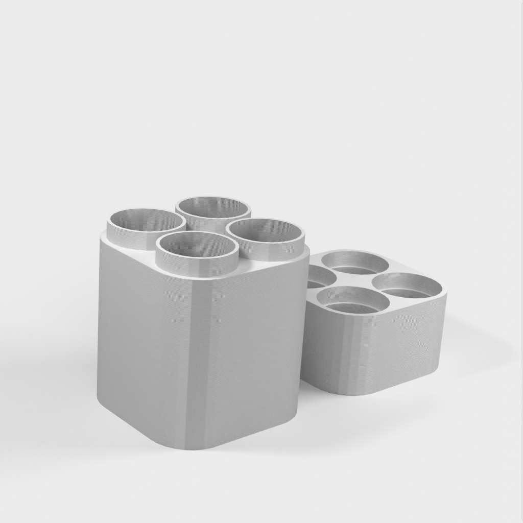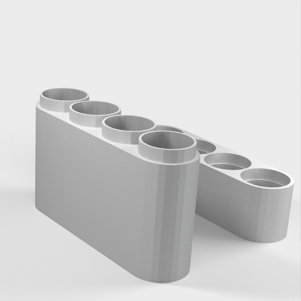 El soporte de viaje para pilas AA y AAA le ayuda a organizar sus pilas de forma eficaz. Este soporte puede contener 2, 4 ó 3 pilas, ya sea en una matriz lineal o 2x2. El soporte consta de una pieza superior y otra inferior, y sigue una sencilla regla empírica: Si la pequeña hendidura está orientada hacia arriba, la pila está cargada.