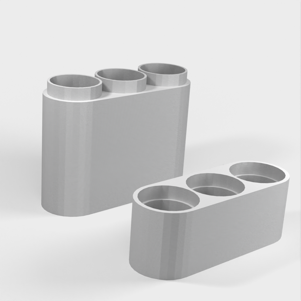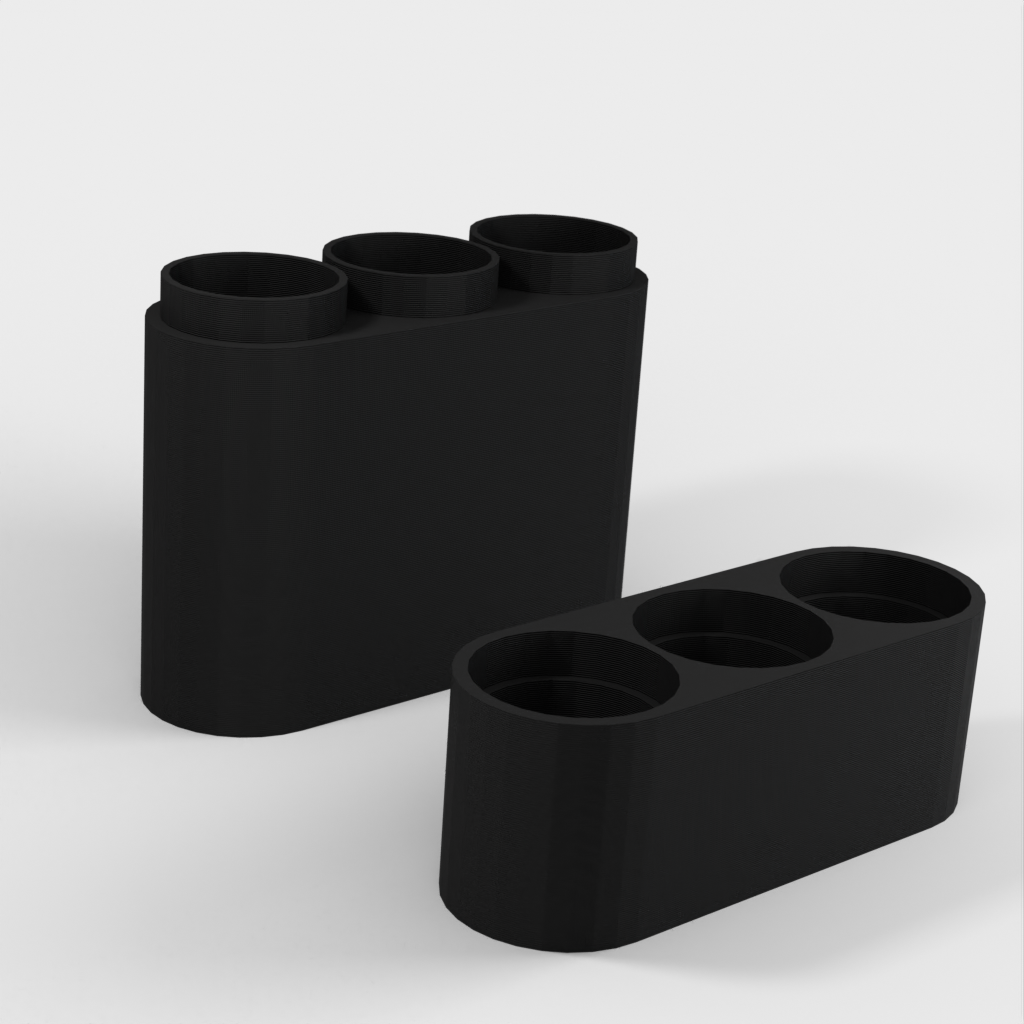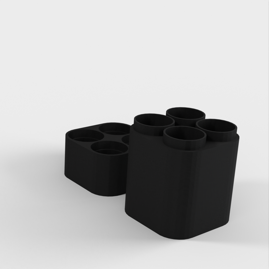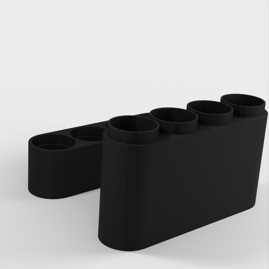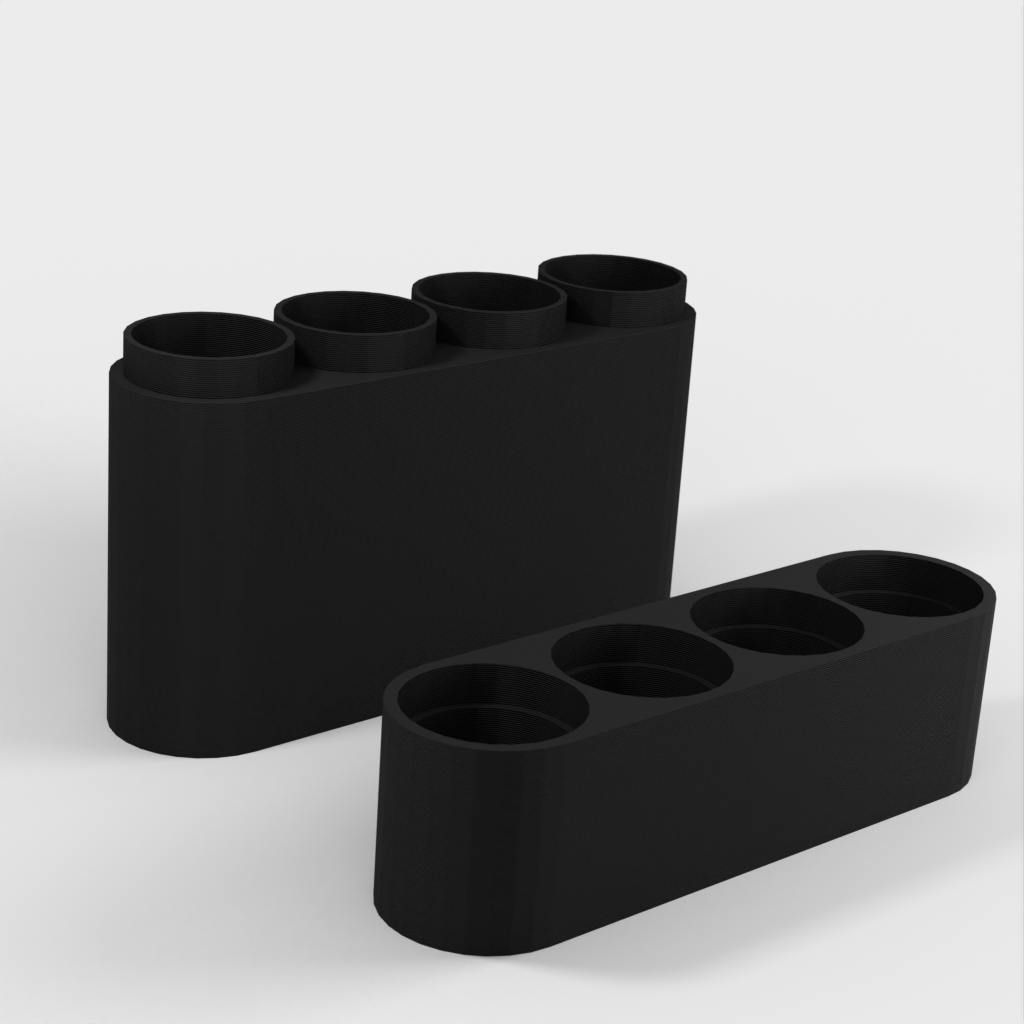 El soporte de viaje para pilas AA y AAA le ayuda a organizar sus pilas de forma eficaz. Este soporte puede contener 2, 4 ó 3 pilas, ya sea en una matriz lineal o 2x2. El soporte consta de una pieza superior y otra inferior, y sigue una sencilla regla empírica: Si la pequeña hendidura está orientada hacia arriba, la pila está cargada.
