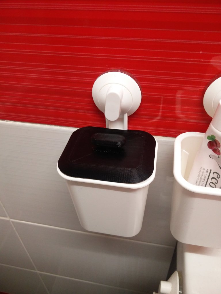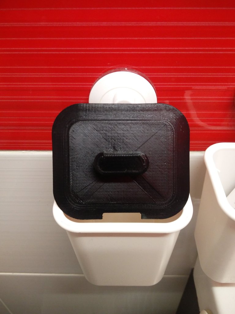 Una sencilla tapa para el cubo de los cepillos de dientes de la serie Stugvik de IKEA, diseñada para crear un pequeño cubo de basura. La tapa está equipada con un asa en línea con el resto de la gama Stugvik. Todo lo que tienes que hacer es añadir una pequeña bolsa de plástico dentro del contenedor y tendrás una papelera compacta, perfecta para el cuarto de baño.