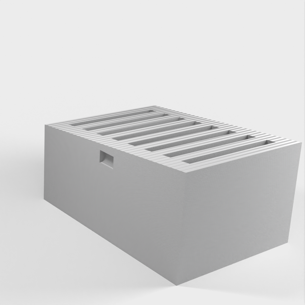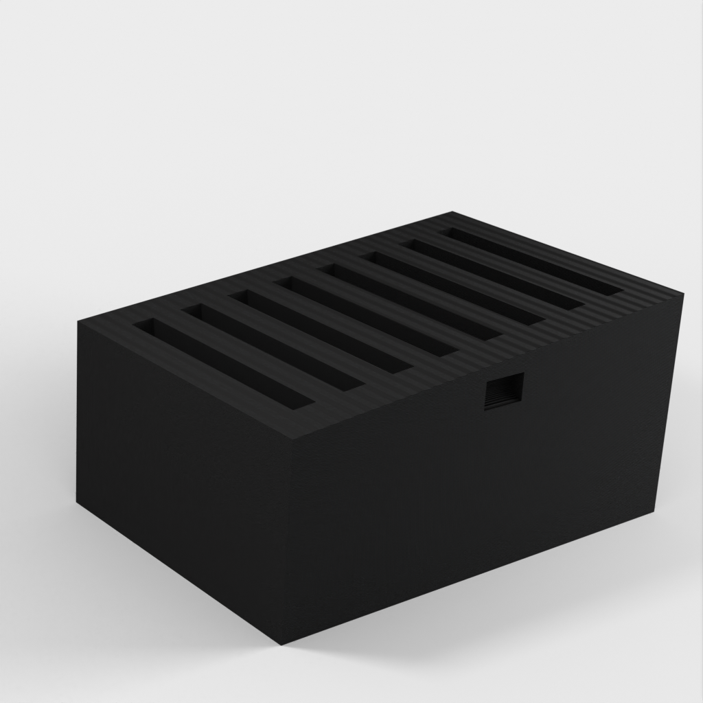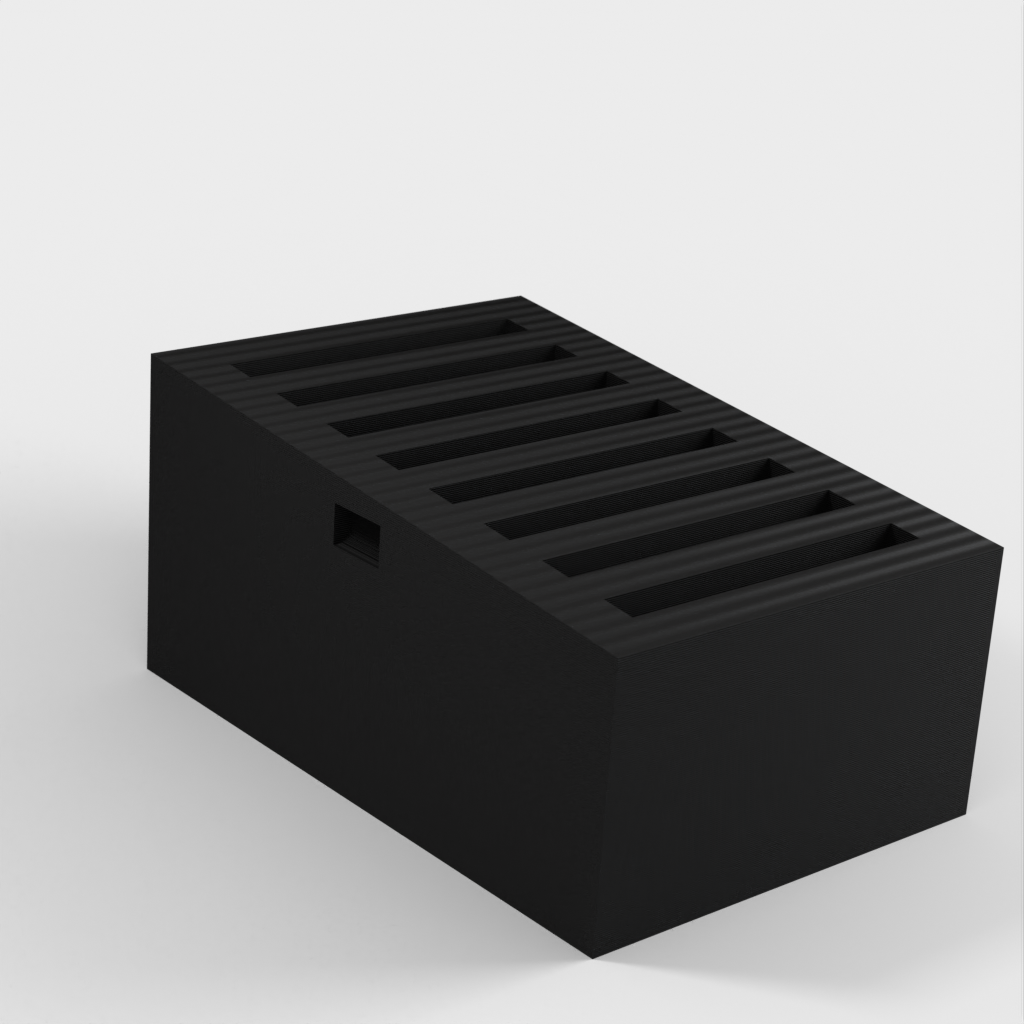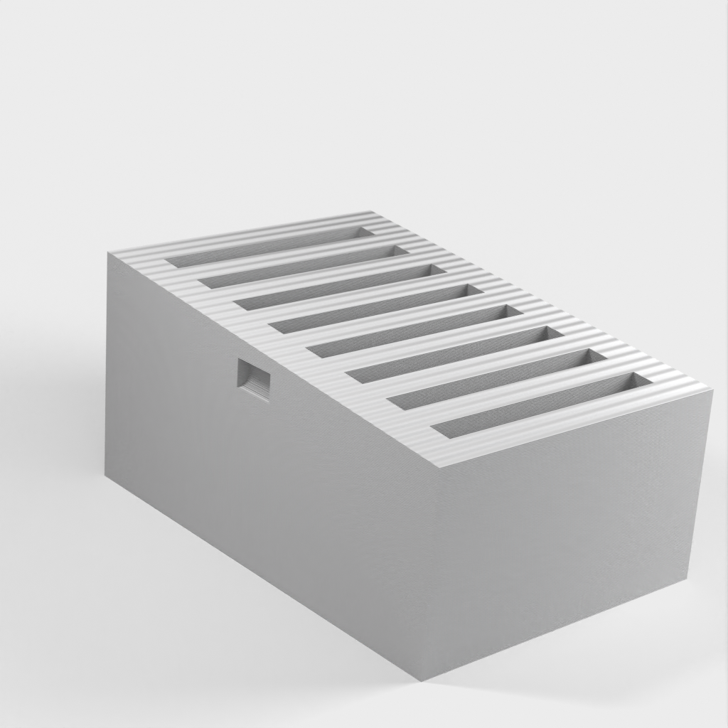 El soporte para tarjetas SD Mark 2 es una versión mejorada del soporte para tarjetas SD sencillo. Este modelo sigue teniendo capacidad para 8 tarjetas, pero ahora las ranuras para tarjetas son ligeramente más grandes, lo que facilita la inserción y extracción de tarjetas. En lugar de utilizar ranuras ajustadas para evitar que las tarjetas se caigan, a esta versión le he añadido una tapa que se encaja de forma segura y protegida.