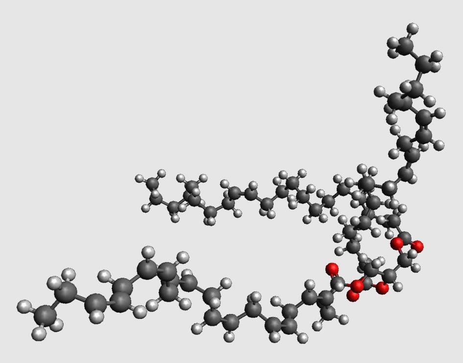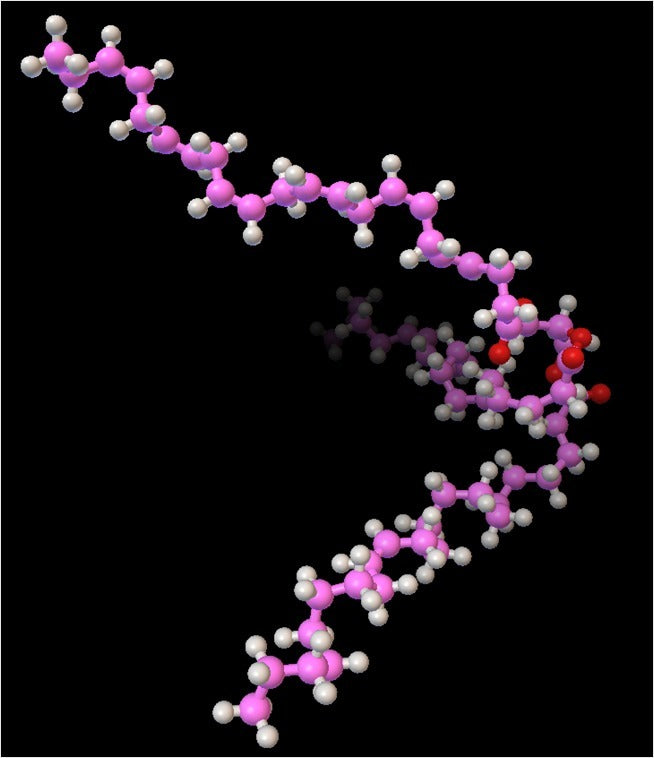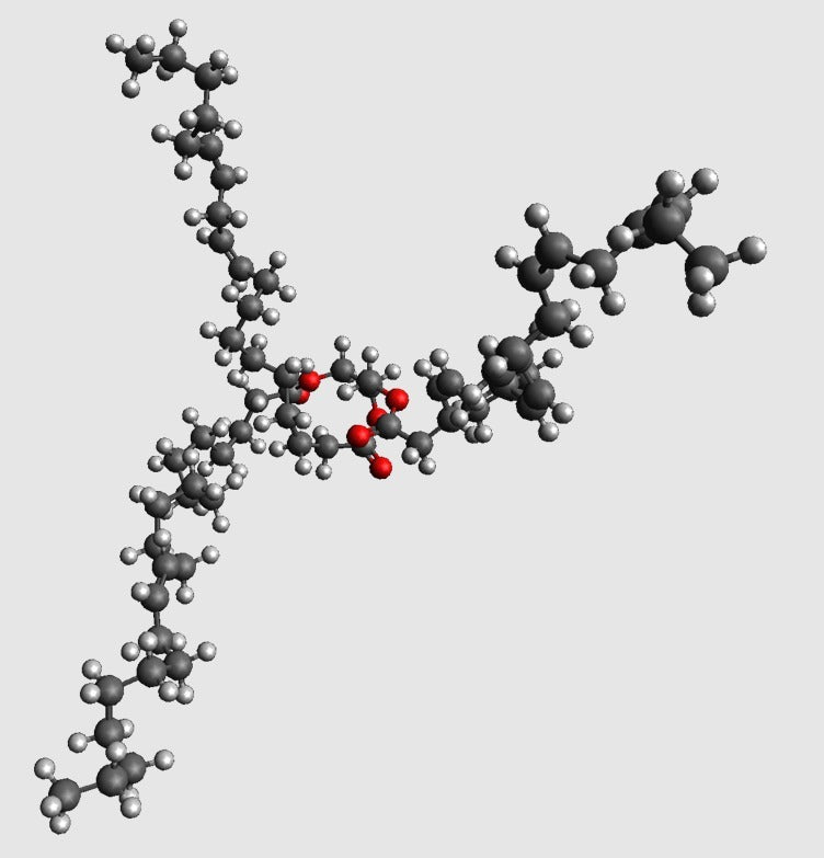Un modelo molecular de triacilglicerol a escala atómica en 3D. Utiliza este modelo para enseñar a tus hijos sobre química, especialmente en torno a los diferentes aspectos de la alimentación y los bloques de construcción y energía del cuerpo (este modelo representa una grasa simple).