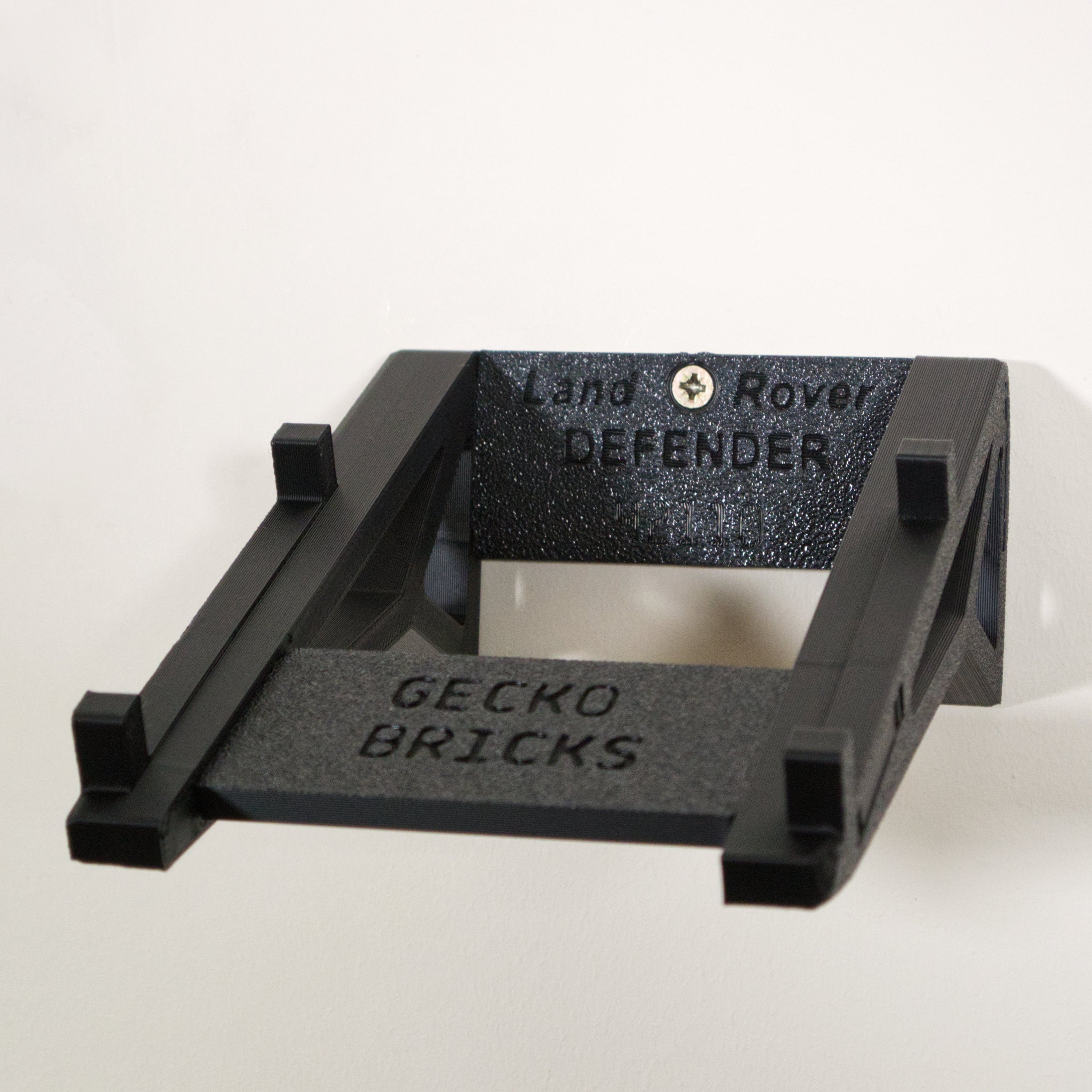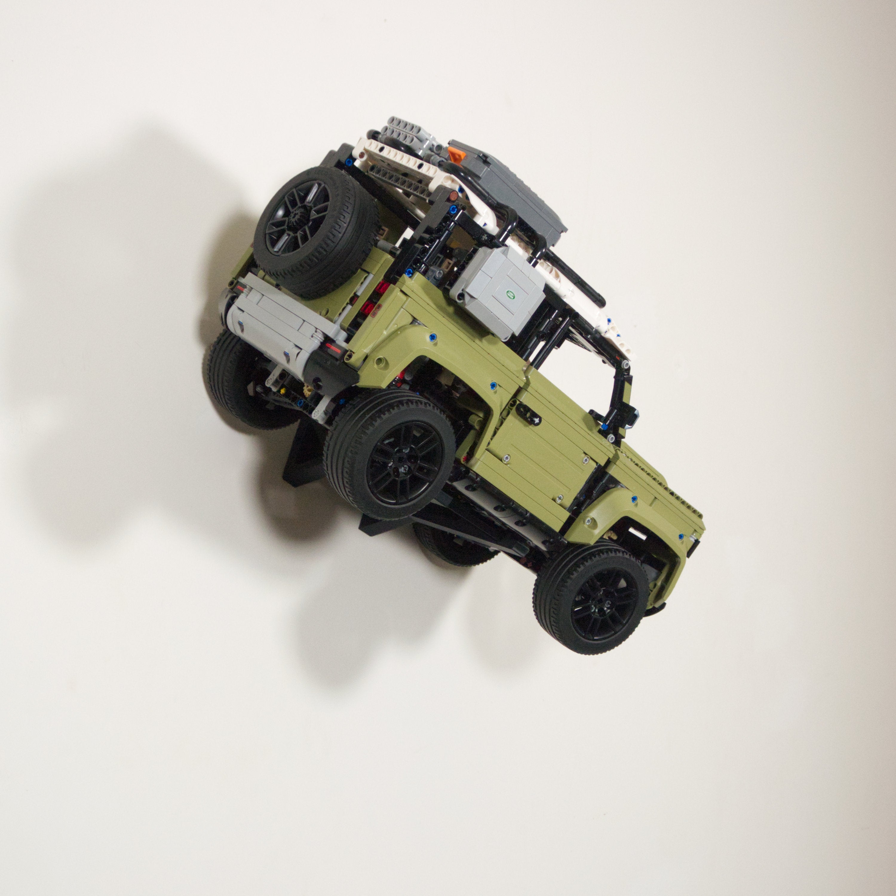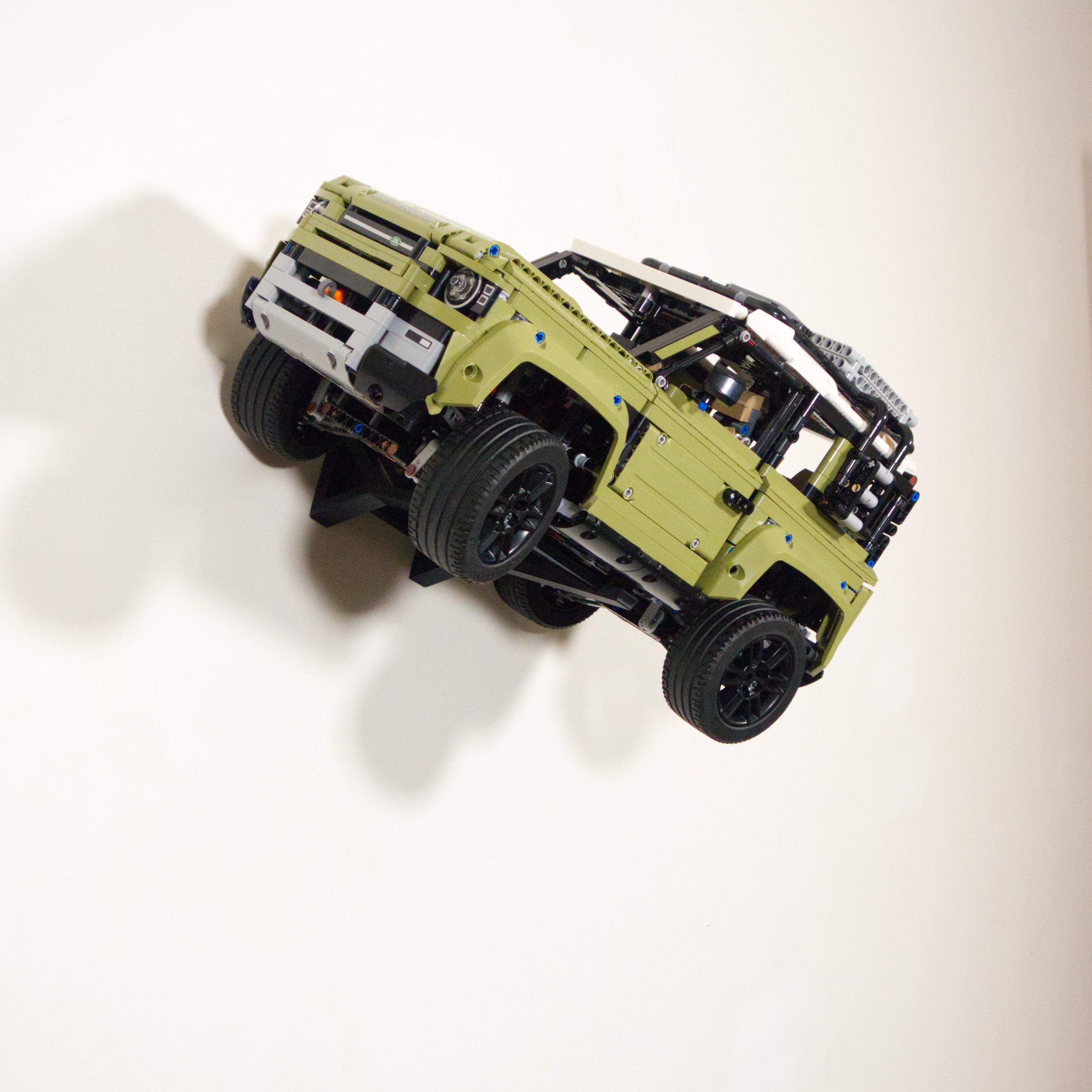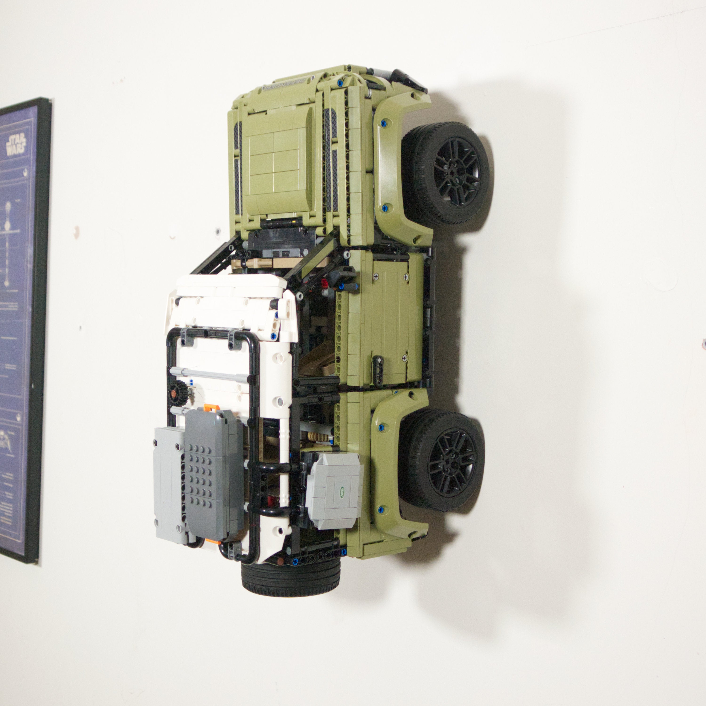 Este soporte de pared está diseñado específicamente para el Technic Land Rover Defender 42110. Permite montar el modelo ya sea plano contra la pared o en ángulo de 45 grados. La solución libera espacio en el estante y asegura una suspensión estable donde el coche se puede bajar fácilmente cuando sea necesario.