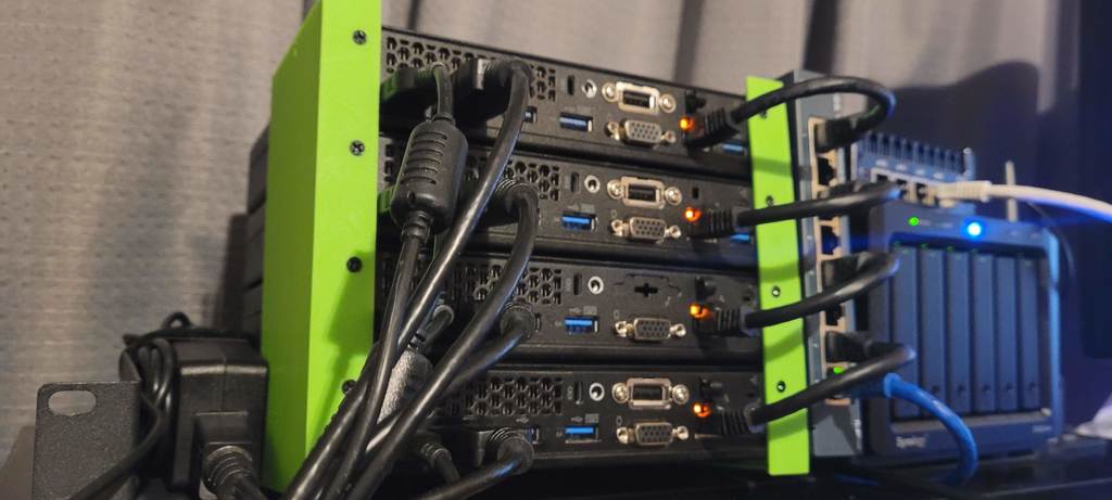 Esta práctica solución de montaje en rack está diseñada para optimizar el espacio y organizar sus PC Lenovo Thinkcentre M93p Tiny. El sistema permite apilar de forma segura y eficiente hasta cuatro mini PC. Si su necesidad es menor, el diseño se puede adaptar fácilmente para albergar menos dispositivos, lo que lo hace flexible para diferentes configuraciones.