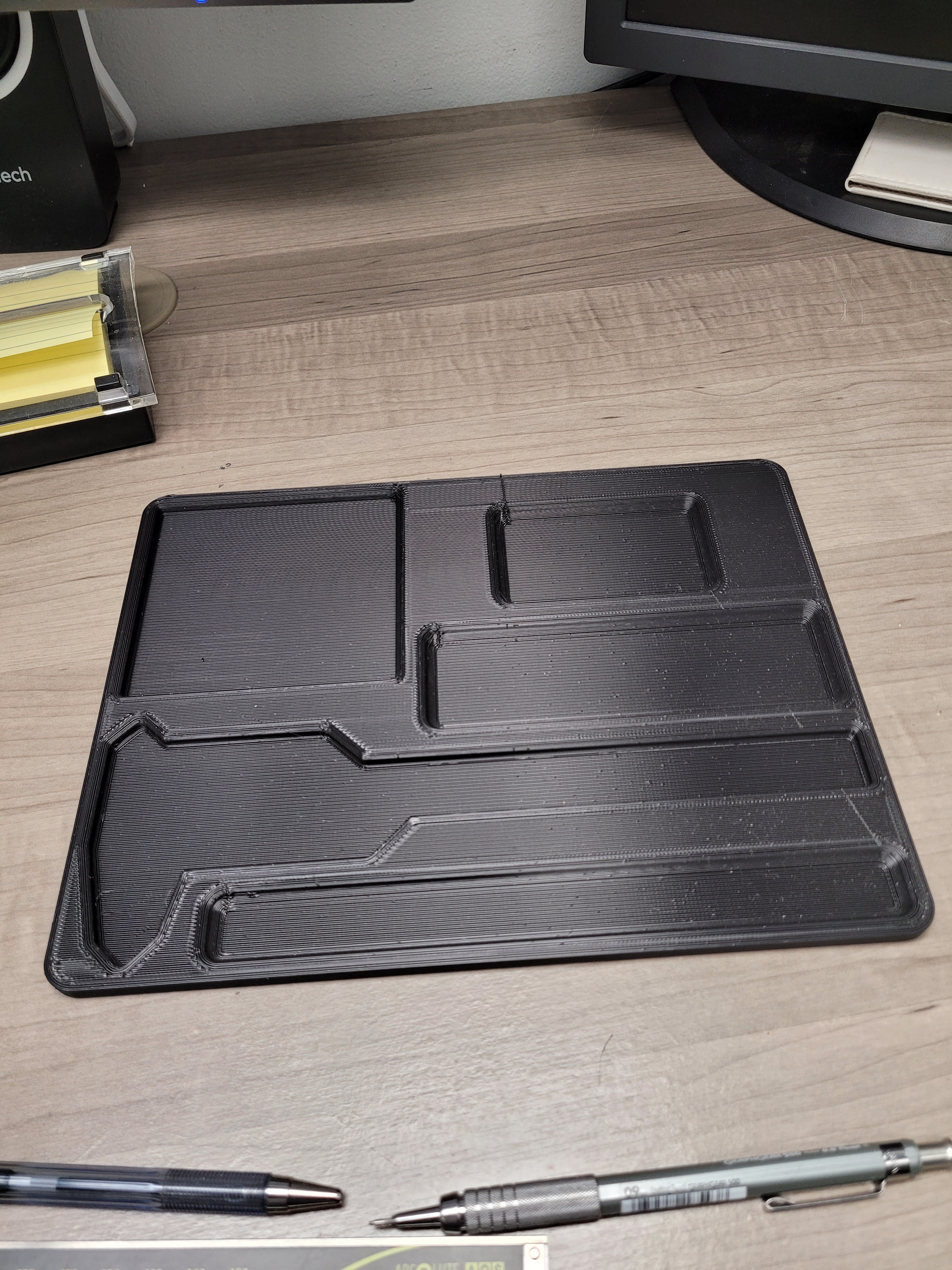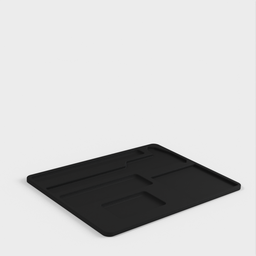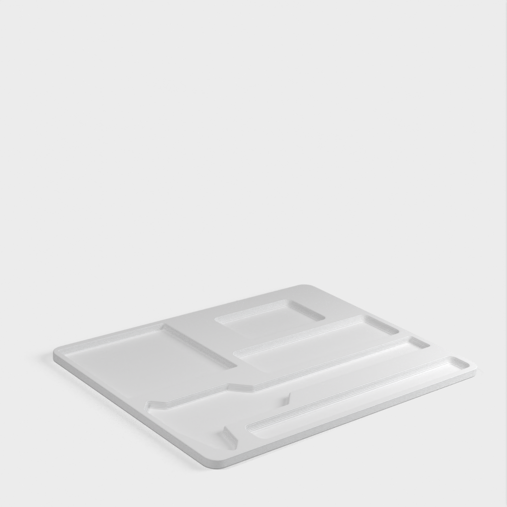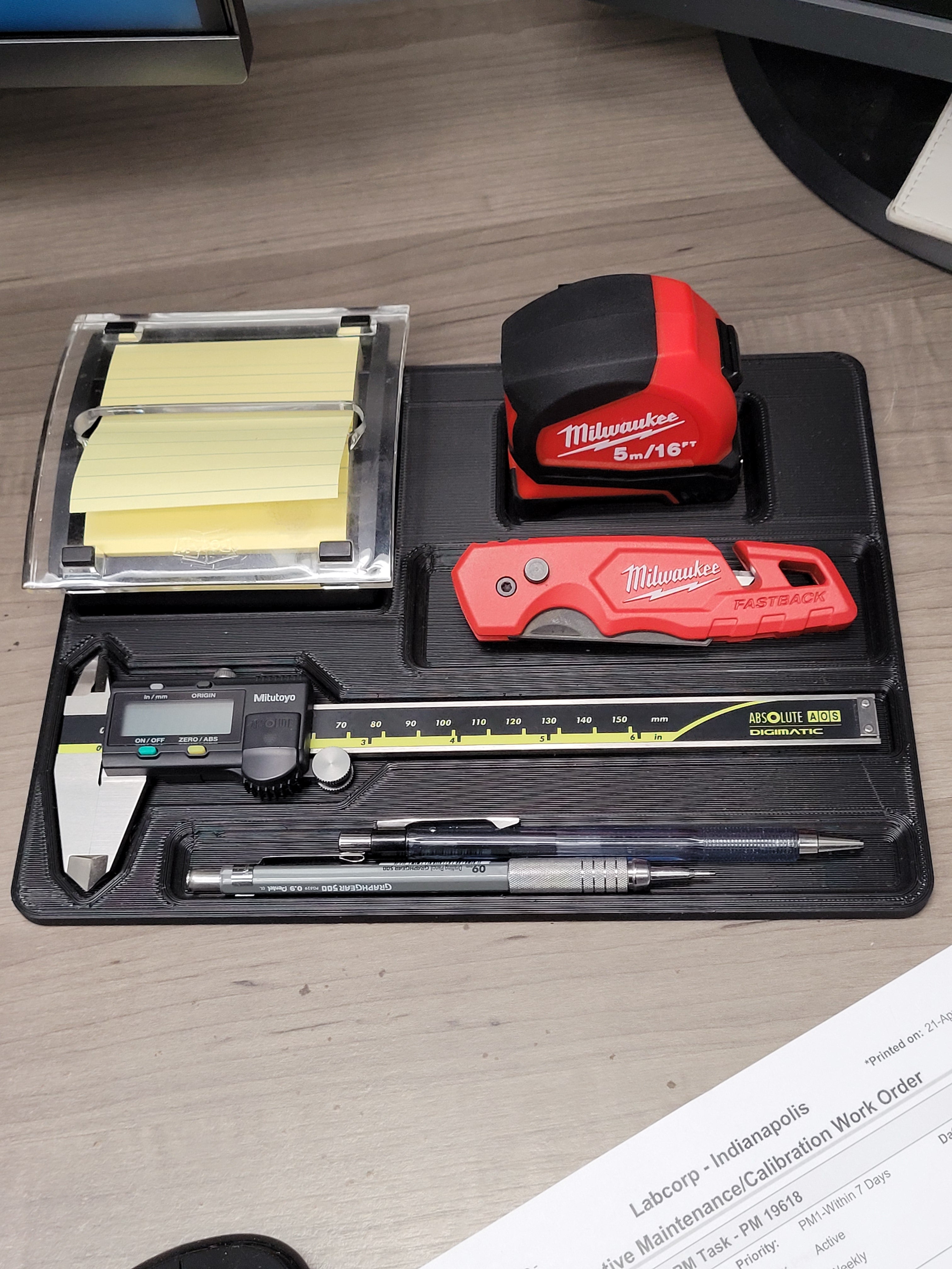 Organizador de escritorio con calibre Mitutoyo y cinta métrica y cuchillo Milwaukee