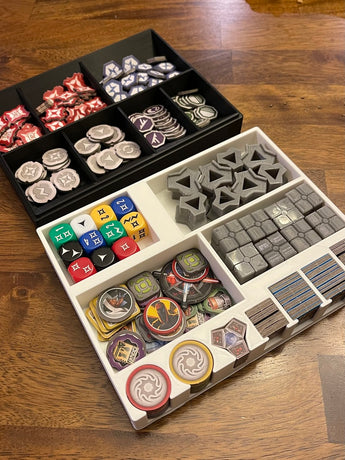 Mantén organizados los componentes de tu juego Imperial Assault con este eficaz organizador de cartas y fichas. El sistema incluye bandejas separadas diseñadas para guardar fichas de salud, resistencia, estado y poder, así como otras fichas y dados. Las bandejas incluidas son ideales para guardar terminales impresos en 3D y cubos de suministro, lo que garantiza que todas las fichas de los sets base y de expansión puedan guardarse fácilmente.