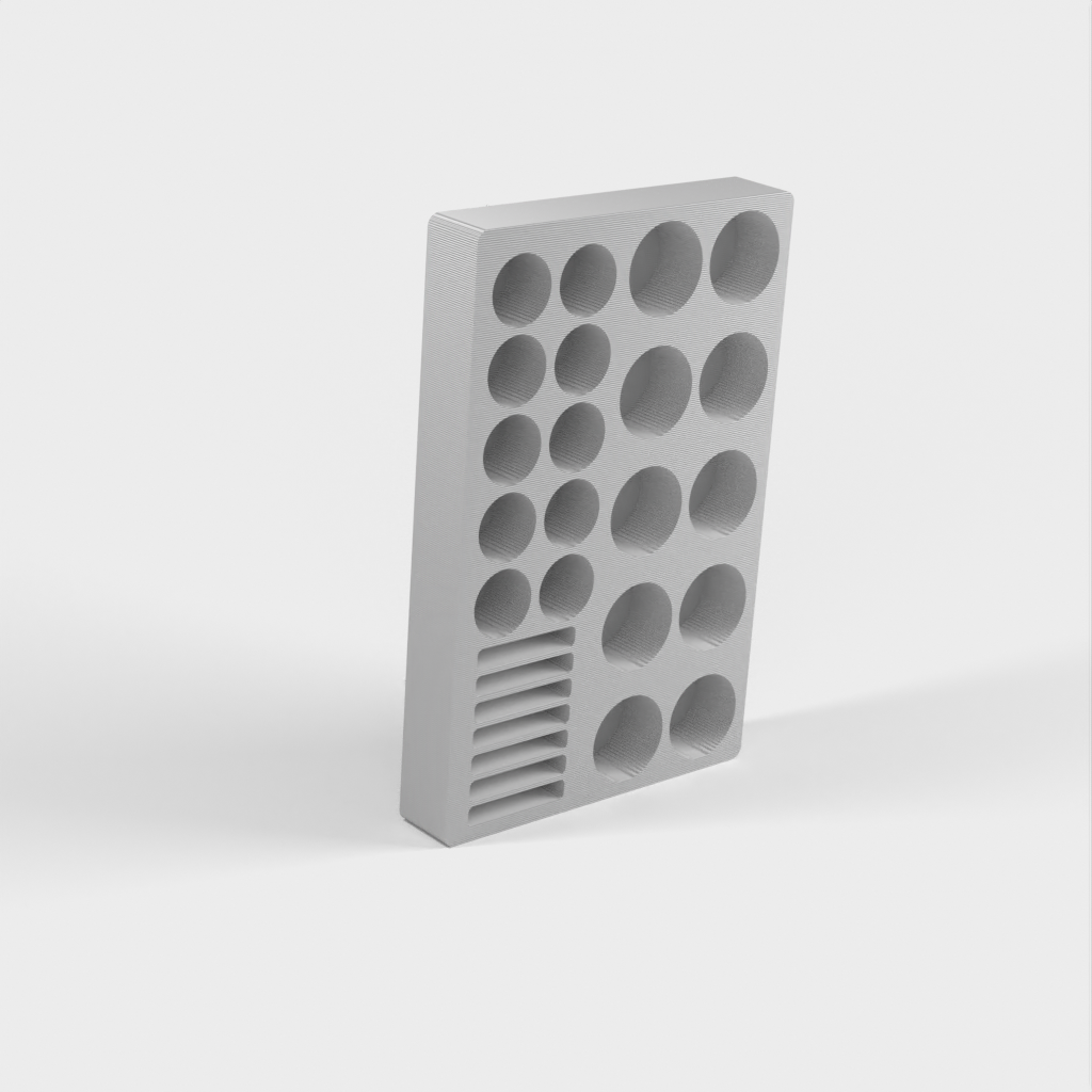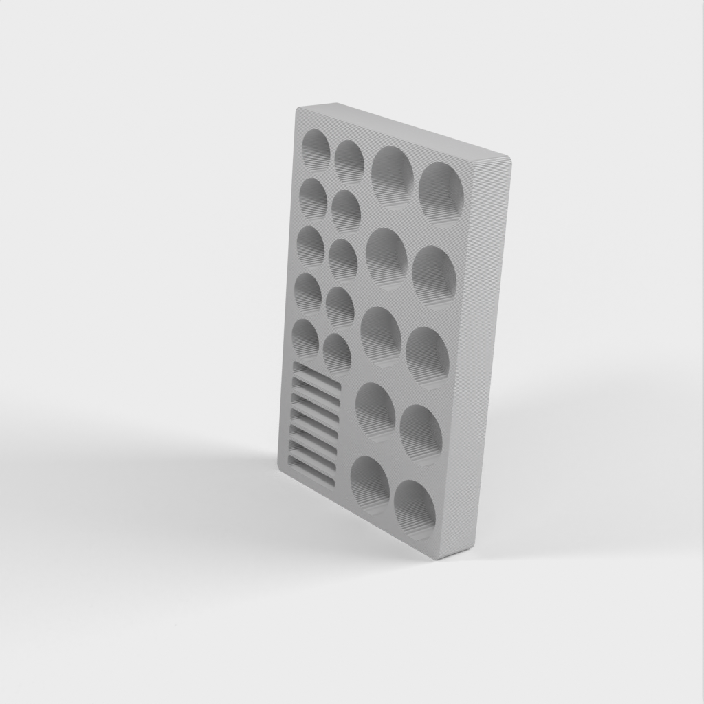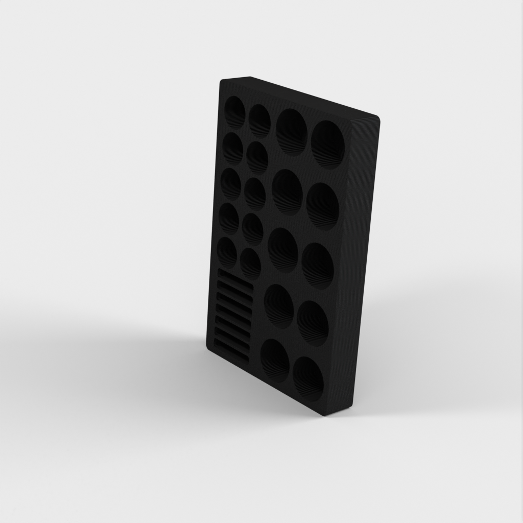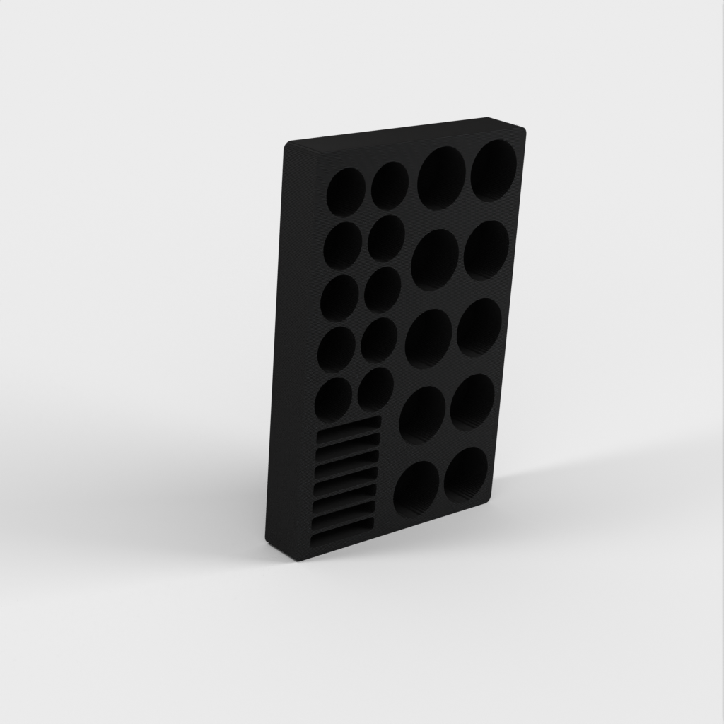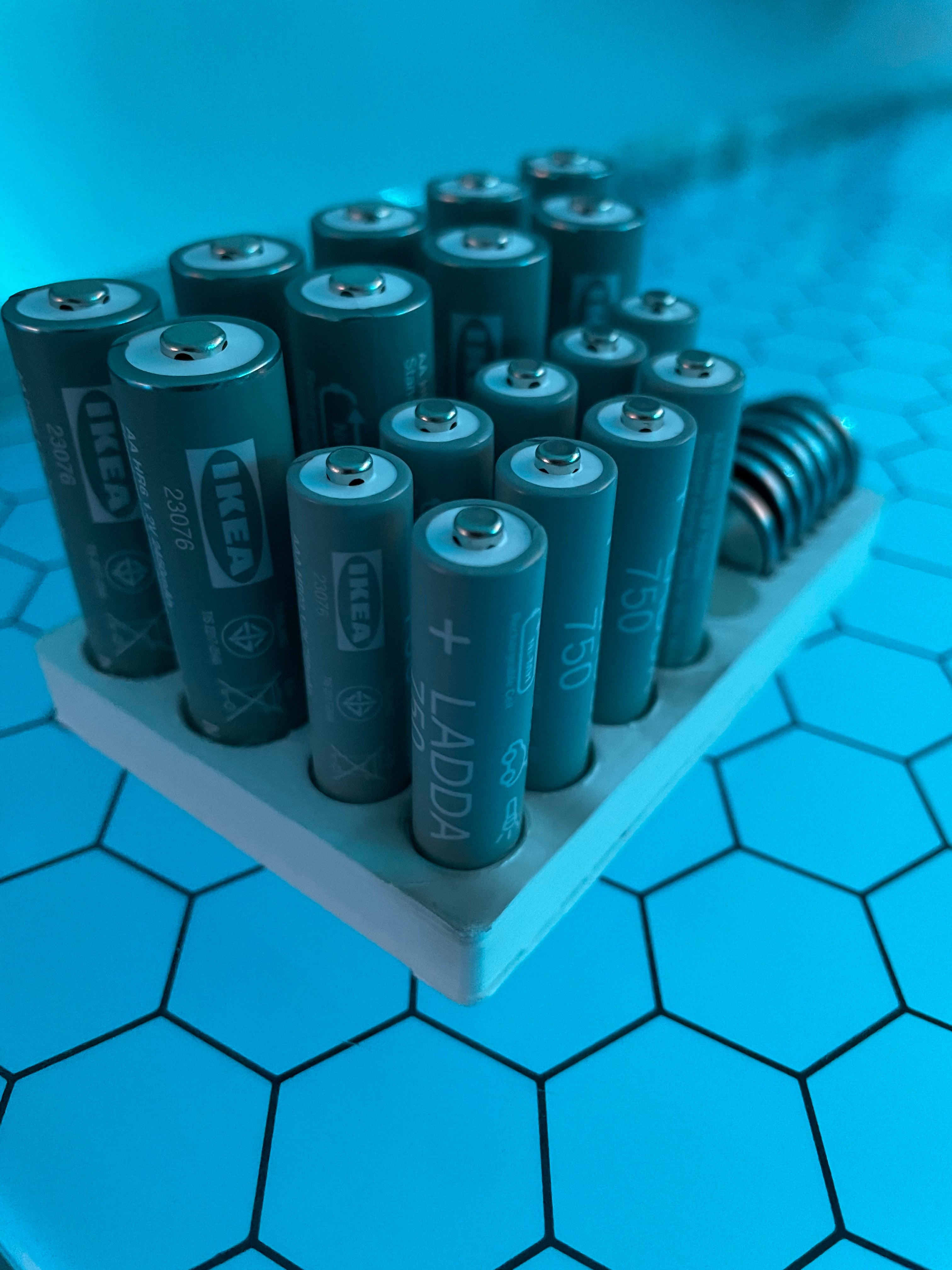 Un portapilas específico para pilas AA, AAA y CR2032. Está diseñado específicamente para las pilas IKEA Ladda, pero también se adapta a otras marcas siempre que no sean más finas que las pilas de tamaño normal. El soporte tiene capacidad para 10 pilas AA, 10 AAA y 7 CR2032. Esto ayuda a mantener las pilas organizadas y fácilmente accesibles.