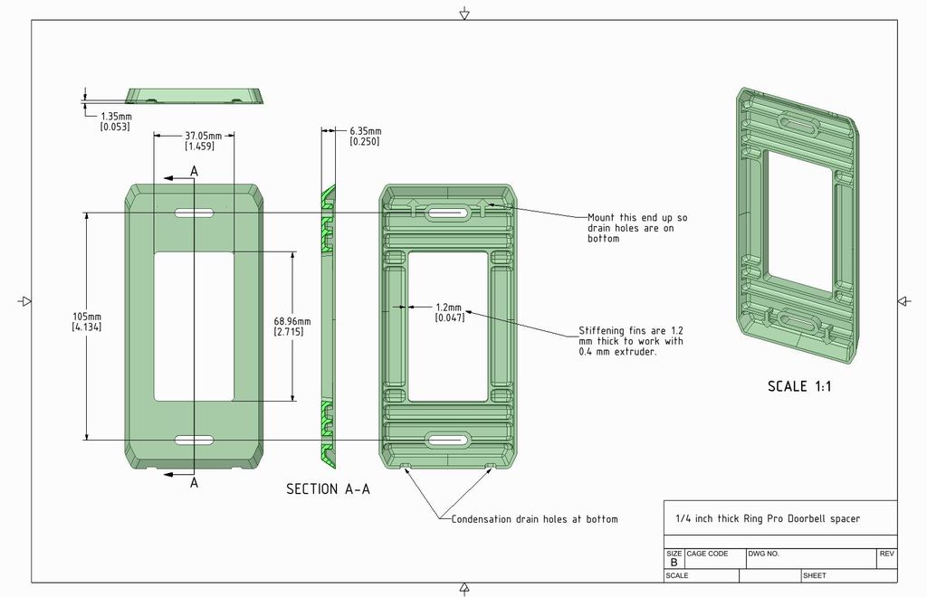 Placa de pared simple para Ring Doorbell Pro que ayuda a crear más espacio detrás del timbre. Esta placa de pared viene con un espaciador de 1/4 de pulgada (6,35 mm) para mayor profundidad. El espaciador es especialmente útil si falta espacio para todo el equipo necesario detrás de su Ring Doorbell Pro. El grosor del espaciador es de 1/4 de pulgada y la distancia del orificio del tornillo se ajusta para que se ajuste al Ring Pro con una distancia de 105 mm.