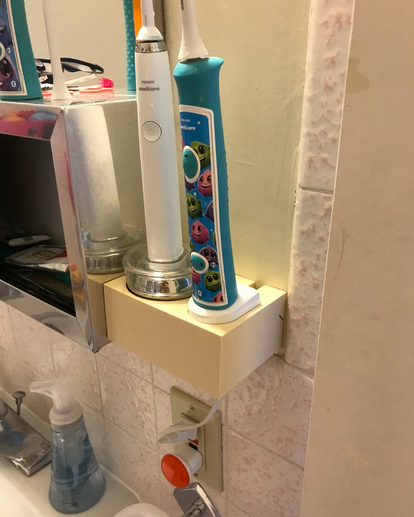 La caja está diseñada para montarse directamente en la pared sobre una toma de corriente. Esto proporciona un almacenamiento óptimo y que ahorra espacio, lo que garantiza que su cepillo de dientes Sonicare esté siempre cargado y listo para usar. La construcción innovadora mantiene el cargador y el cable incluido en su lugar de forma ordenada, lo que minimiza el desorden y el riesgo de que el cable quede atrapado o de que se caiga el cepillo de dientes.