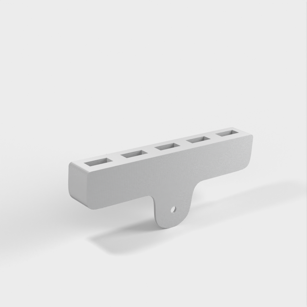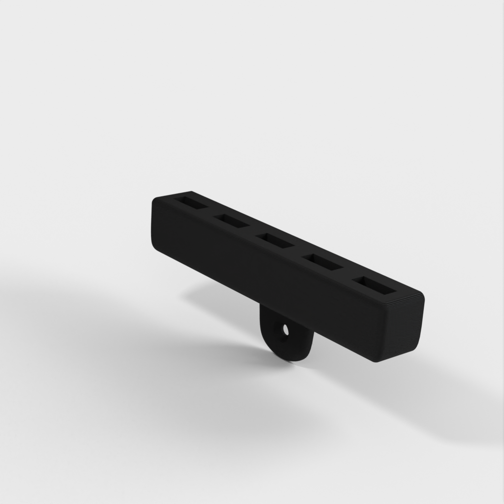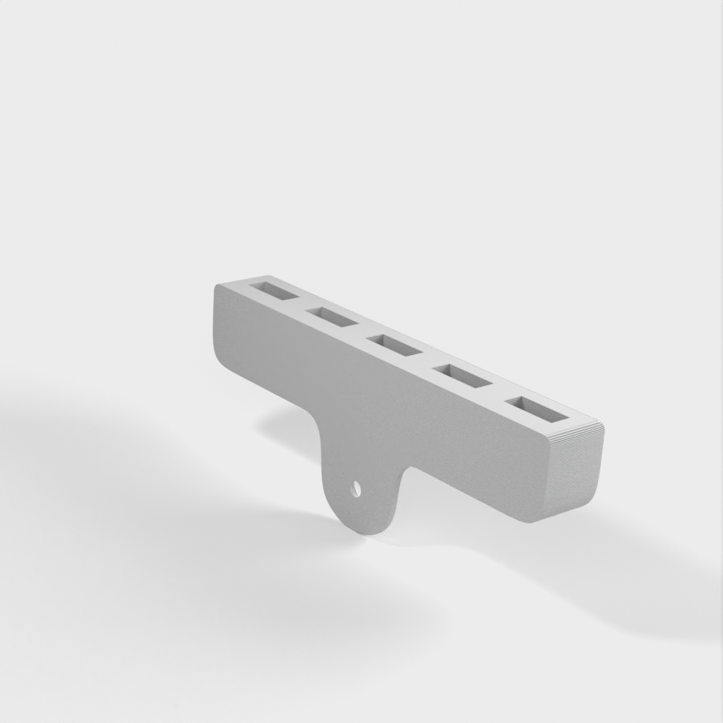 Este es un soporte USB con espacio para 5 cables diseñado para colgar en la pared junto a su escritorio, manteniendo sus cables fuera del camino pero fácilmente accesibles. El producto está diseñado para colgar hacia abajo y se fija a la pared mediante tornillos. Es necesario tener un poco de cuidado a la hora de atornillarlo a la pared para no partir la parte superior.