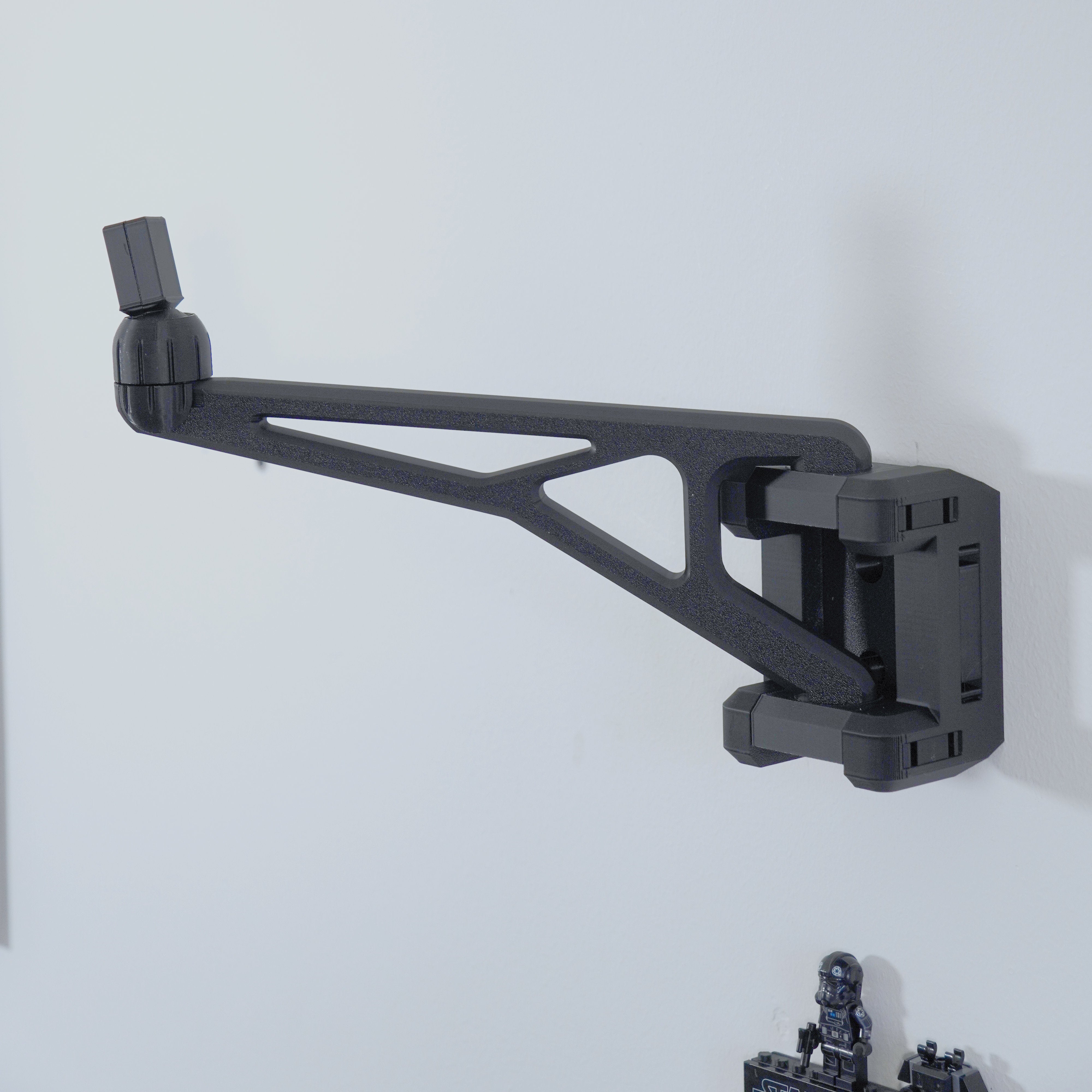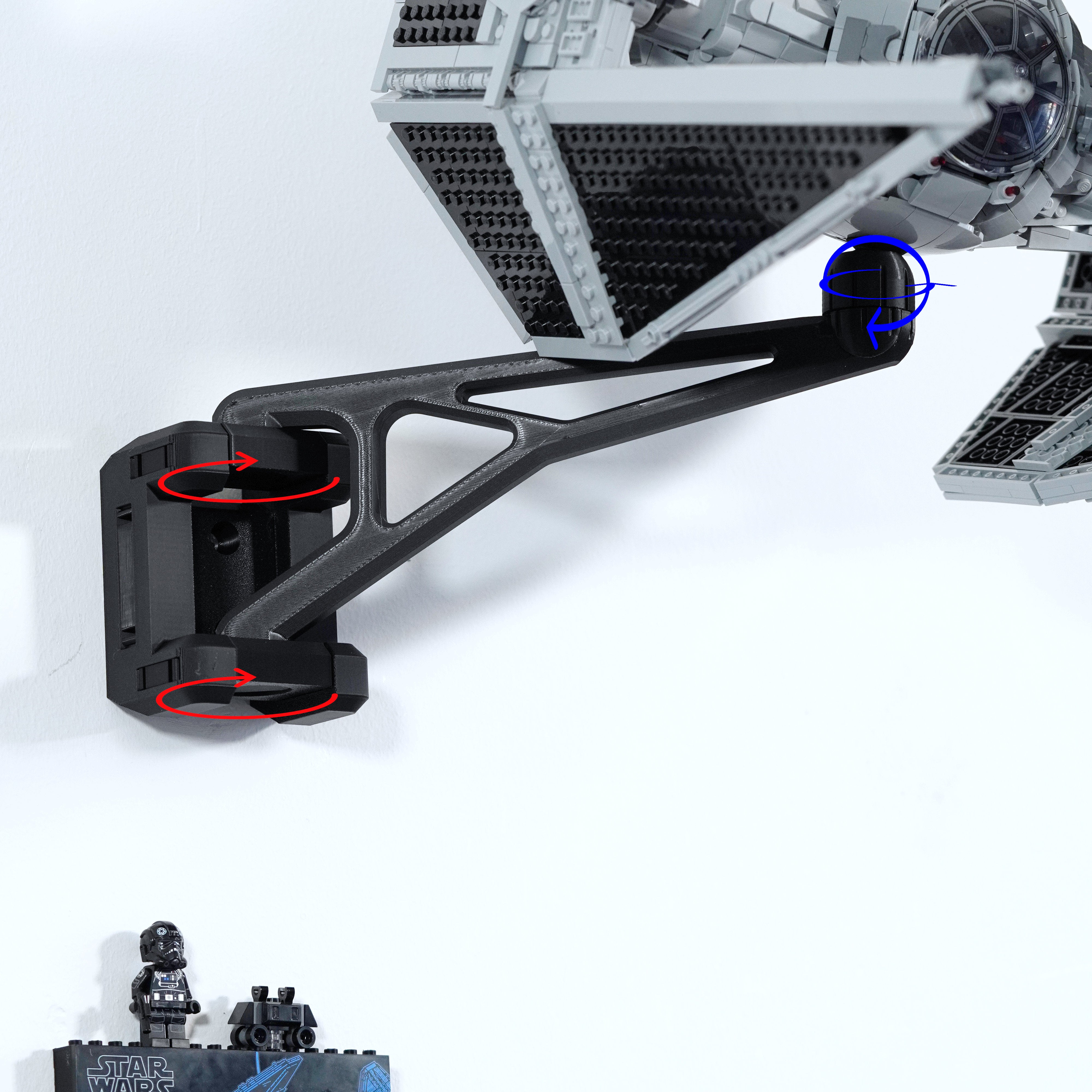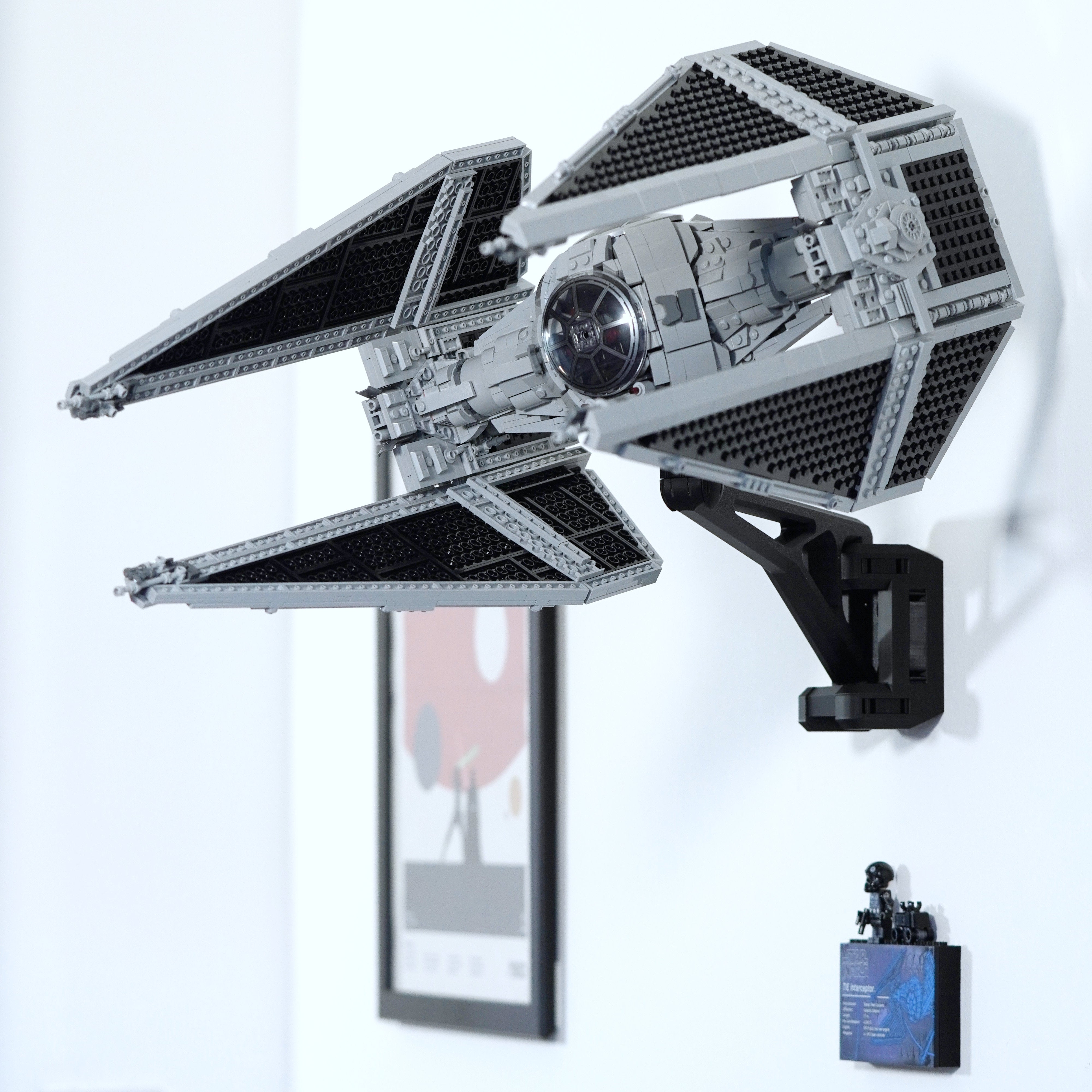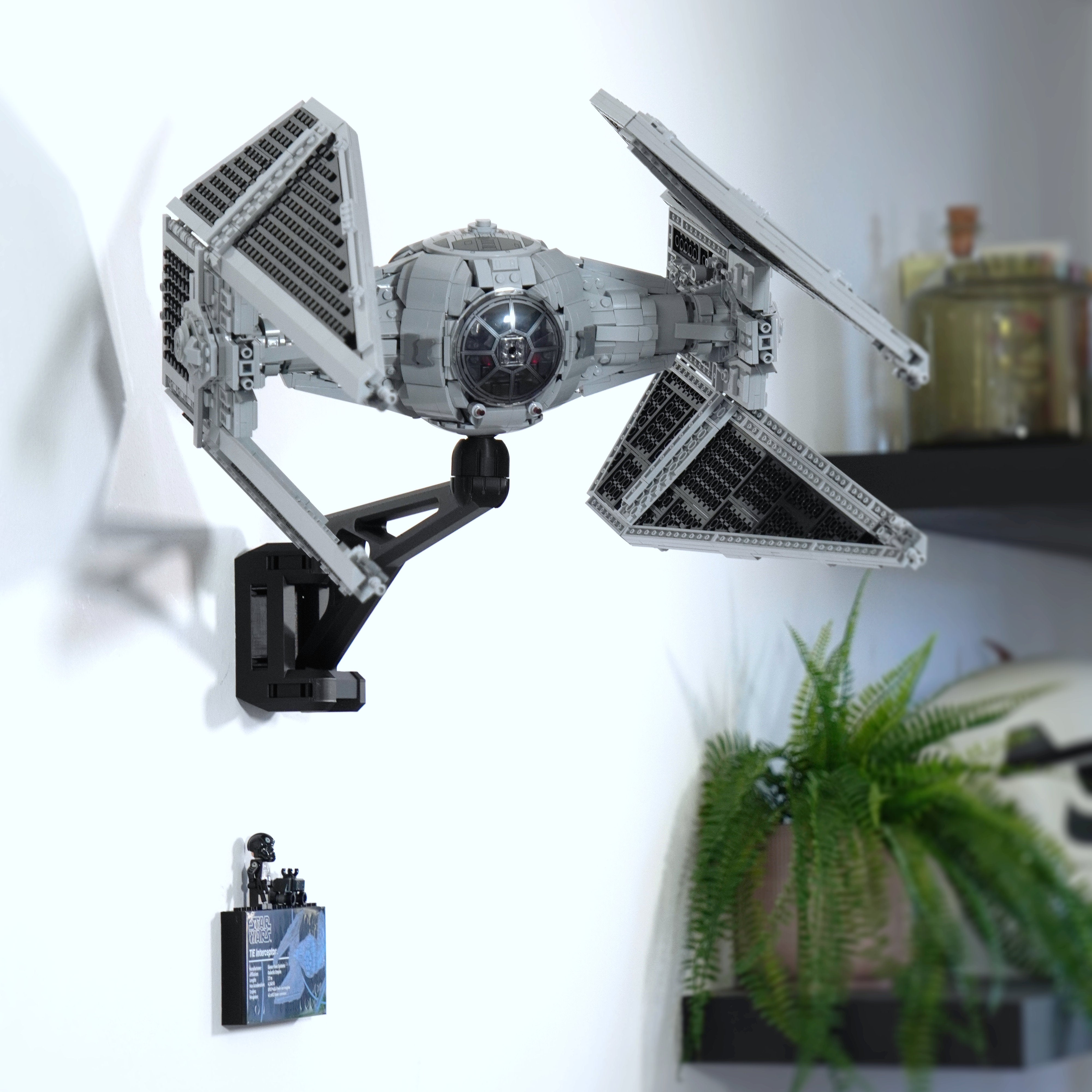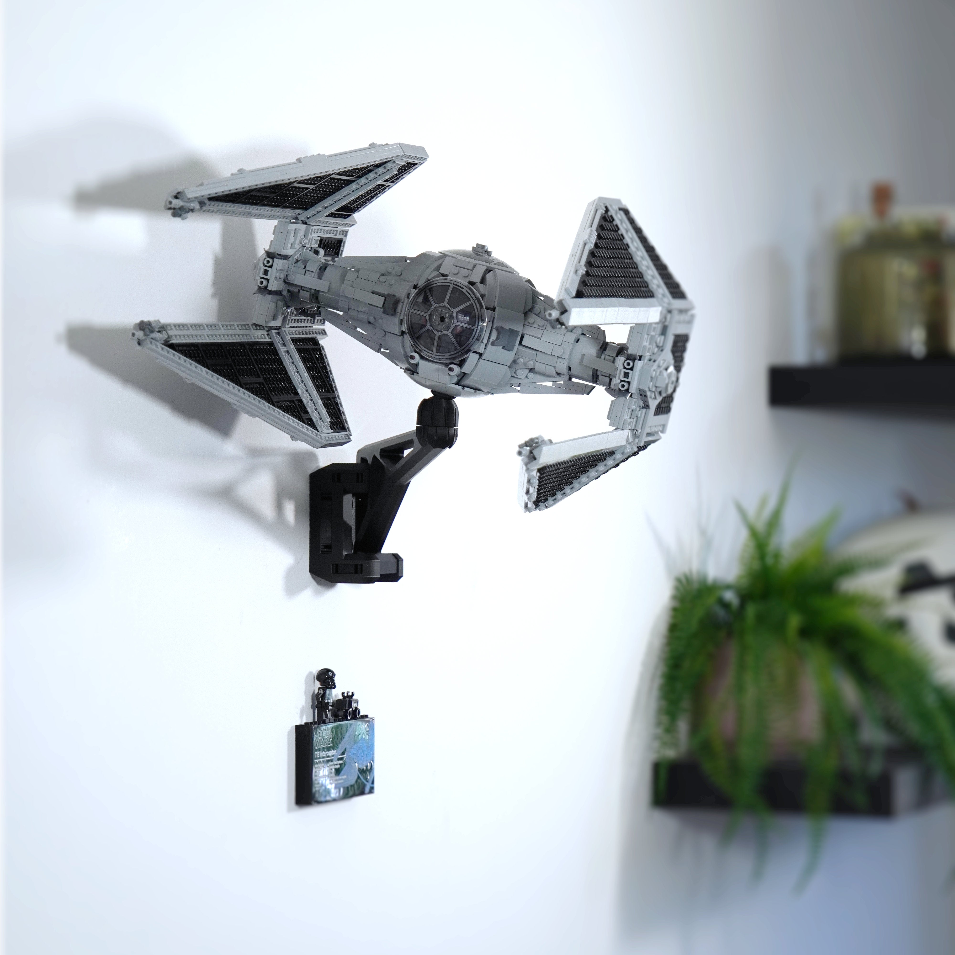 Este soporte de pared ajustable exhibe su Tie Interceptor de la UCS de forma segura y elegante. Cuenta con un brazo giratorio y una rótula que permiten ángulos y posiciones versátiles. La solución también incluye un soporte separado para la placa de información y las minifiguras, asegurando una presentación completa de su colección.