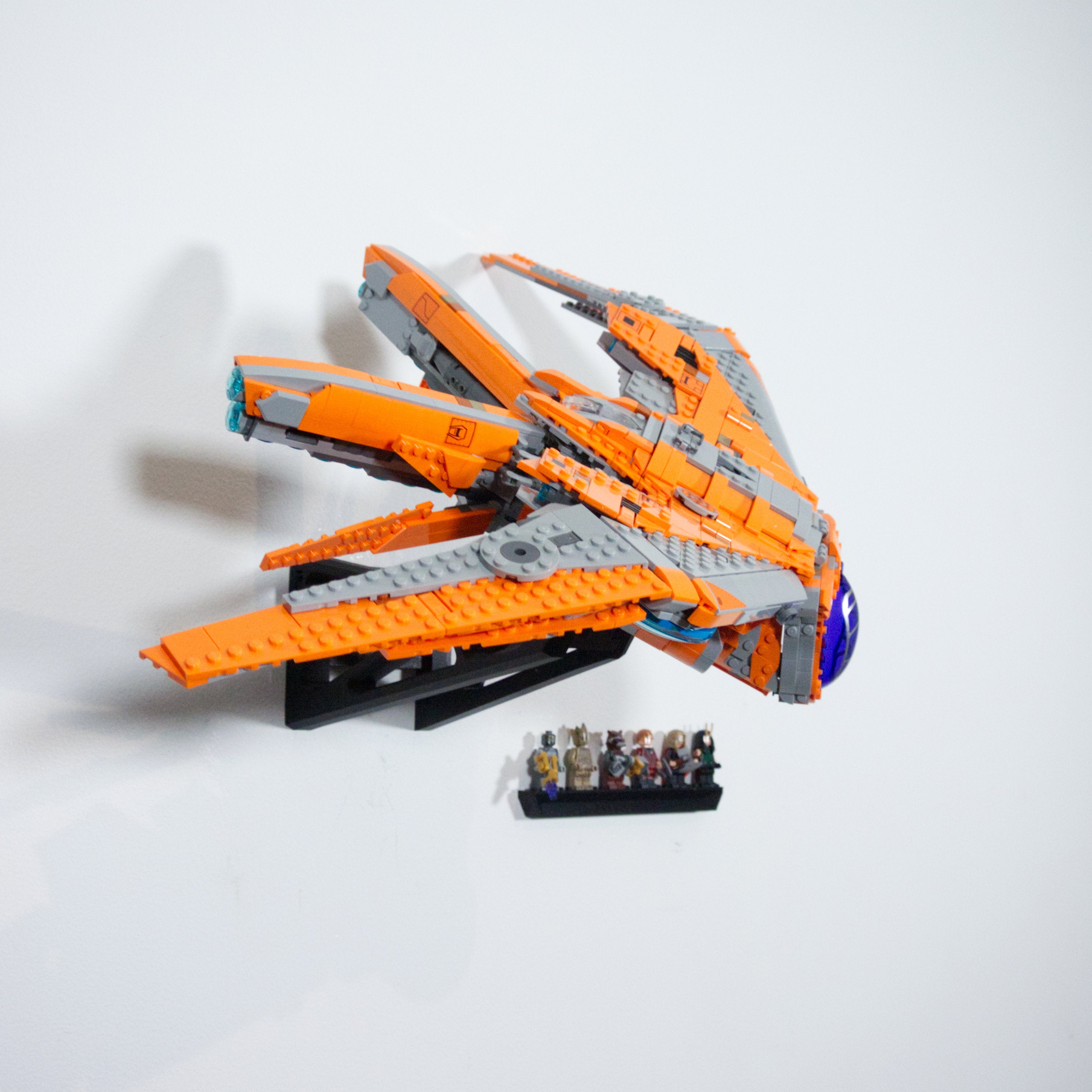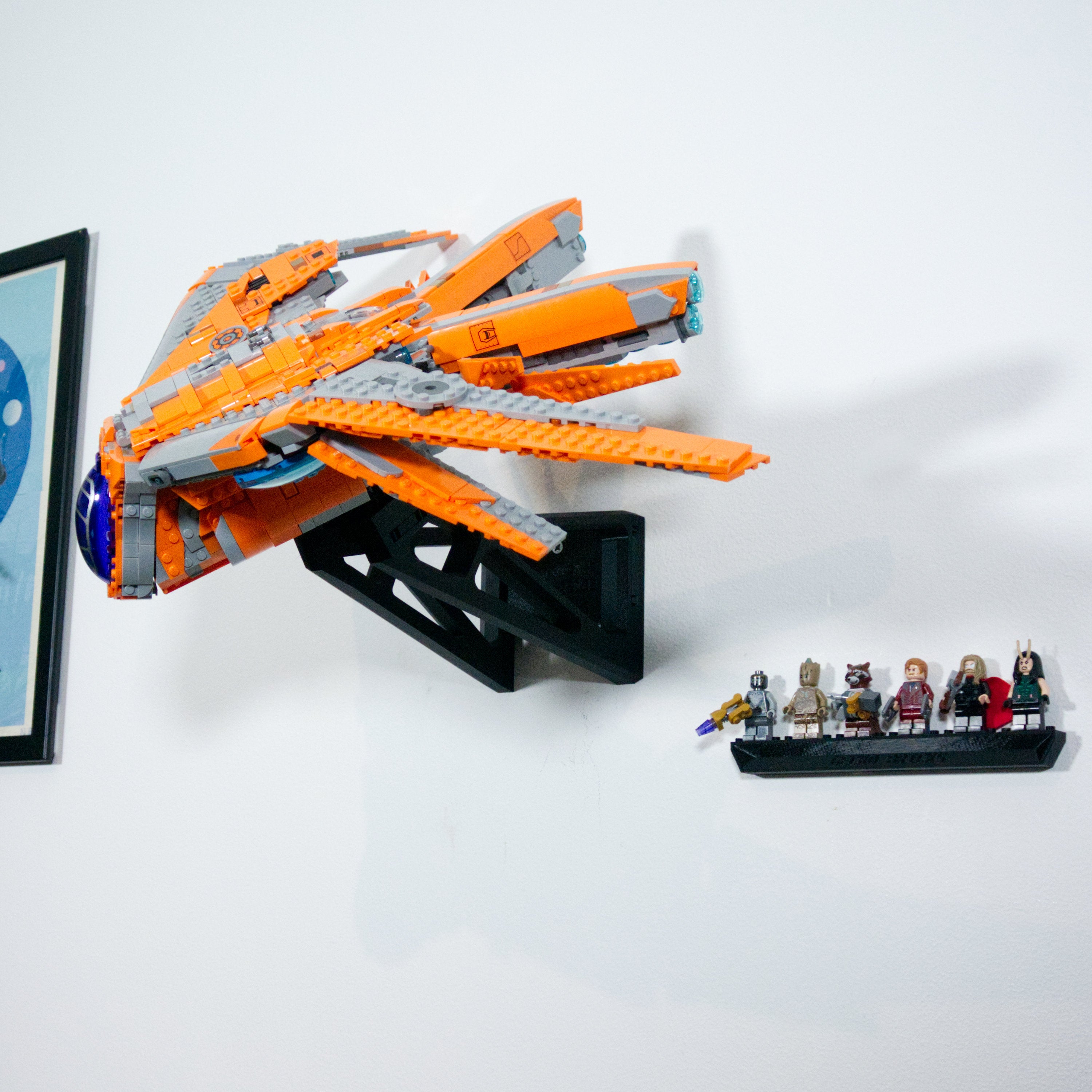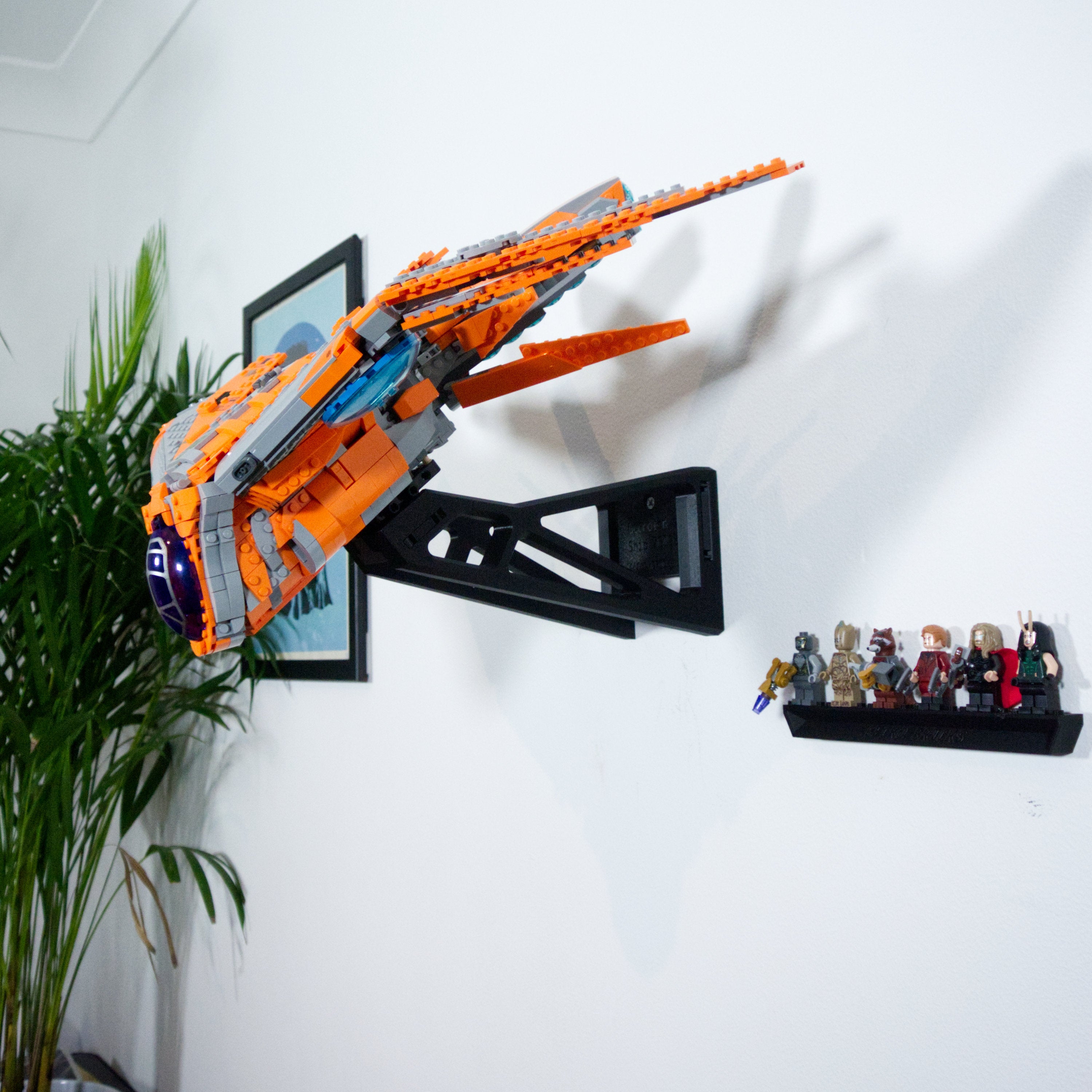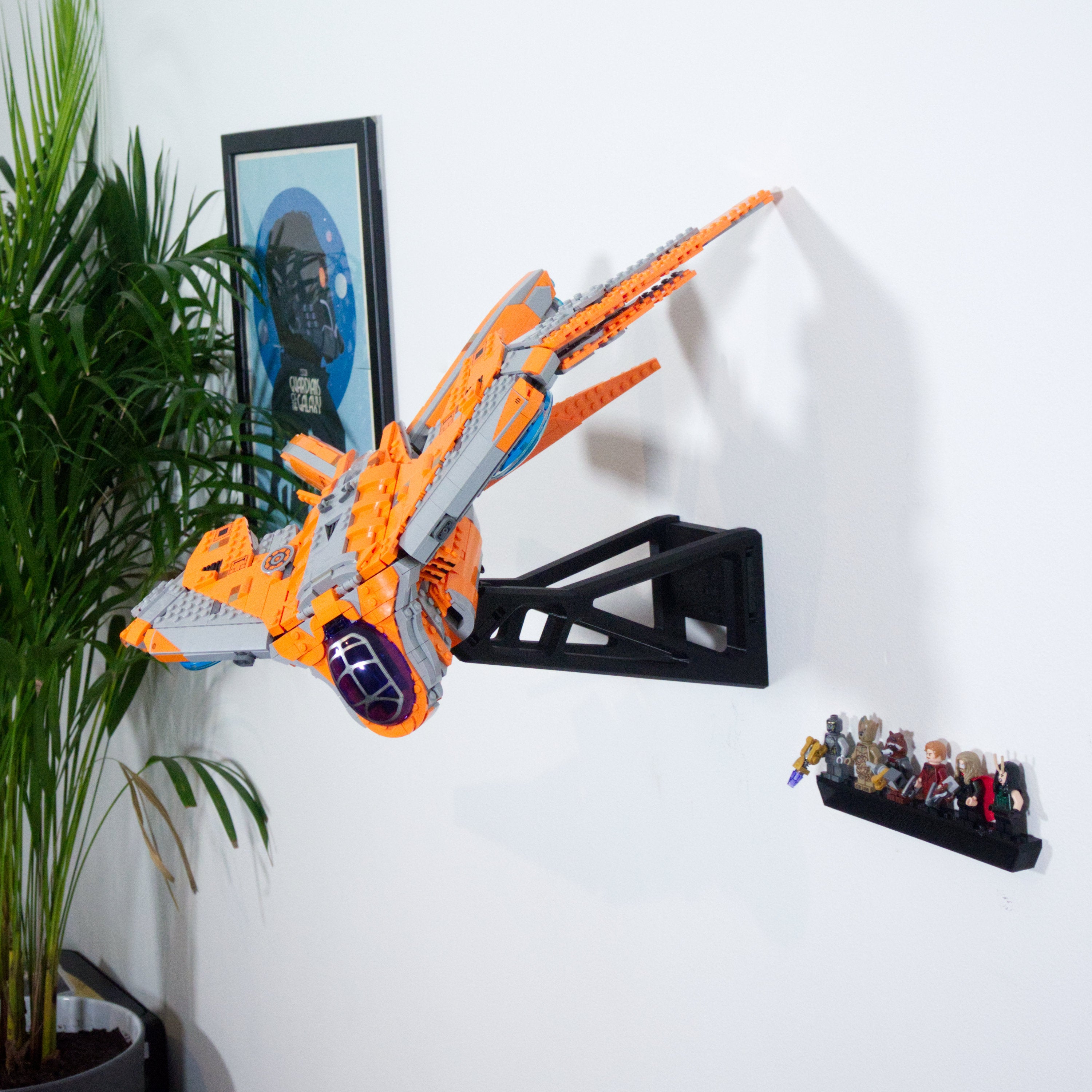 Muestre su nave de Marvel Guardianes de la Galaxia con este soporte de pared flexible. El modelo se puede girar hacia adelante o hacia los lados para obtener el ángulo óptimo. El soporte integra el soporte original para un aspecto limpio e incluye un colgador separado para sus minifiguras que se fija fácilmente sin dañar la pared.
