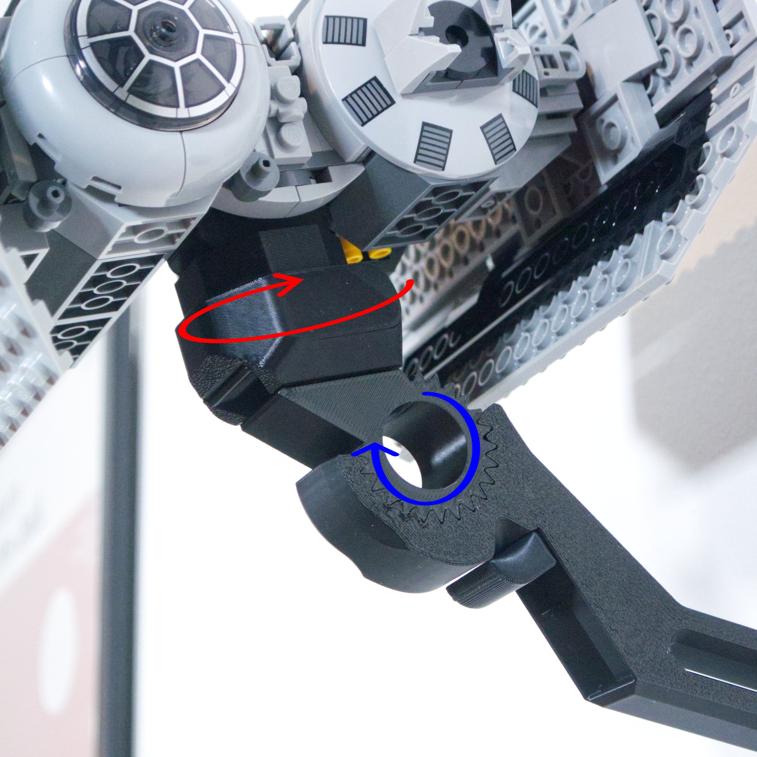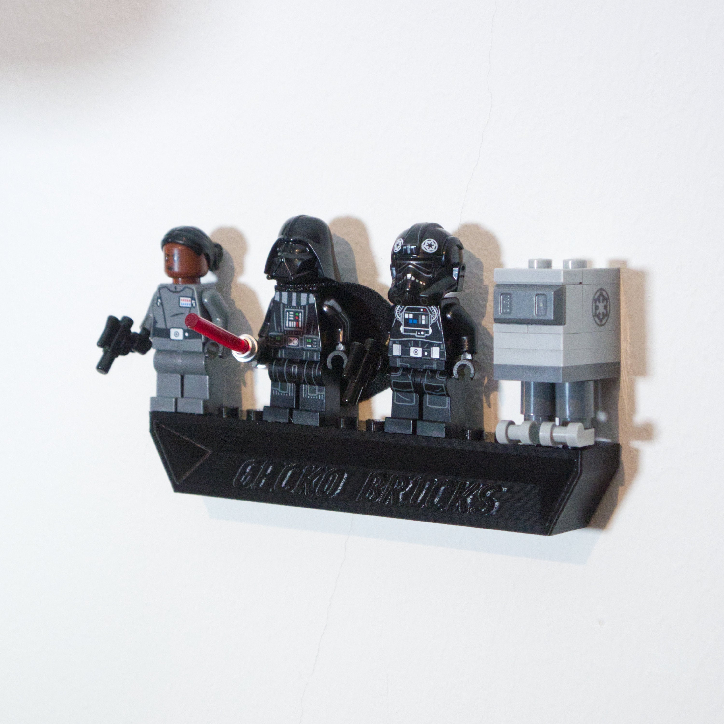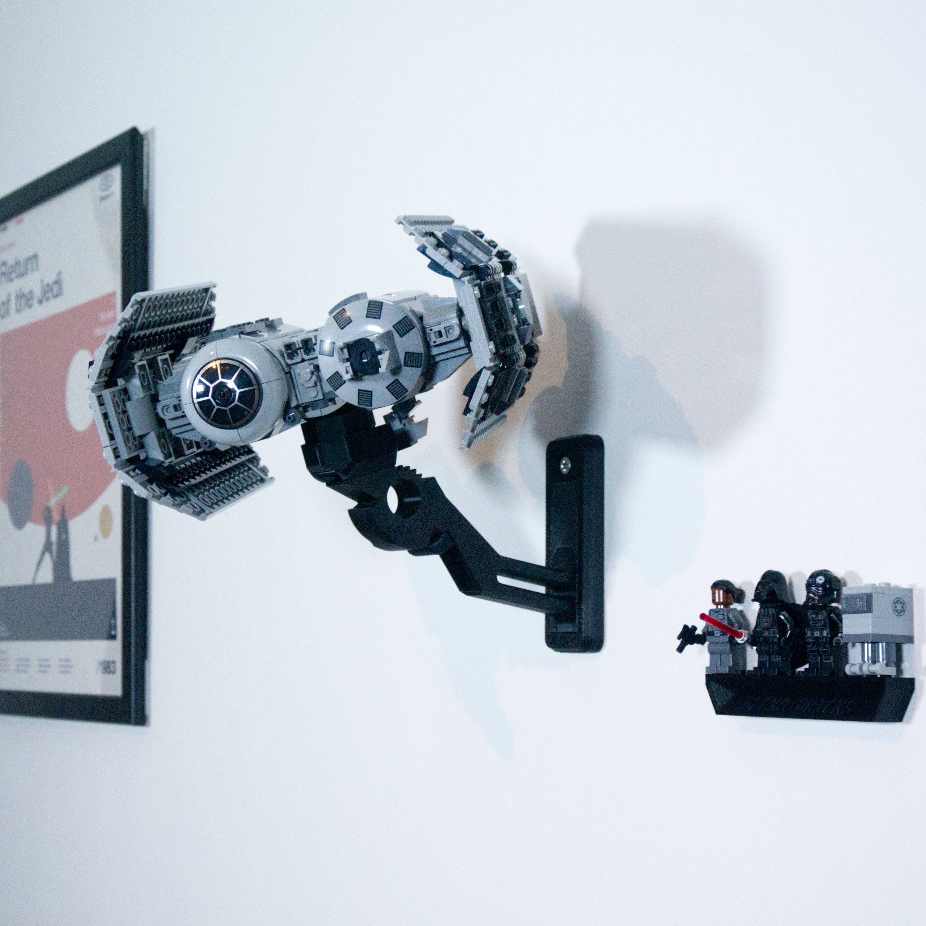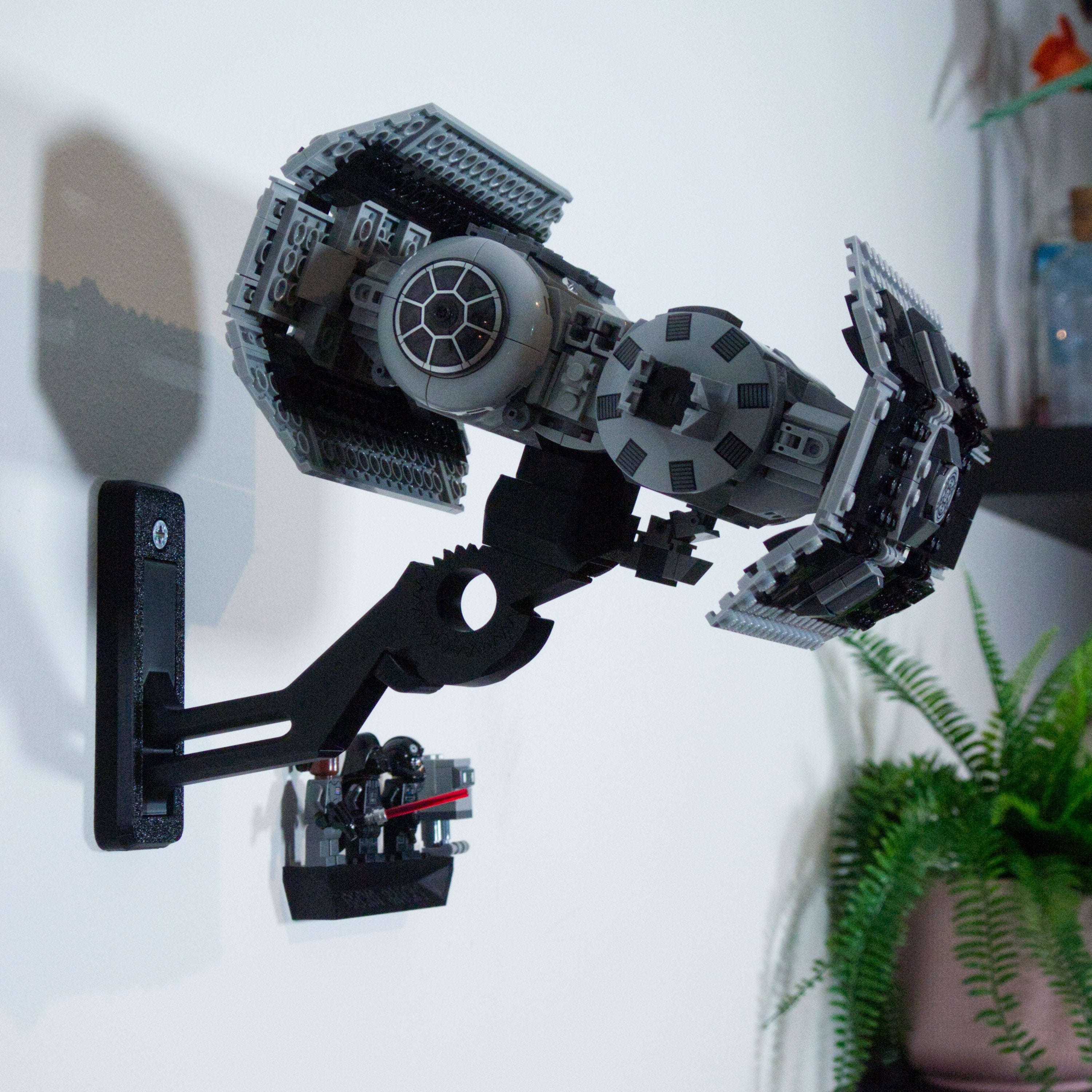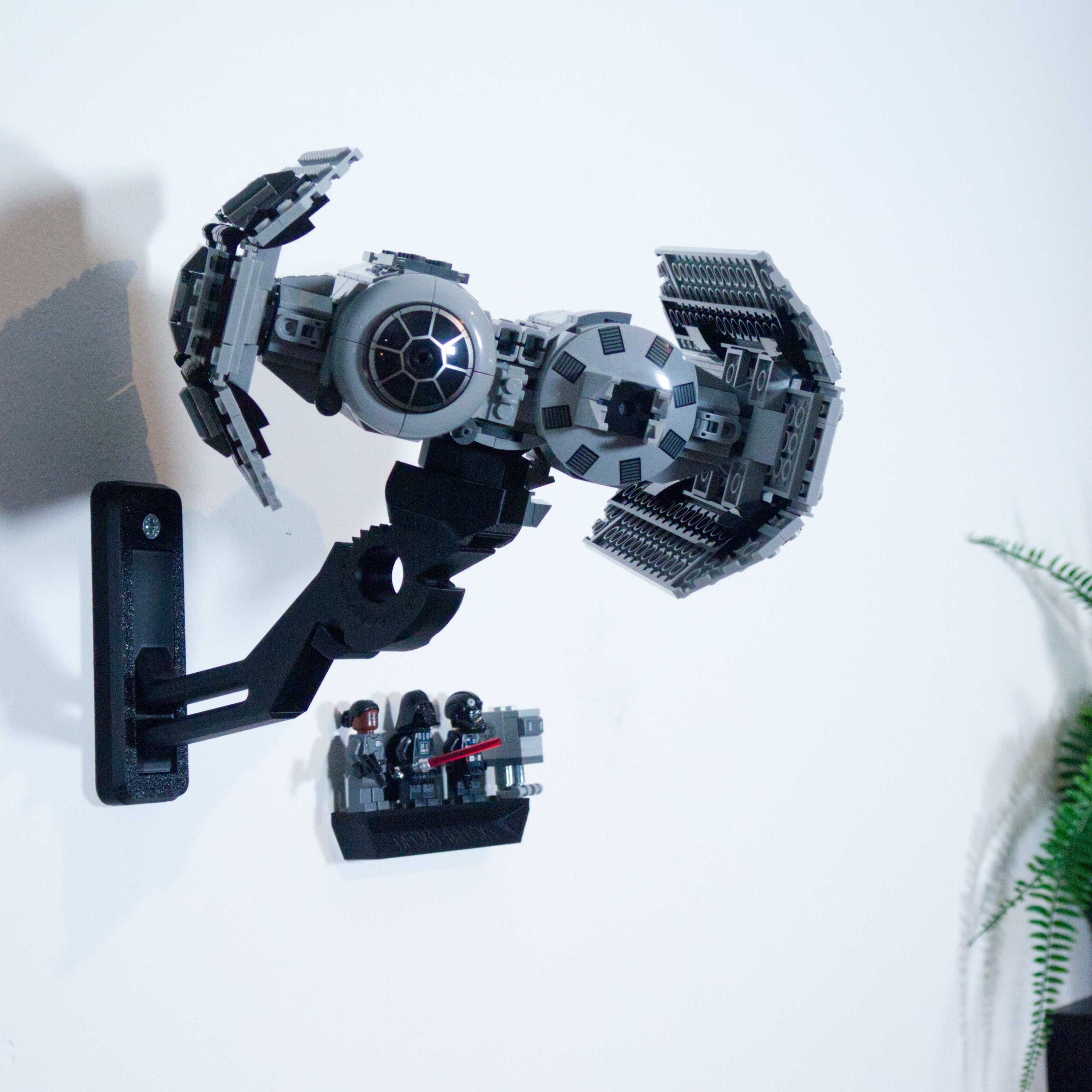 Este soporte de pared para el TIE Bomber Imperial de Star Wars te permite exhibir el modelo en la pared en cinco ángulos diferentes. La construcción permite rotar la nave hacia la derecha y la izquierda o colgarla recta hacia adelante. Se incluye un soporte separado para minifiguras para una presentación completa.