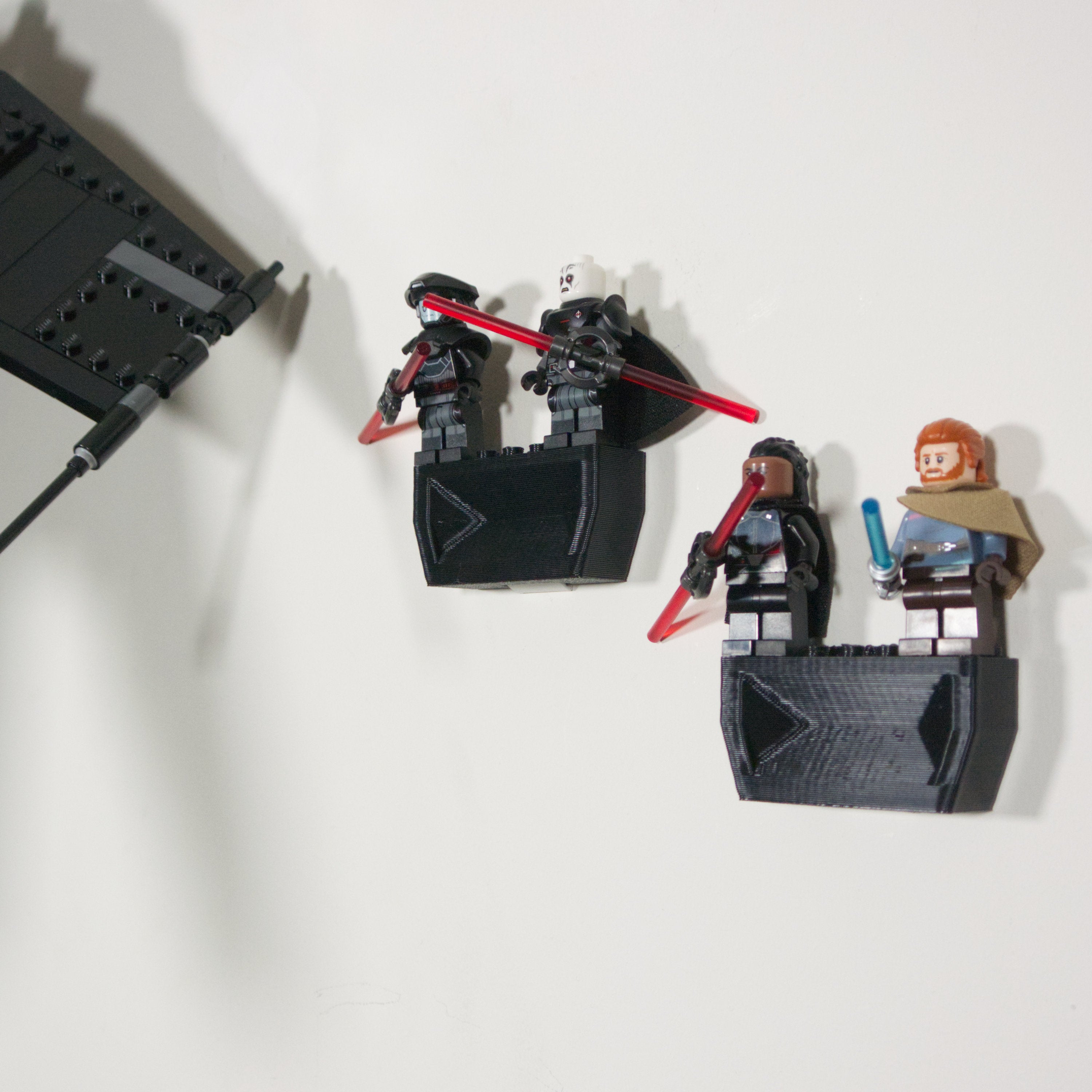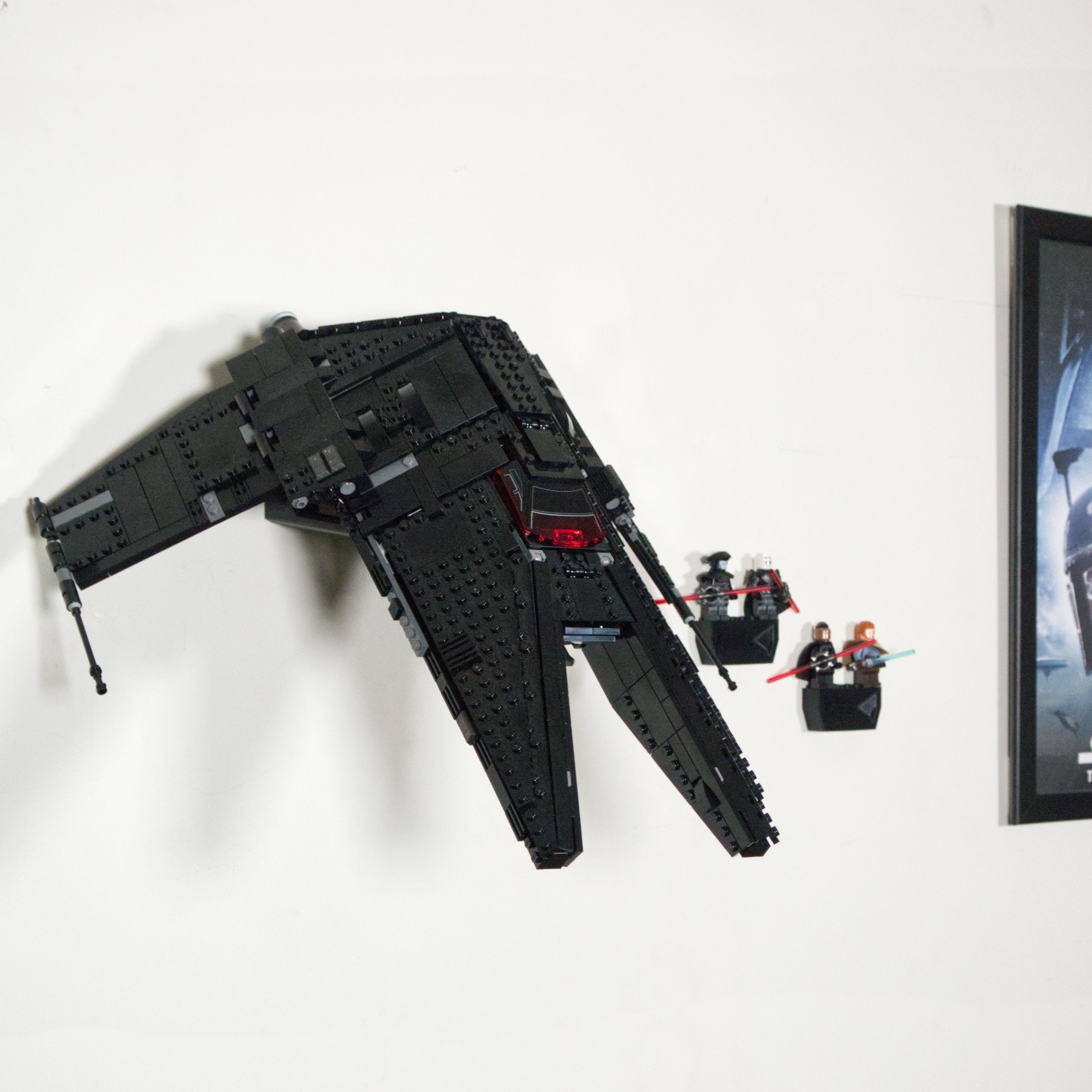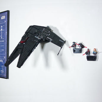 Este soporte de pared le permite exhibir de forma segura su Transporte Inquisidor Scythe de Star Wars en la pared. El modelo cuelga en un ángulo descendente y se puede quitar fácilmente. También se incluyen soportes para todas las minifiguras, para que todo el set se pueda exhibir junto de una manera elegante.