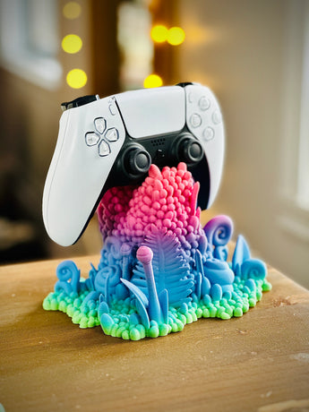 Este soporte para mandos ofrece una solución encantadora y práctica para guardar tus gamepads. El diseño único de bosque funciona como una adición decorativa a tu configuración de juego. El soporte es compatible con mandos de PS5, Xbox Series y Nintendo Switch Pro, y asegura que tus mandos se mantengan seguros y organizados.