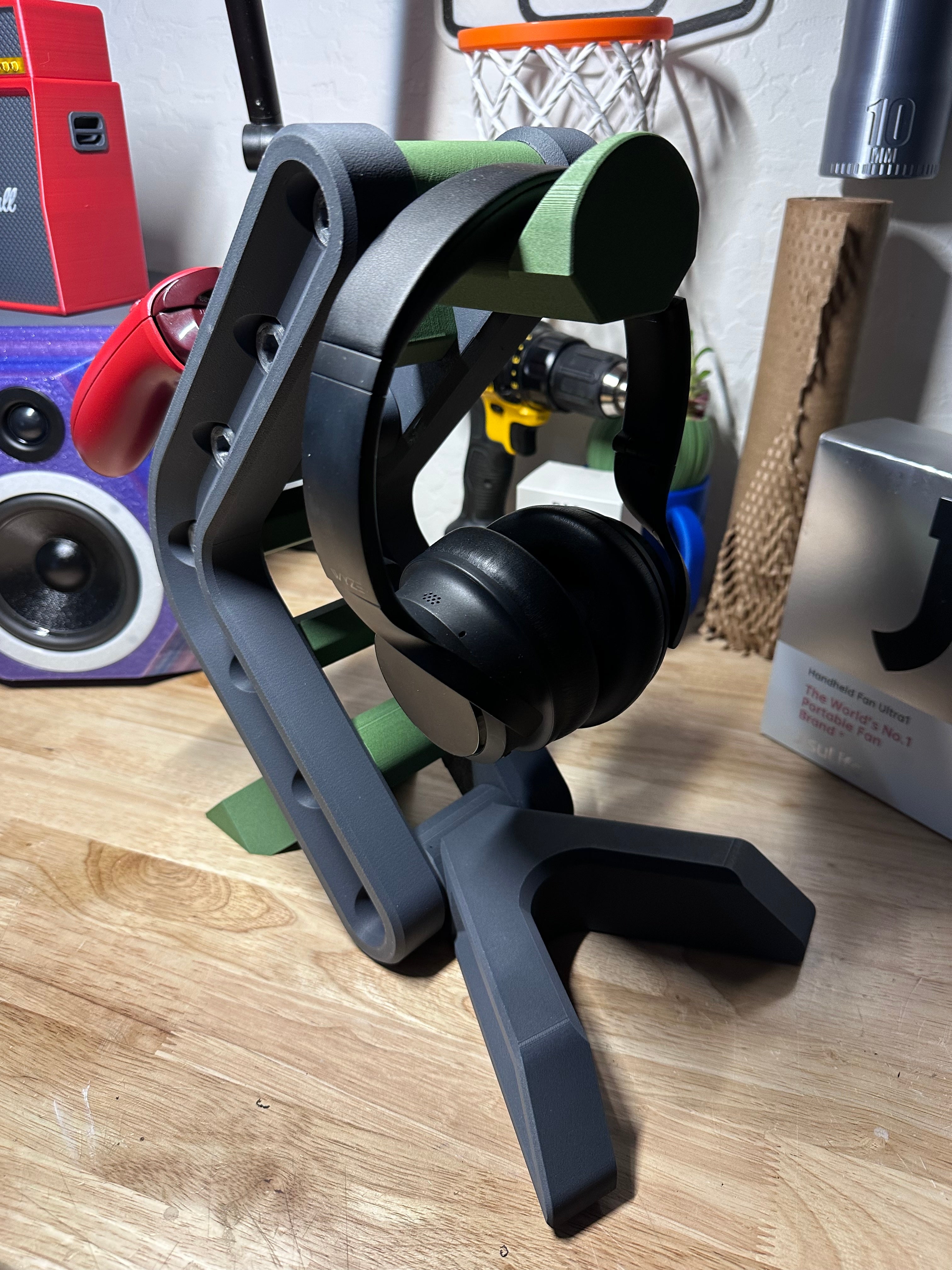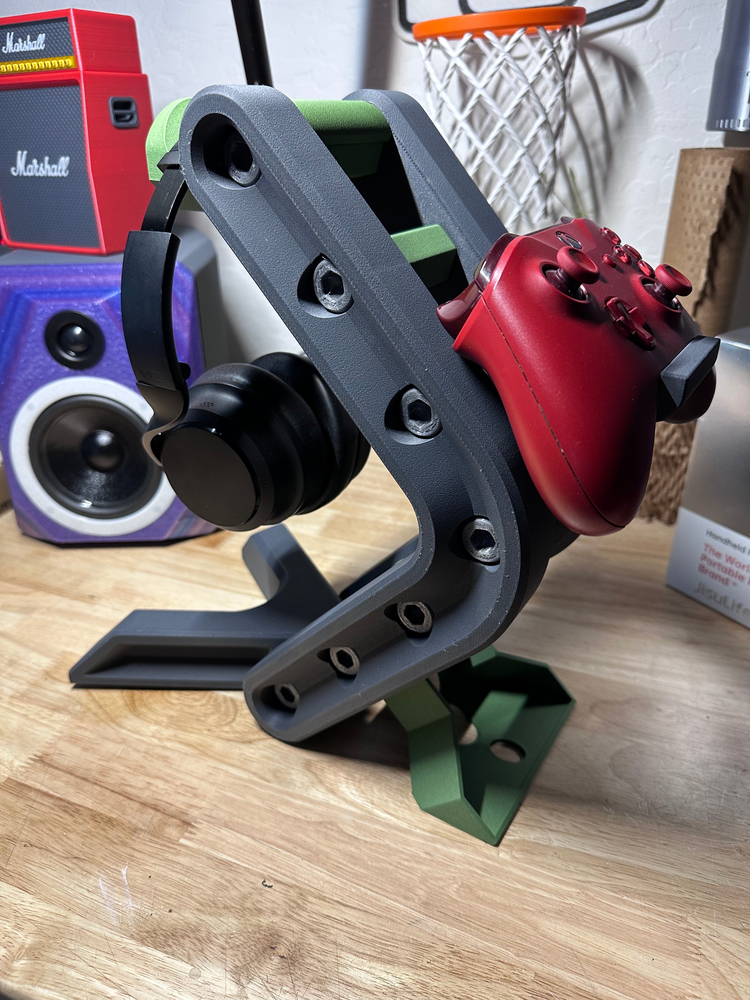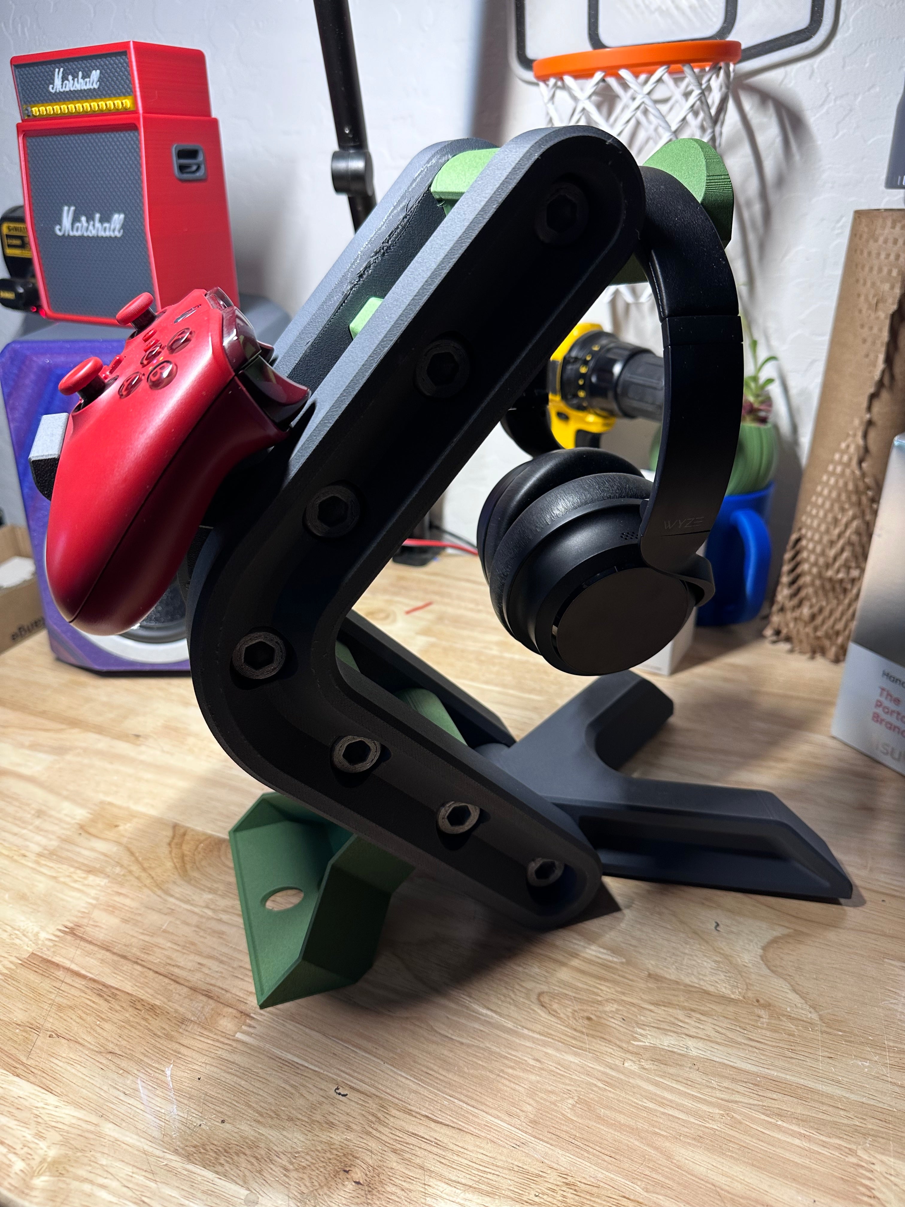 El soporte para auriculares está diseñado para acomodar varios auriculares, para que pueda colgar fácilmente toda su colección. Además, el diseño incluye un práctico soporte para controlador, que se puede ampliar agregando más dispositivos según sea necesario. Esto lo convierte en una solución versátil que se puede adaptar a su configuración específica y mantener su área ordenada.