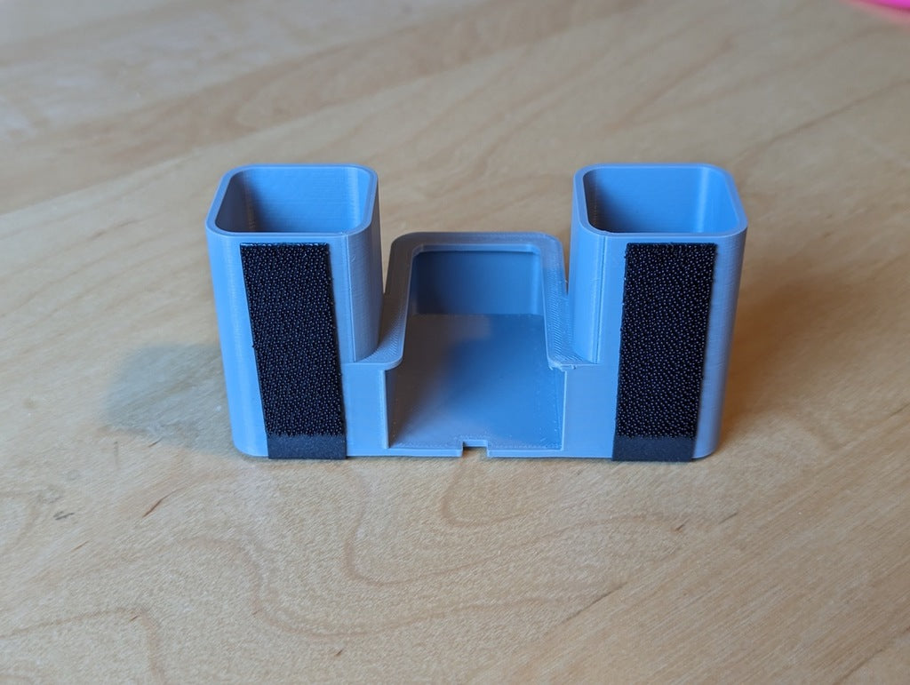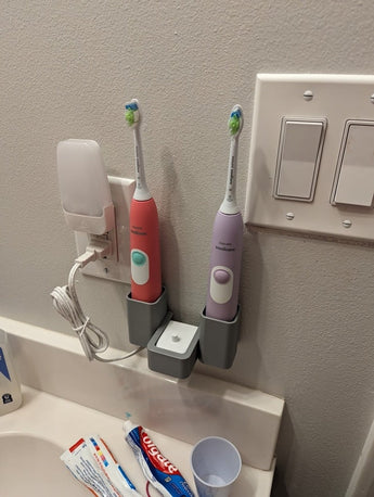 Este funcional soporte está diseñado para organizar eficazmente sus cepillos de dientes y cargadores Philips Sonicare. Proporciona espacio para dos cepillos de dientes, así como un espacio dedicado para su cargador en el centro. La abertura del cargador garantiza una sujeción firme sin movimiento, por lo que su cargador siempre está colocado de forma estable. Un corte inteligente en la parte posterior permite que el cable se aleje discretamente, lo que contribuye a un baño ordenado. Con unas dimensiones interiores de 32,5 mm x 32,5 mm, el soporte se adapta a una amplia gama de modelos Philips Sonicare, incluidos los HX6250 y HX686W, lo que lo convierte en una opción versátil para sus accesorios Philips. Puede optar por montar el soporte en la pared con tiras adhesivas de doble cara para ahorrar espacio o simplemente colocarlo de forma estable sobre una encimera, ya que tiene una base plana y equilibrada. Esta solución ayuda a mantener sus cargadores y cepillos de dientes Philips Sonicare juntos y de fácil acceso.
