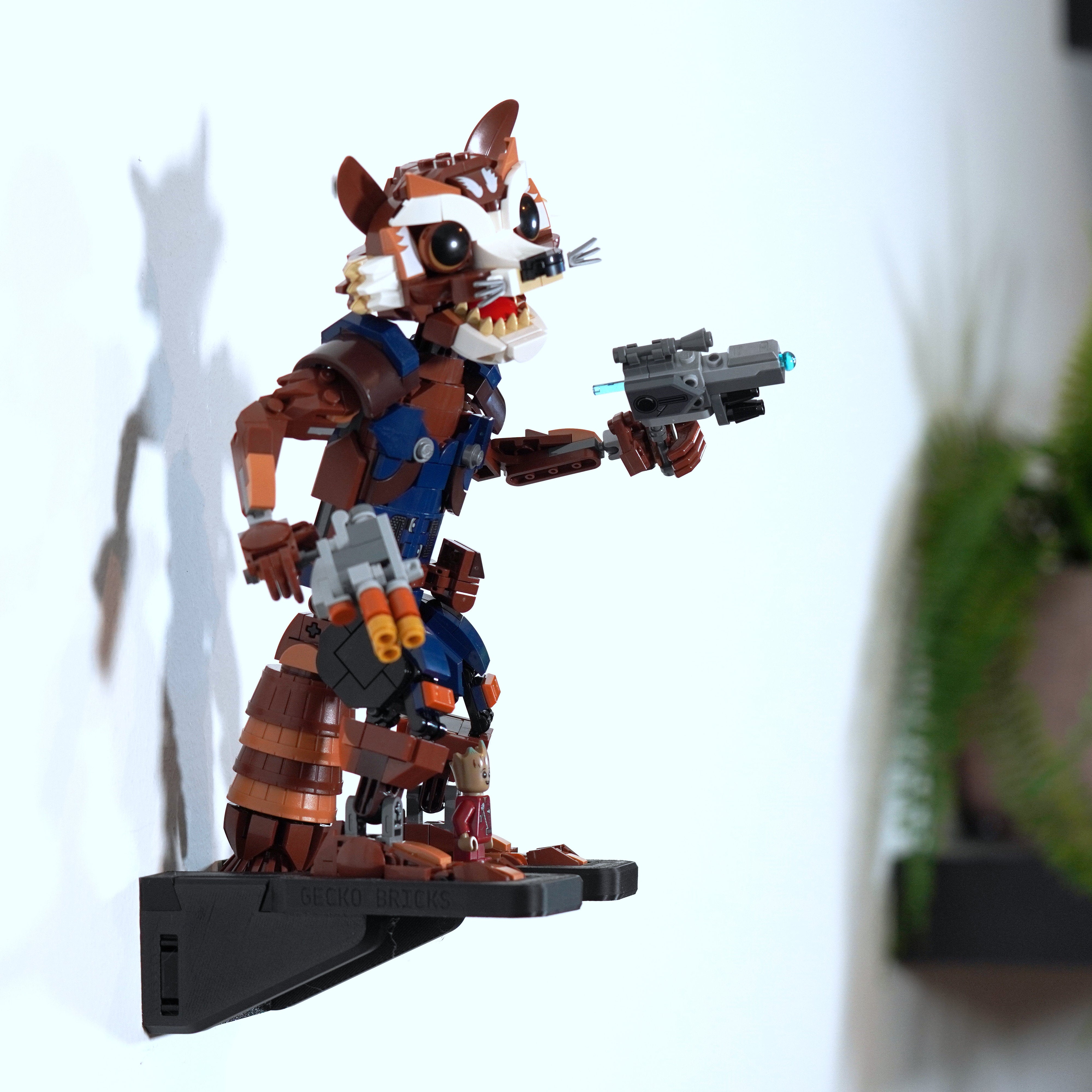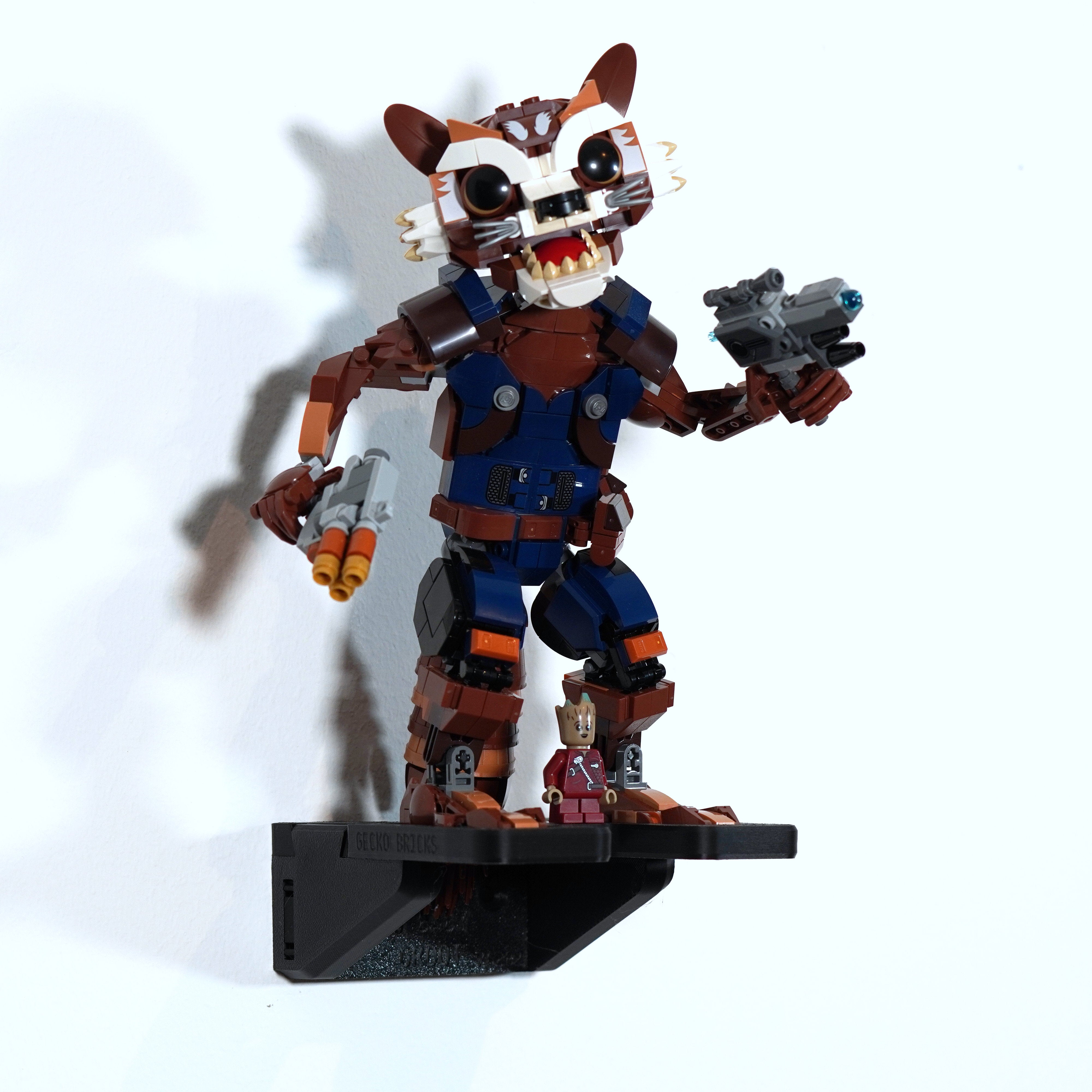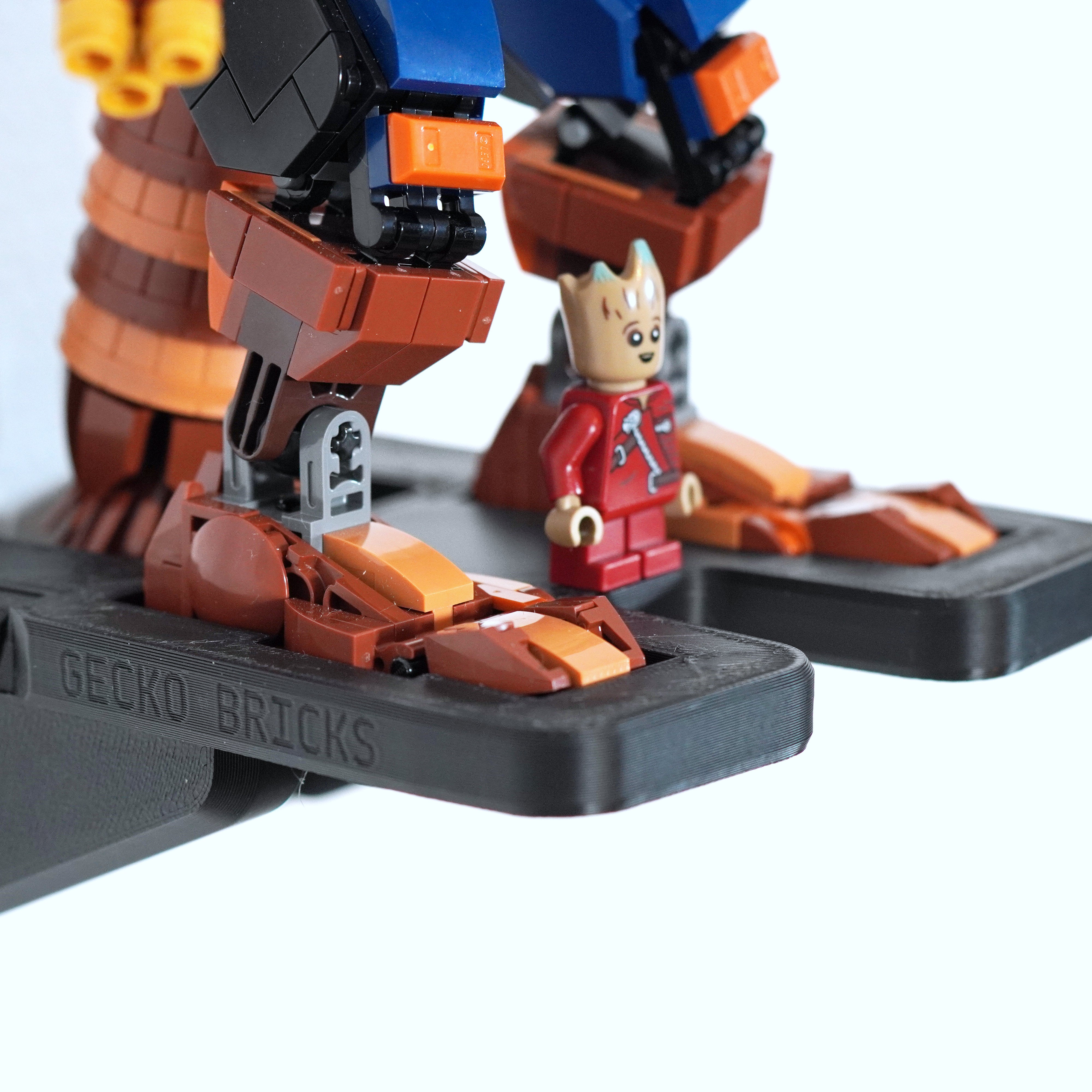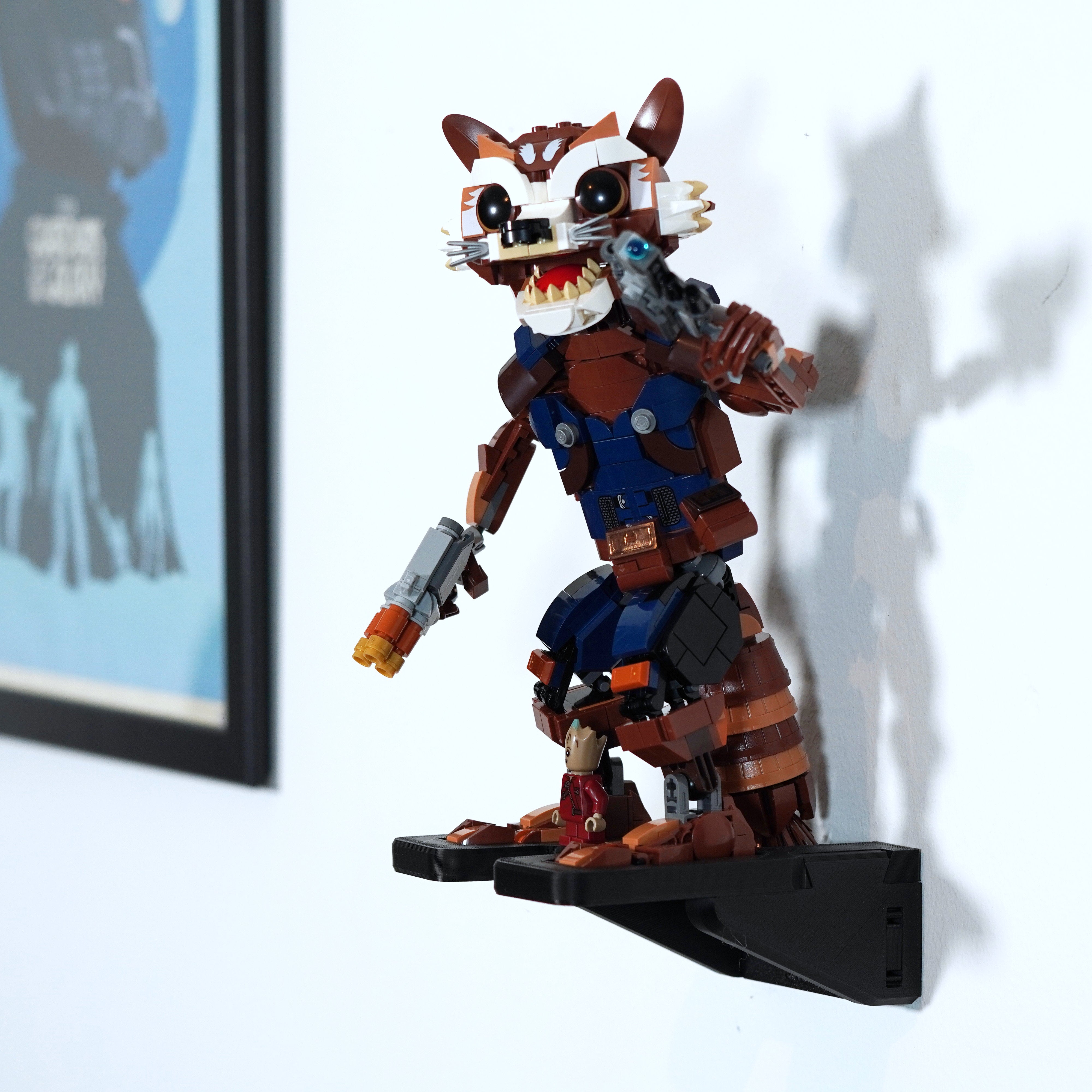 - Soporte de pared de diseio especial para el set 76282 de Marvel Rocket y Baby Groot.