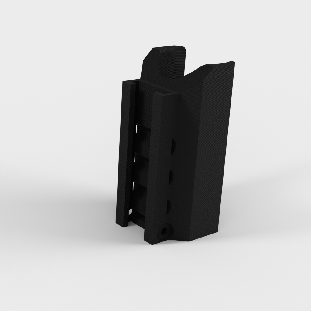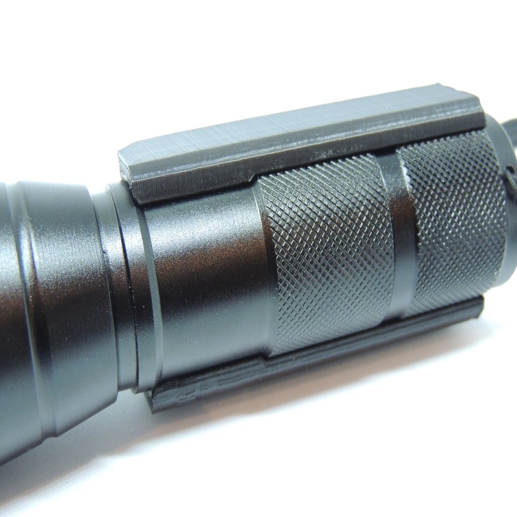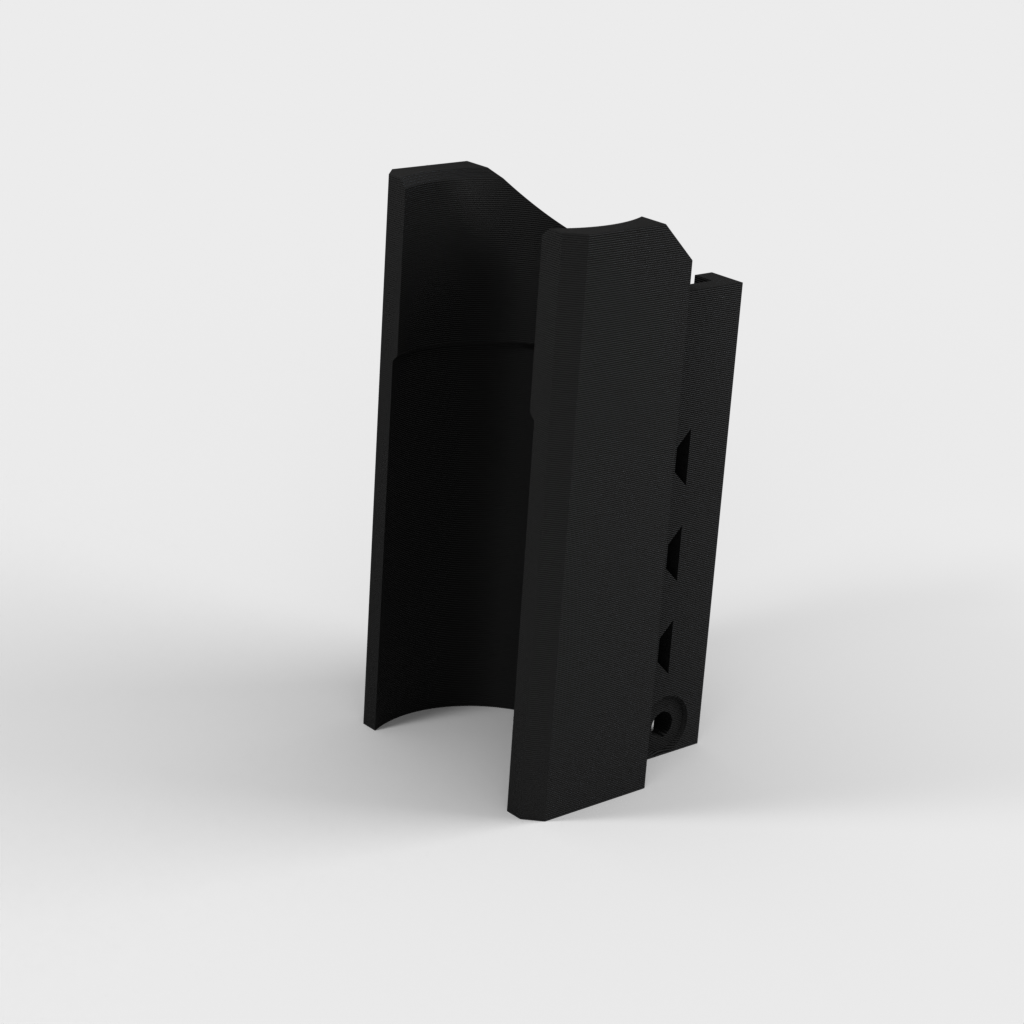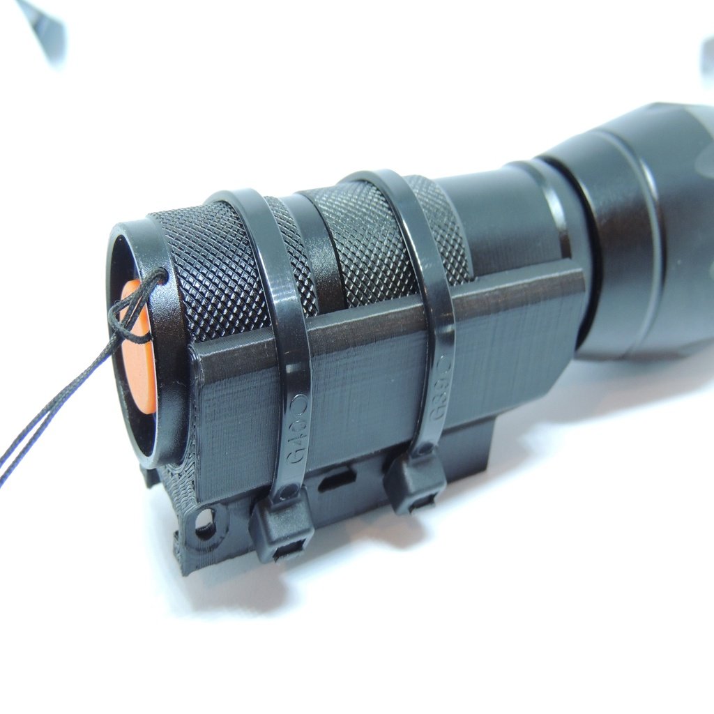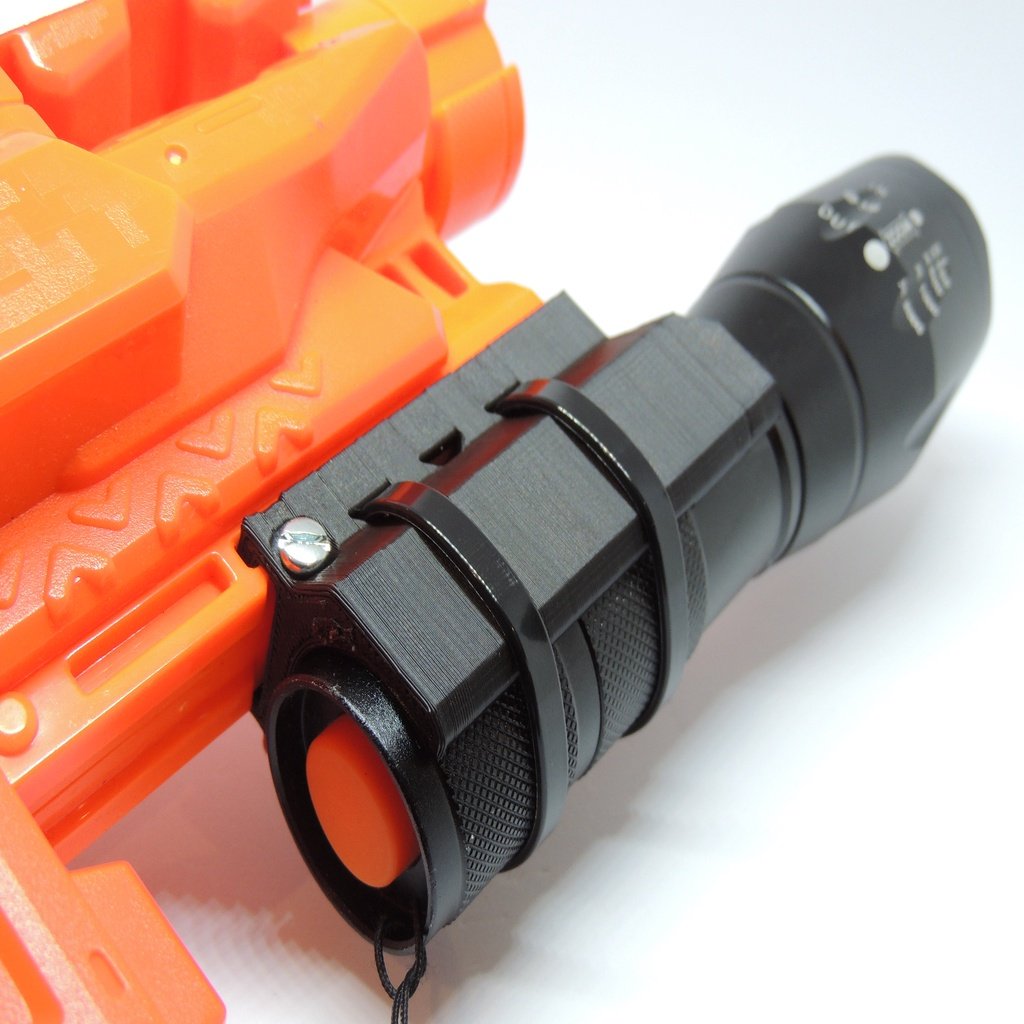 Este es un soporte táctico para linterna para Nerf Elite Rails. Diseñado para las linternas LED zoomables de 2000 lúmenes que puedes encontrar en Amazon. Las piezas necesarias son: 2 o 3 bridas para cables, un perno de tornillo M3 de 25 mm de largo, tuerca M3, una linterna y una pistola Nerf. Los orificios llevan un perno M3 a través de ellos y están diseñados para encajar en los huecos del Nerf Rail. Esto evita que el archivo adjunto se caiga. Los 3 orificios en el lateral son para bridas para mantener la linterna en su lugar. Esto está diseñado para imprimir sin soporte en posición vertical, lo que también permite la mayor resistencia para sostener la linterna. Ten en cuenta que esto solo funciona con Elite Rails y solo se ha probado en una Stryfe.