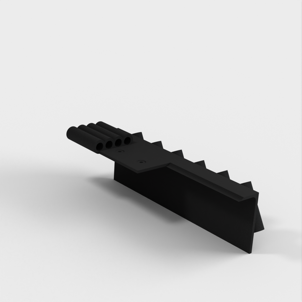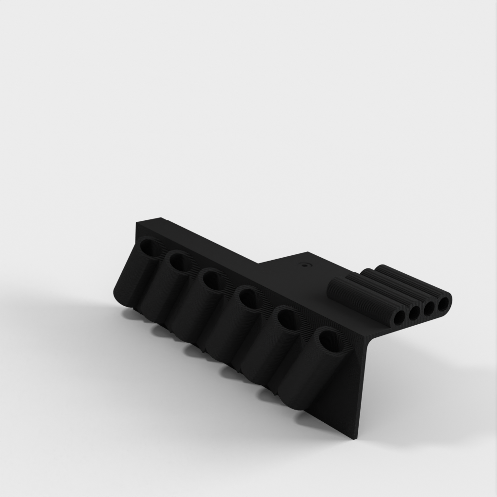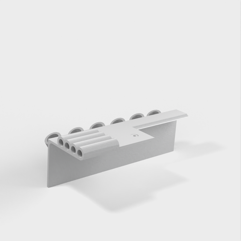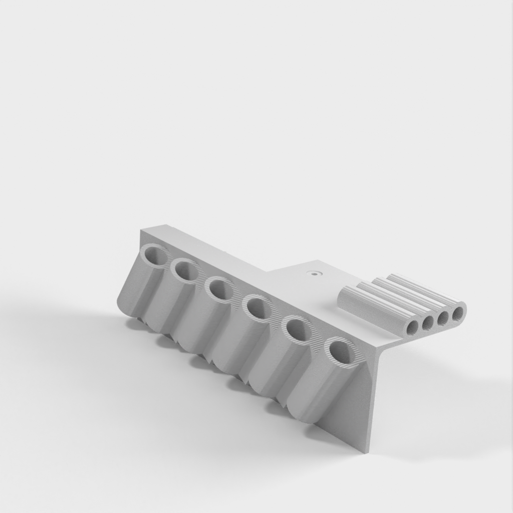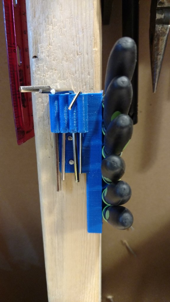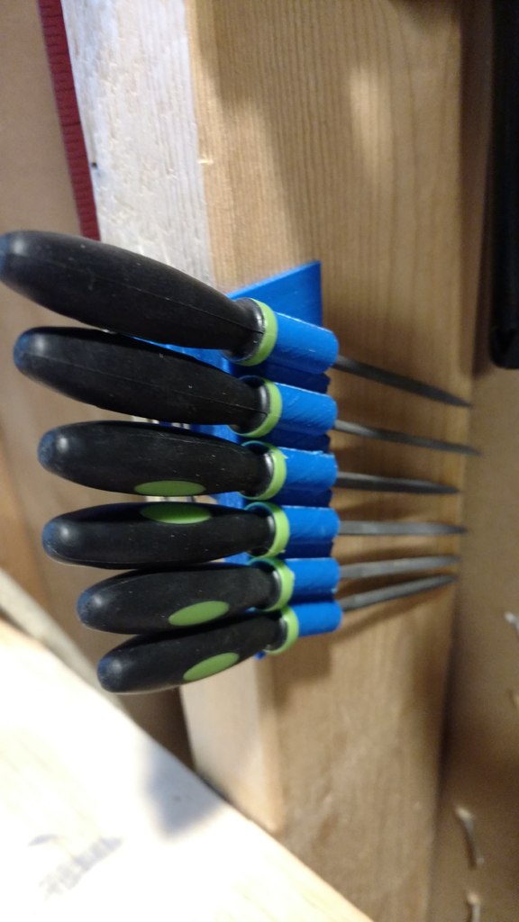 Soporte para herramientas de montaje en taco diseñado para limas de aguja de 6 piezas (como estas: http://a.co/iLnJ8kb) o herramientas similares, así como 4 llaves hexagonales/ Allen, como las que se incluyen con la impresora 3D Anet A8. Seis ranuras en ángulo y separadas entre sí para evitar que los mangos de las herramientas choquen. Dos orificios para clavos empotrados para el montaje en un montante de pared.
