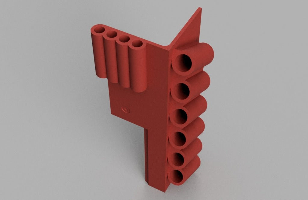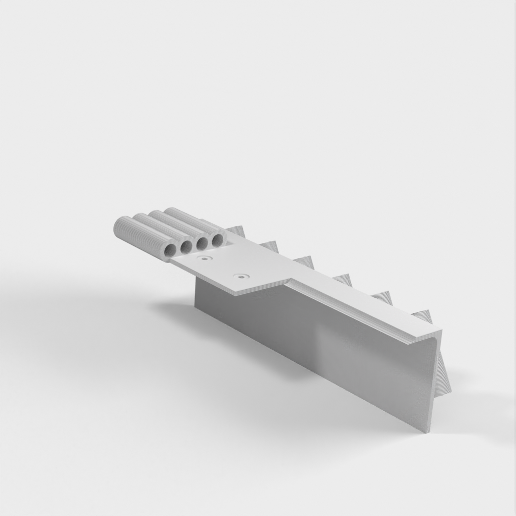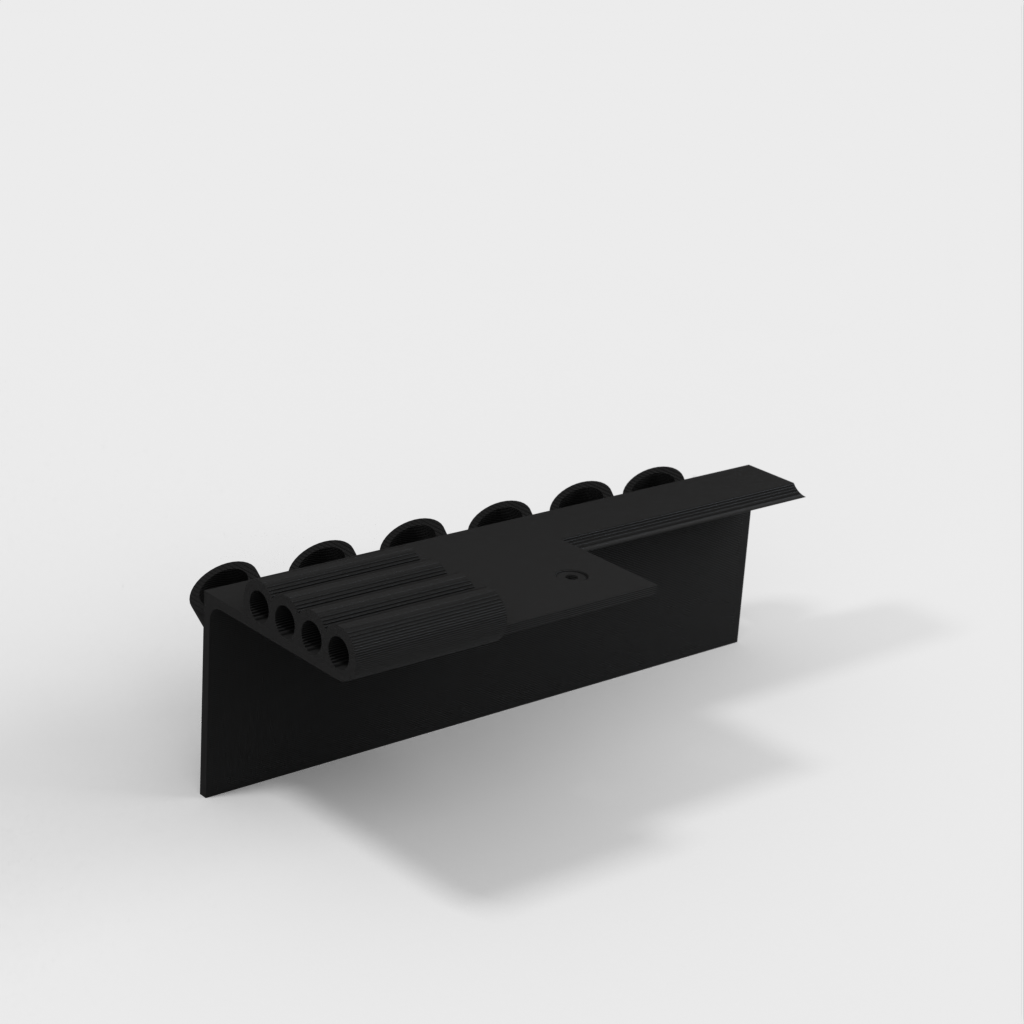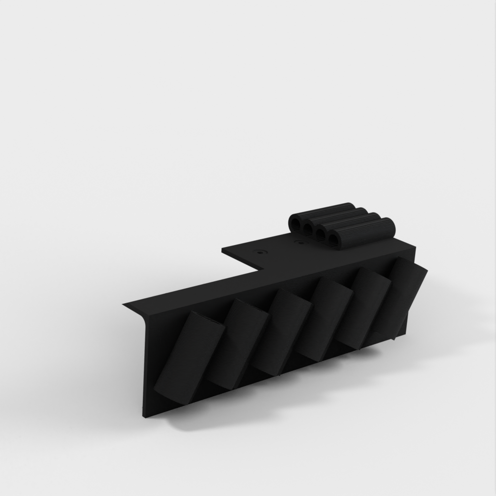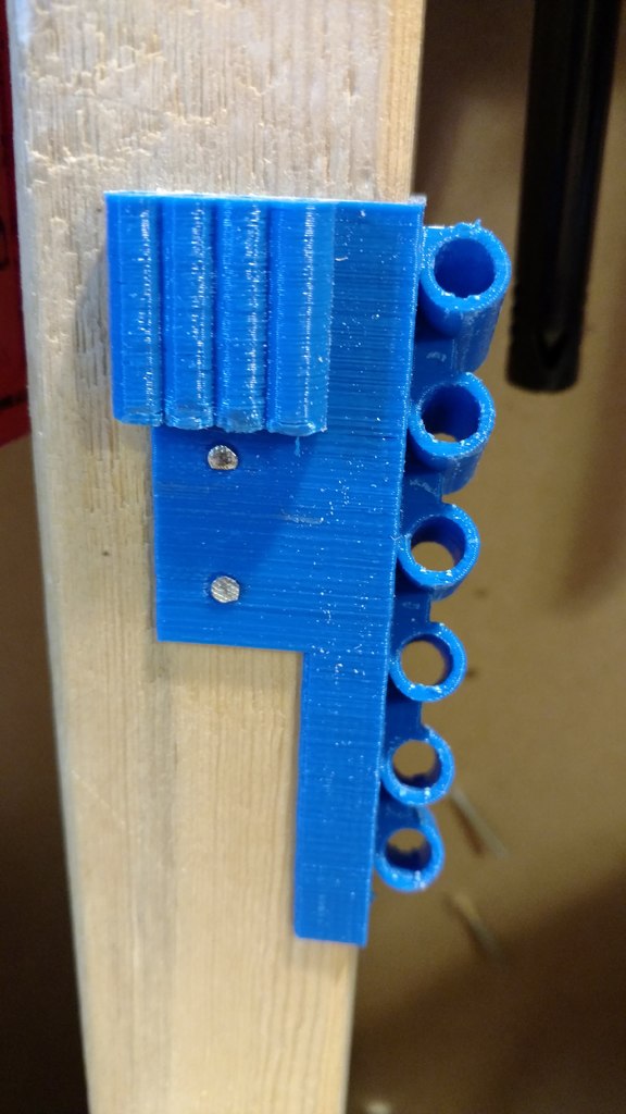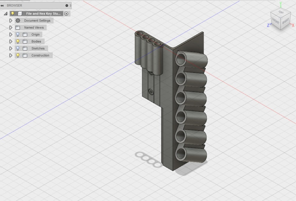 Soporte para herramientas de montaje en taco diseñado para limas de aguja de 6 piezas (como estas: http://a.co/iLnJ8kb) o herramientas similares, así como 4 llaves hexagonales/ Allen, como las que se incluyen con la impresora 3D Anet A8. Seis ranuras en ángulo y separadas entre sí para evitar que los mangos de las herramientas choquen. Dos orificios para clavos empotrados para el montaje en un montante de pared.