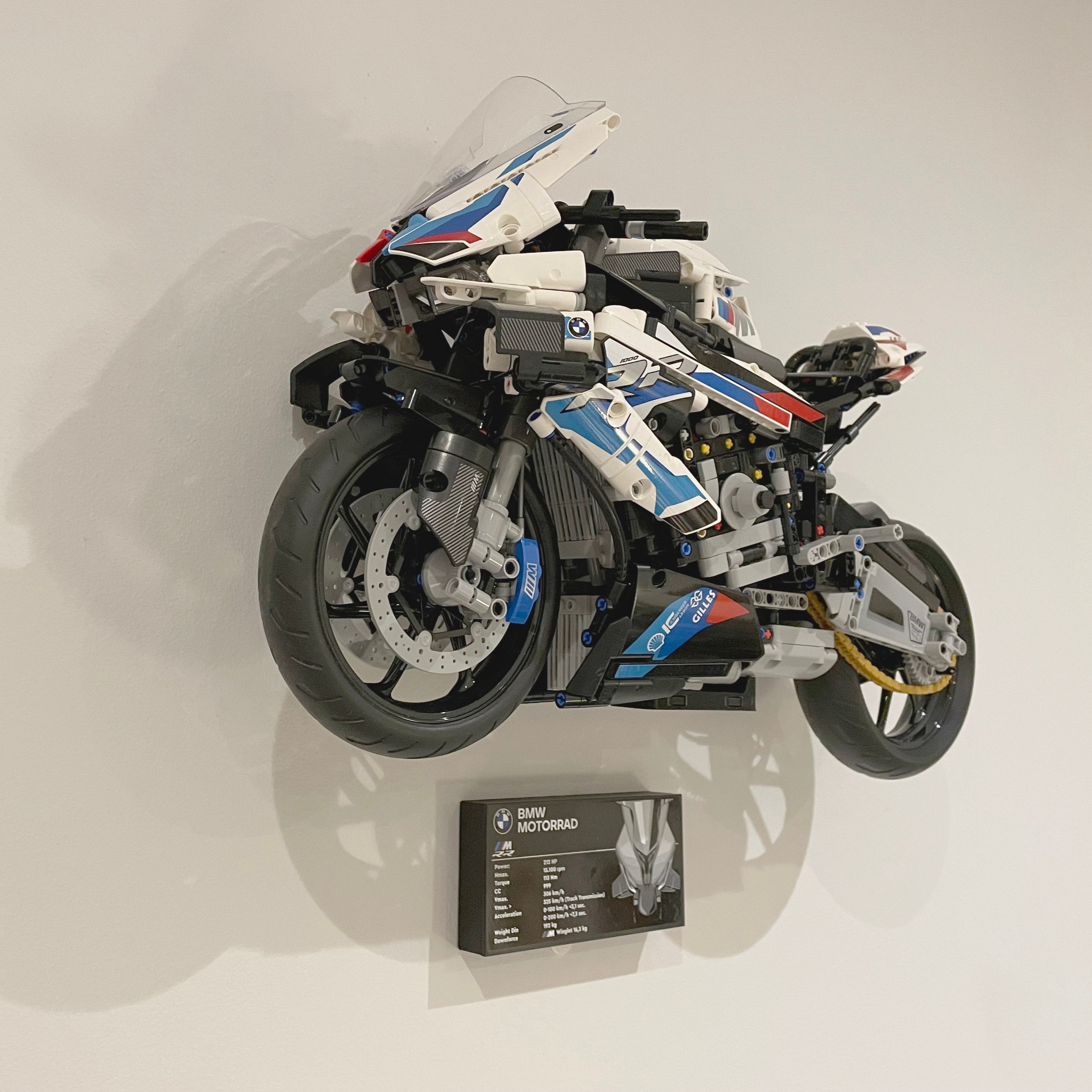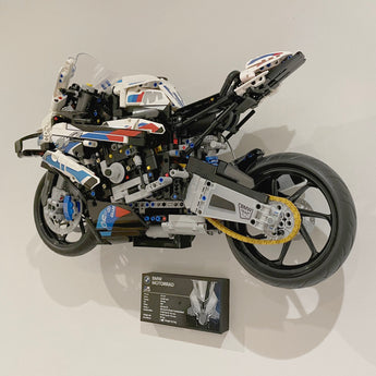Este soporte de pared le permite exhibir elegantemente su BMW M 1000RR 42130 en la pared. Se conecta de forma segura al modelo a través de los pasadores technic originales y solo requiere un tornillo para su montaje. También se incluye un soporte separado para la placa de información para una presentación completa.