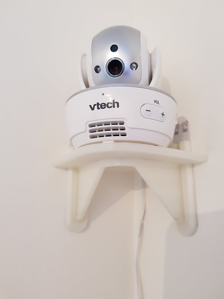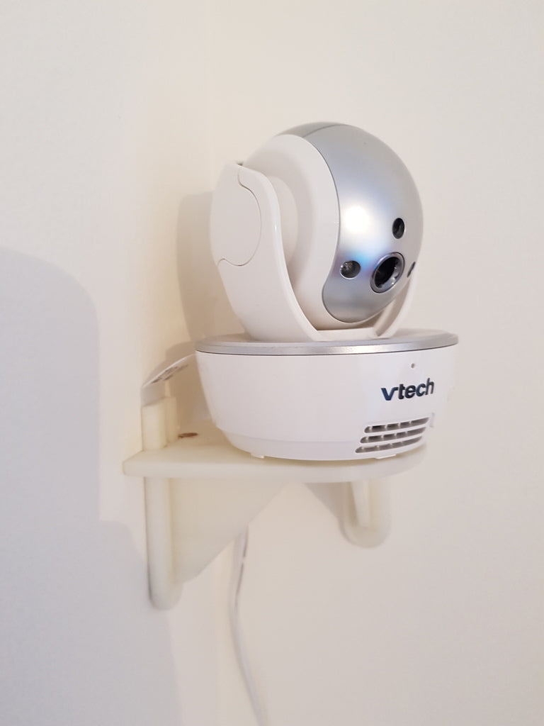 Este soporte para cámara está diseñado para brindar una ubicación estable y segura para la cámara de su monitor para bebés VTech. Está desarrollado específicamente para montarse discretamente en una esquina de la habitación, lo que ayuda a lograr un ángulo de visión óptimo para monitorear al bebé. La instalación es sencilla; el soporte se fija fácilmente a la pared mediante tiras adhesivas 3M. Esto proporciona una configuración confiable sin ocupar espacio en el piso ni requerir soportes permanentes, lo que la convierte en una solución práctica para los padres que desean una forma eficiente y que ahorre espacio para vigilar a su bebé.
